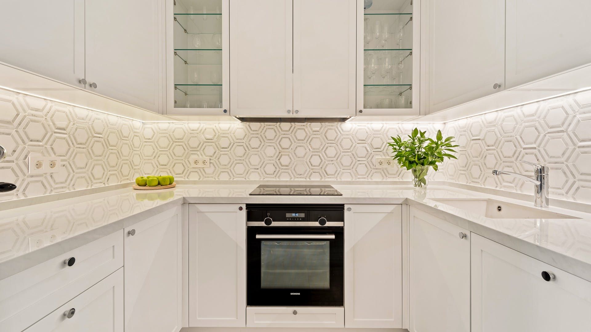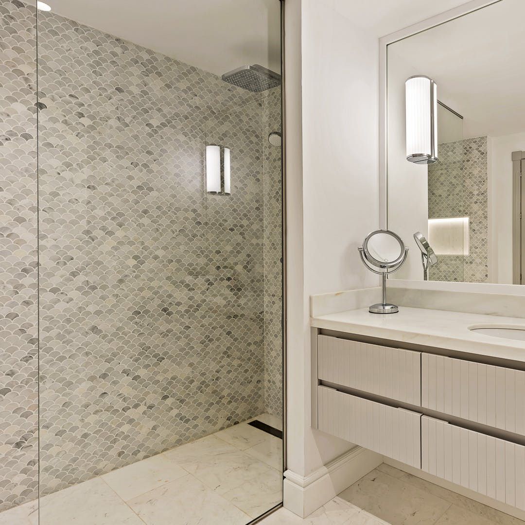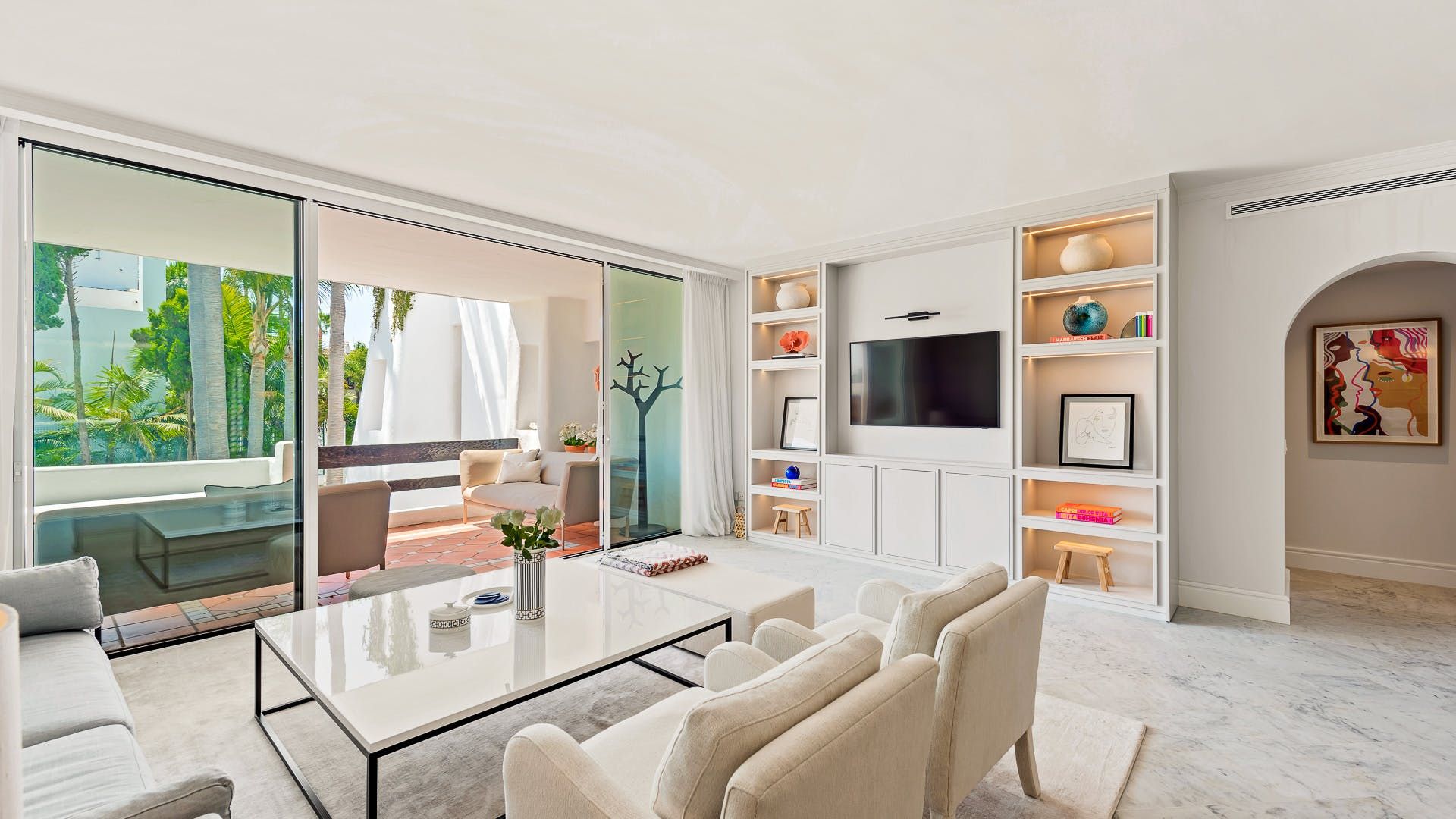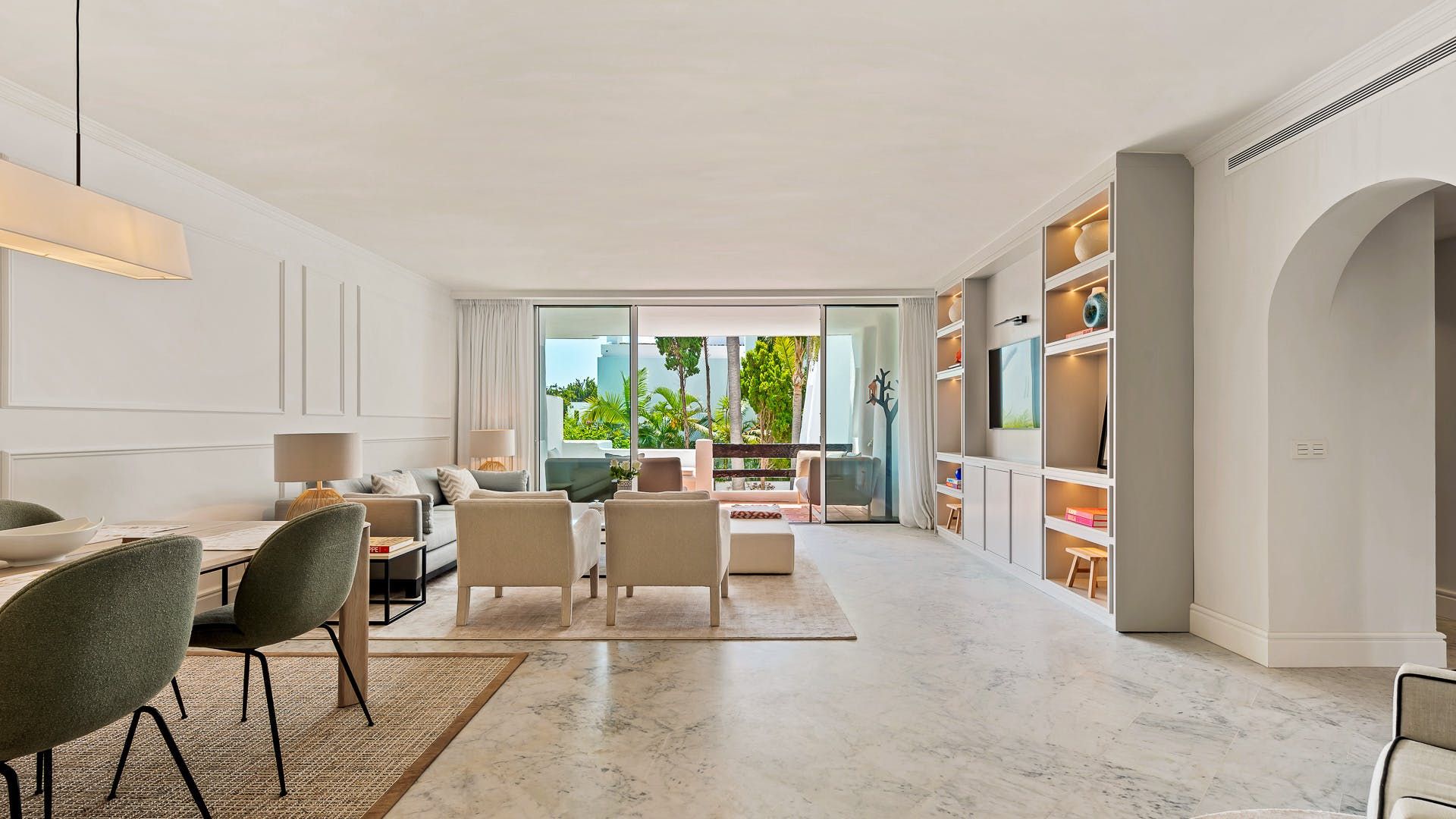 Taking inspiration from Cycladic architecture, this apartment combines whitewashed rounded shapes with Spanish-influenced terracotta tiles on the balcony and French-inspired mouldings in the refined open-plan living space. Speaking of the living space, soft white and taupe tones are complimented with plush furnishings, modern artworks, minimalist objects and a mirrored wall that creates an ambient space to socialise. Though there is an impressive on-site restaurant here, why not have your host arrange a private chef so you can make the most of soirées in your home oasis?
