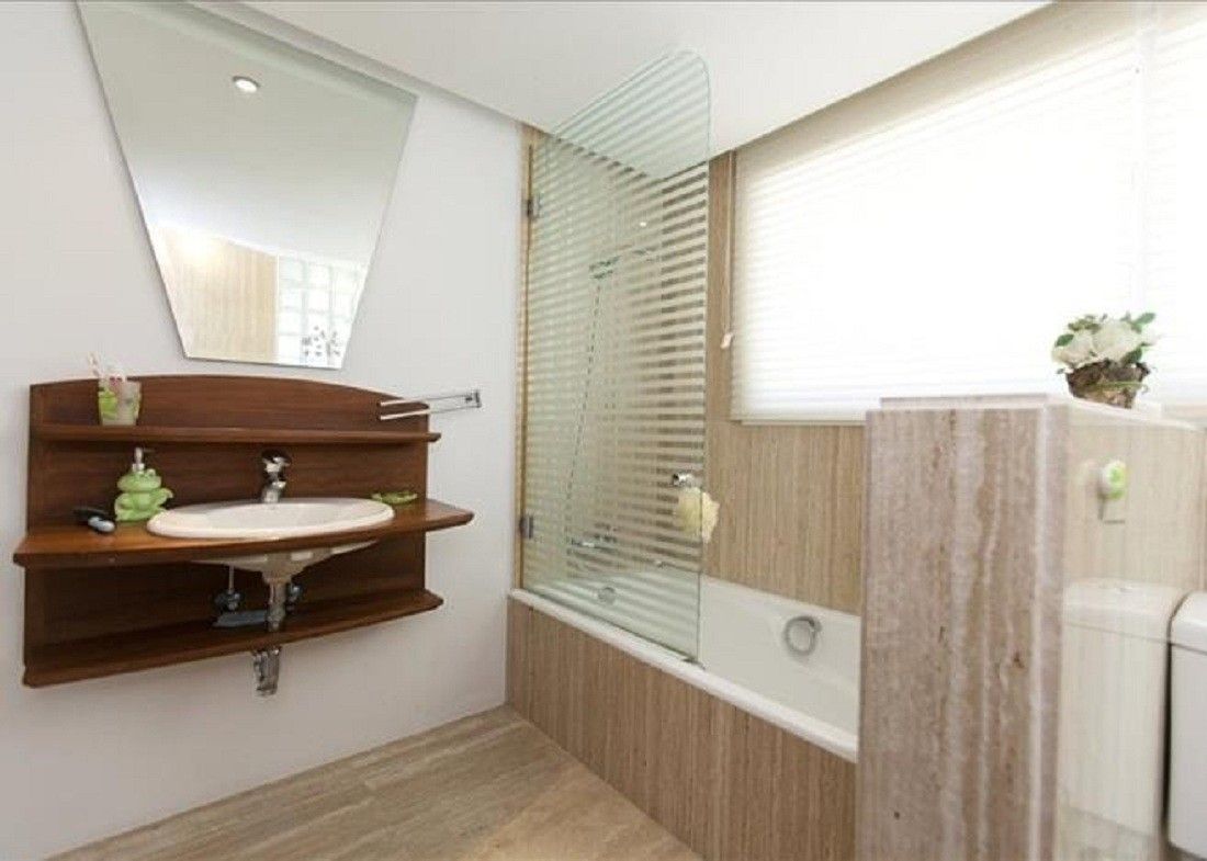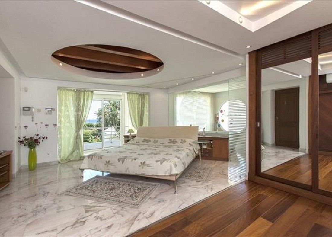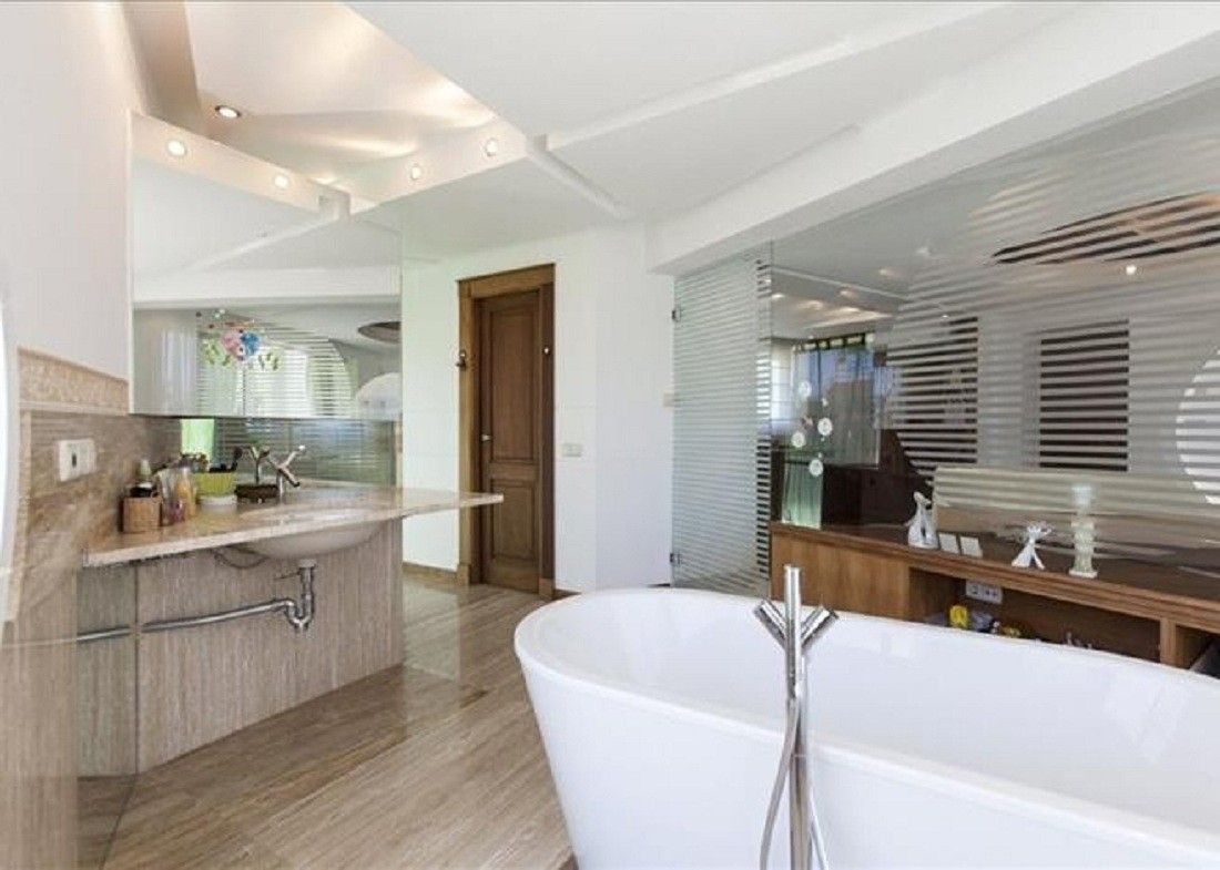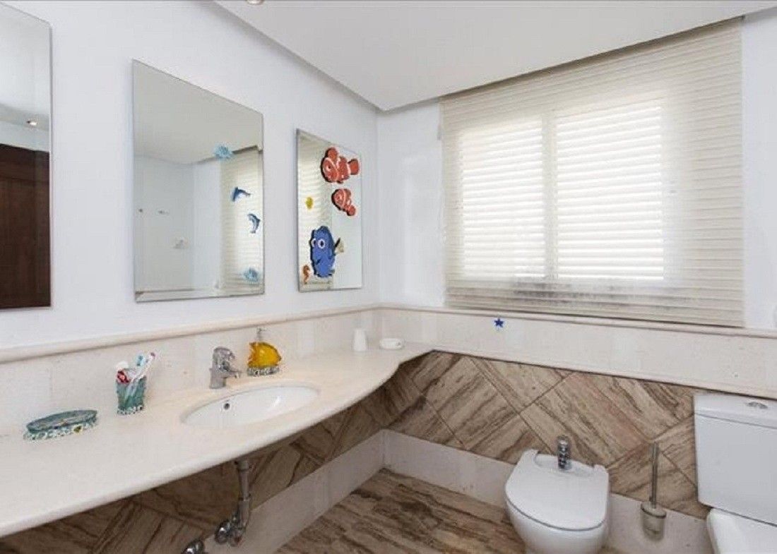 The entrance hall features a guest toilet and opens onto the drawing room, a striking space with floor-to-ceiling glass walls and a marbled fireplace. The open plan and modern kitchen is next to the dining area and has an adjacent laundry room. 5 double bedrooms with various bedding options, 4 bathrooms and attractive views of the Moroccan coast and the sea. The living area has a total surface of 45 m2 , with fireplace, big glass windows with pool views and big 42" 3D SMART TV