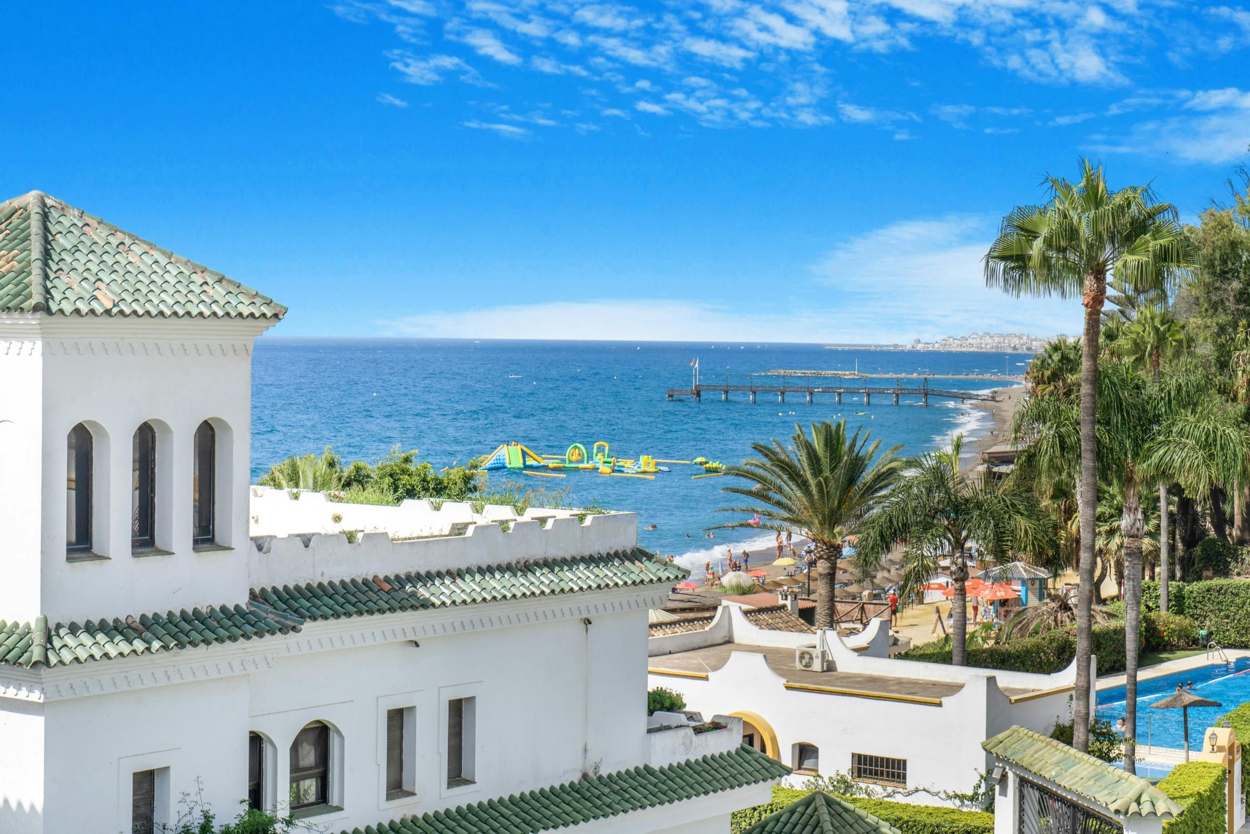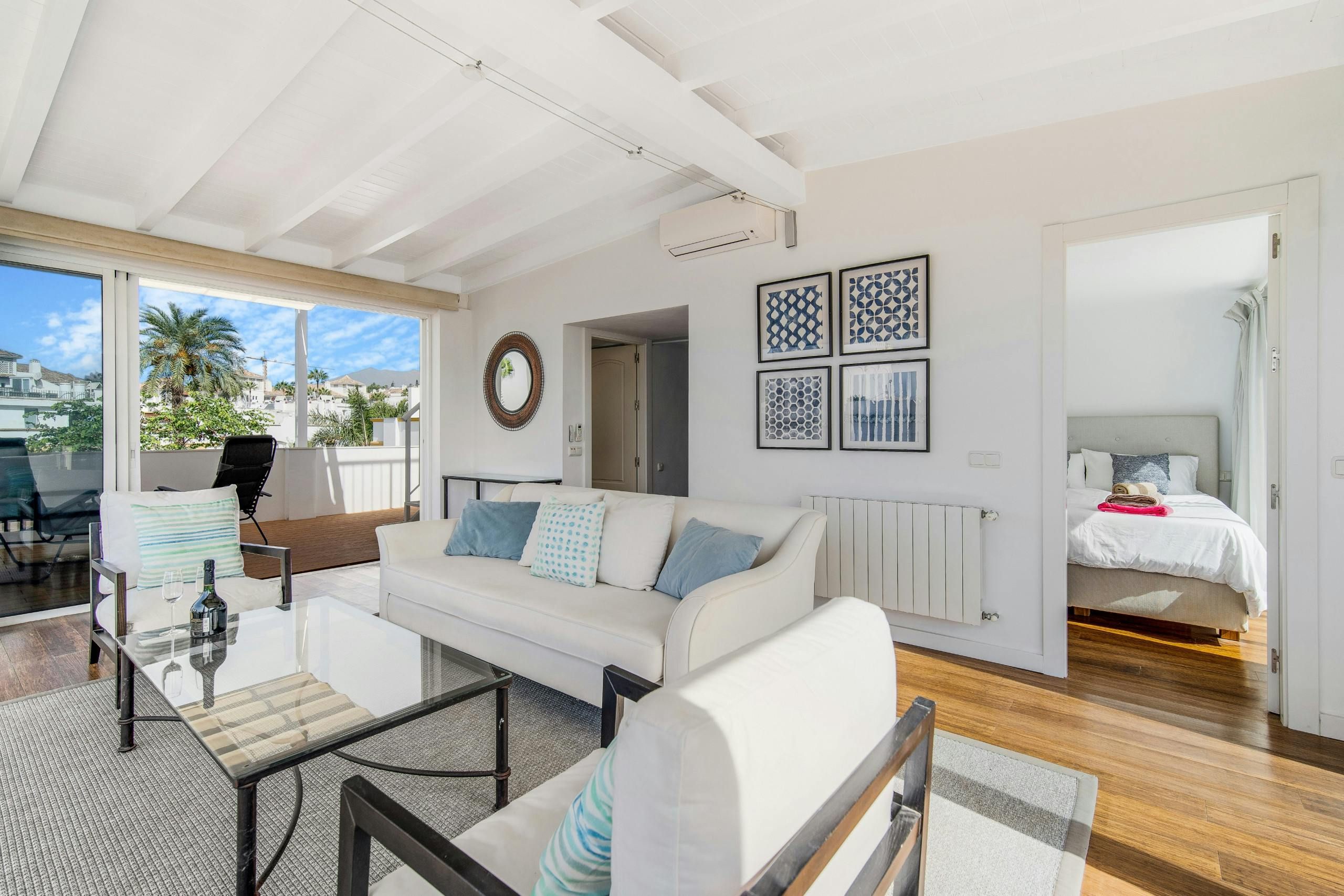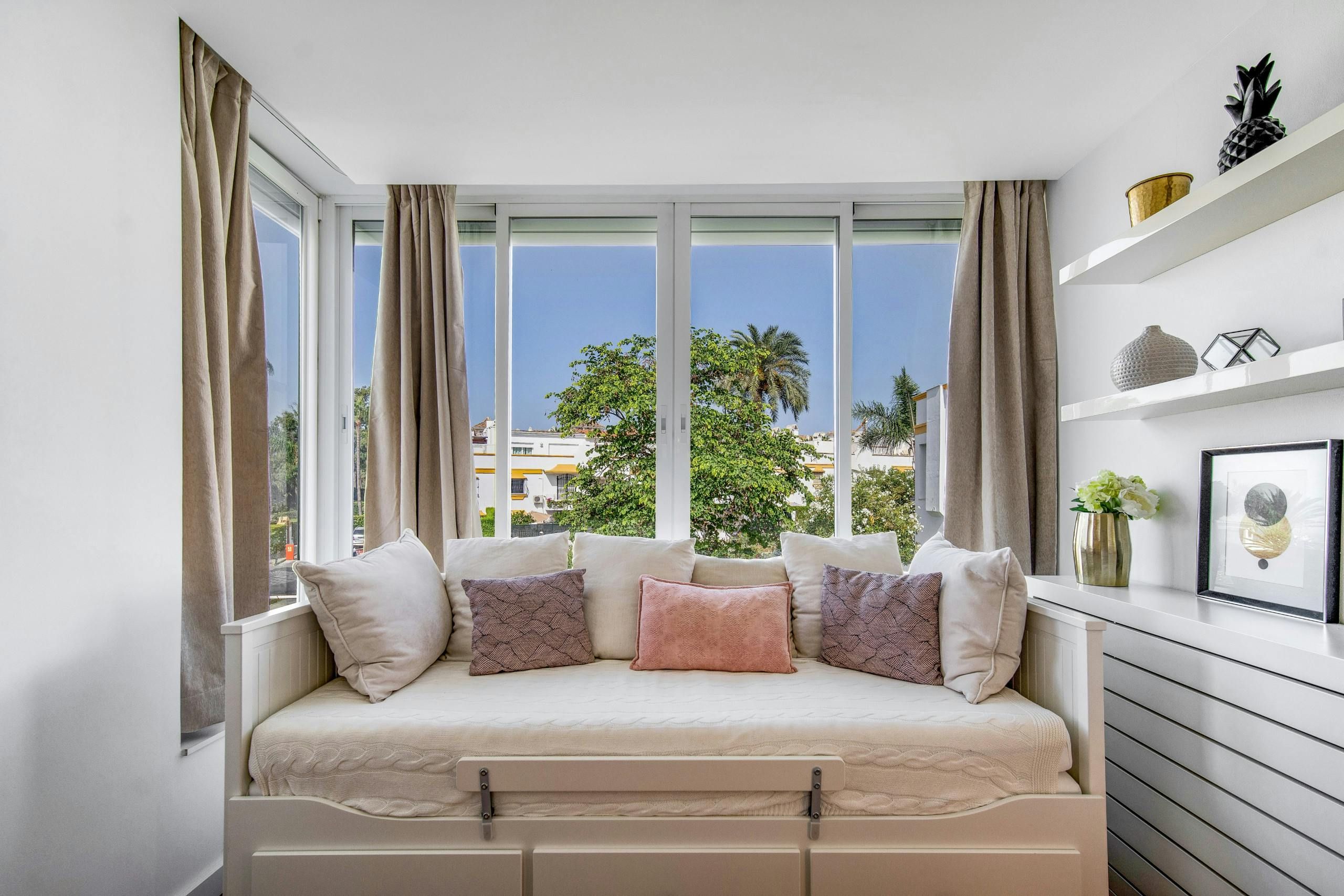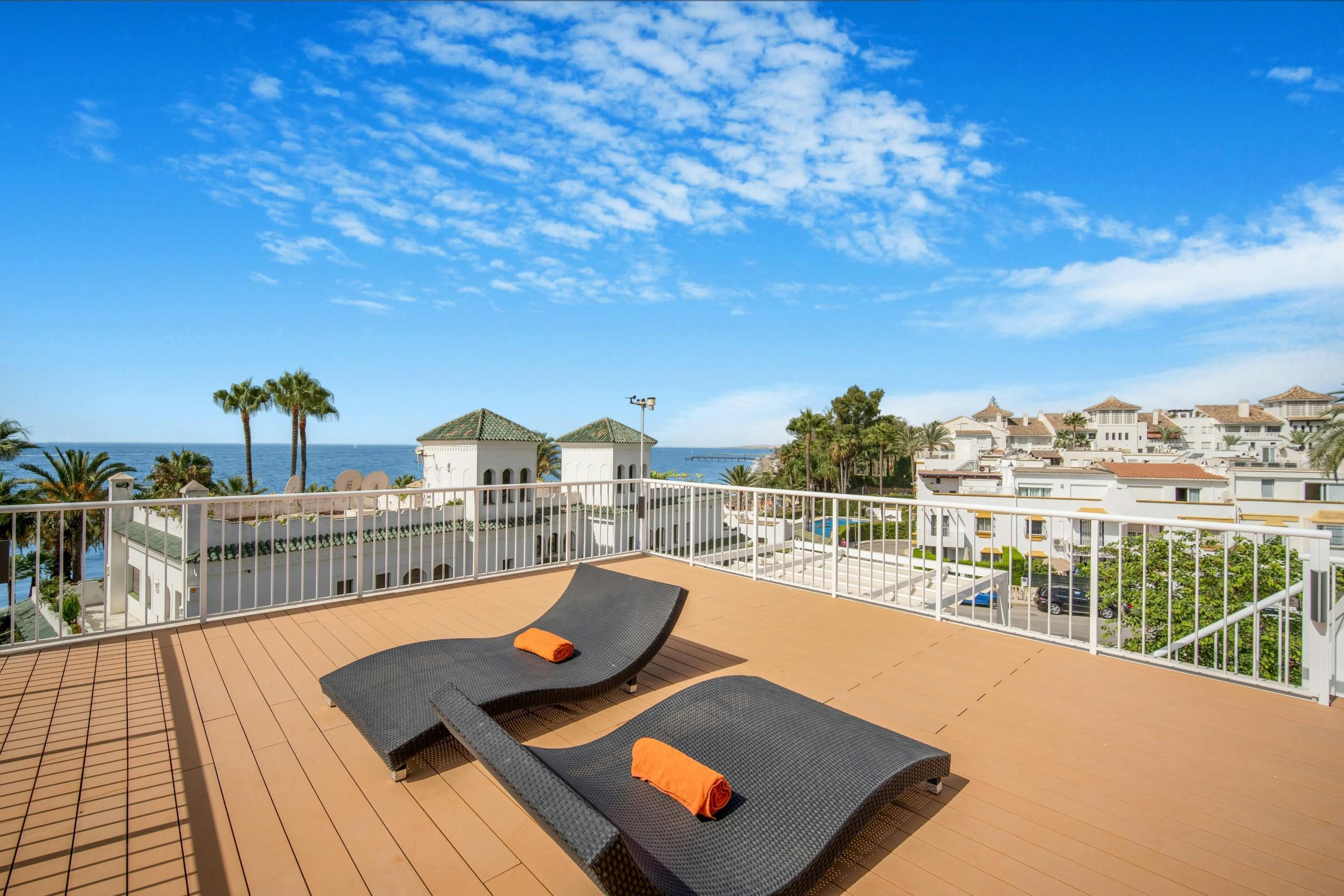 You get views of the sea and mountains from this home’s roof terrace. There’s also a garden with a barbeque and dining table, while communal facilities include a tennis court and a swimming pool. More about the home itself – this townhouse has two living spaces, so it’s great for families and friends. We love the fantastic vistas over the bay from the top-floor living room. The main bedroom suite is spacious – there’s a king-size bed, a single sofa bed, and a separate dressing area here. We should also mention that bedroom three has a double sofa bed. The location is a gem too – situated in the heart of Marbella's Golden Mile, you’ll be just metres from the beautiful Casablanca Beach.