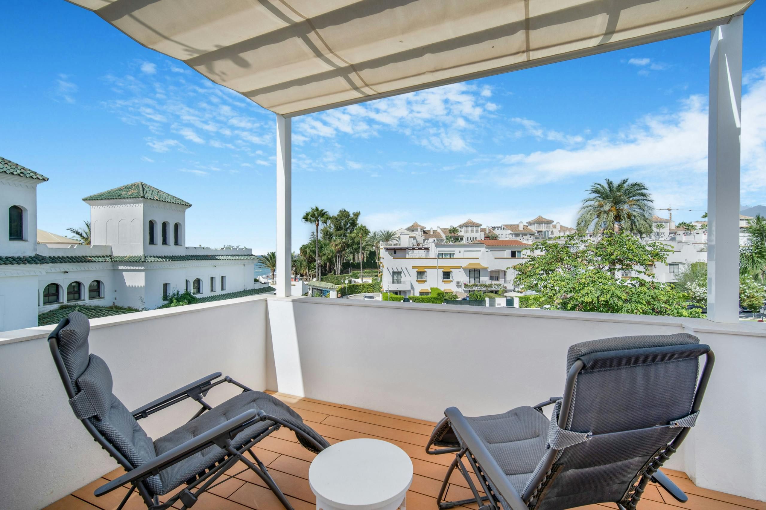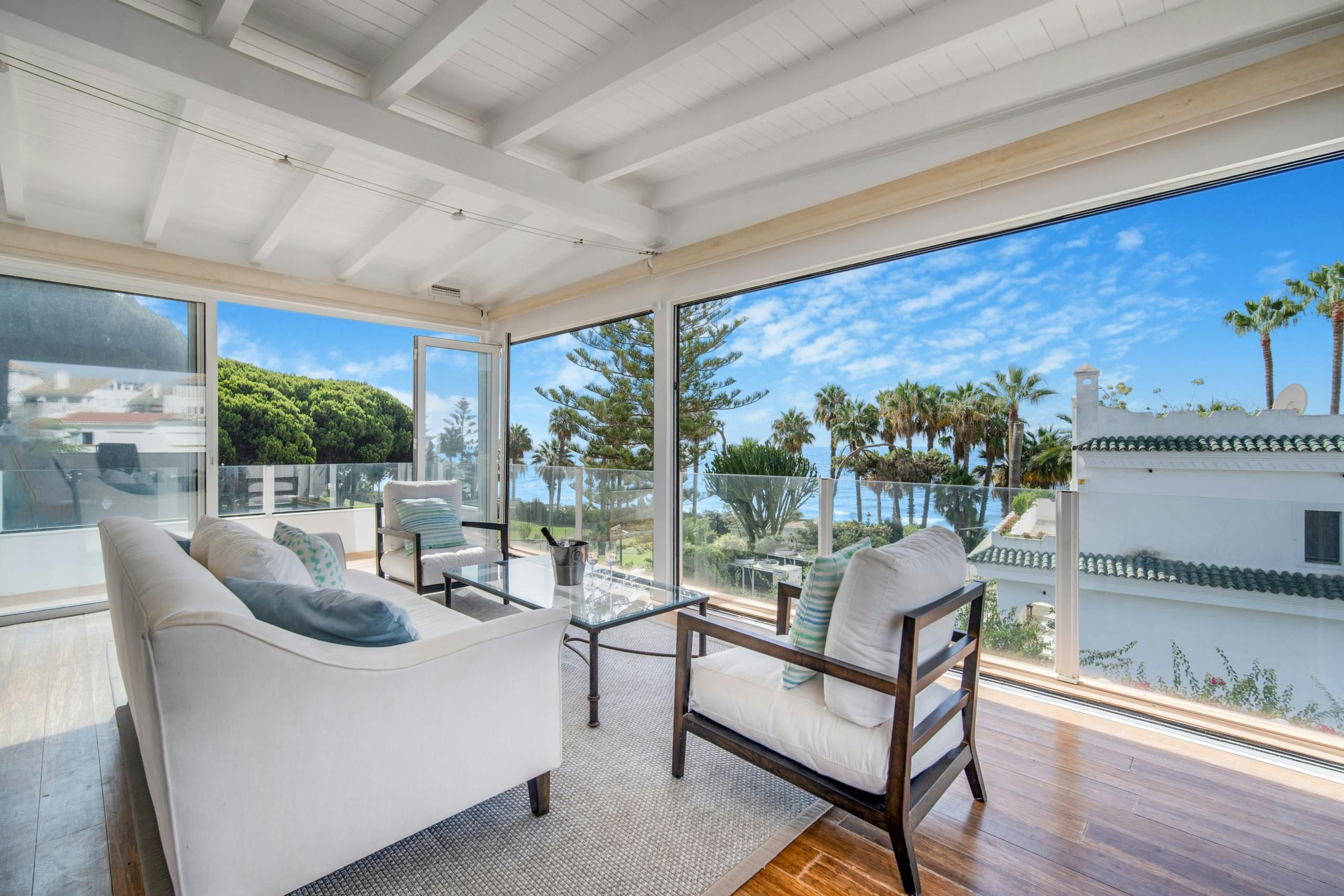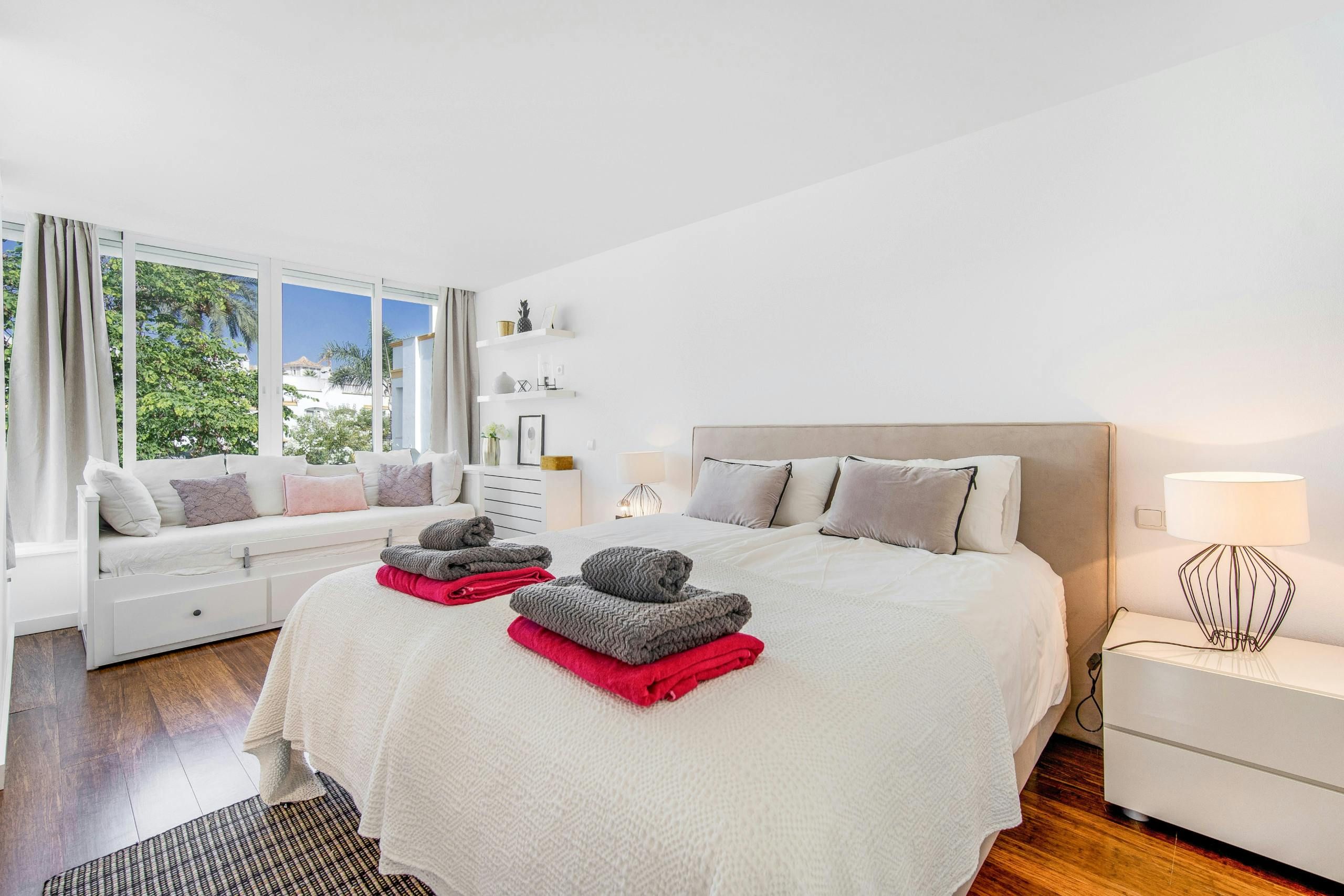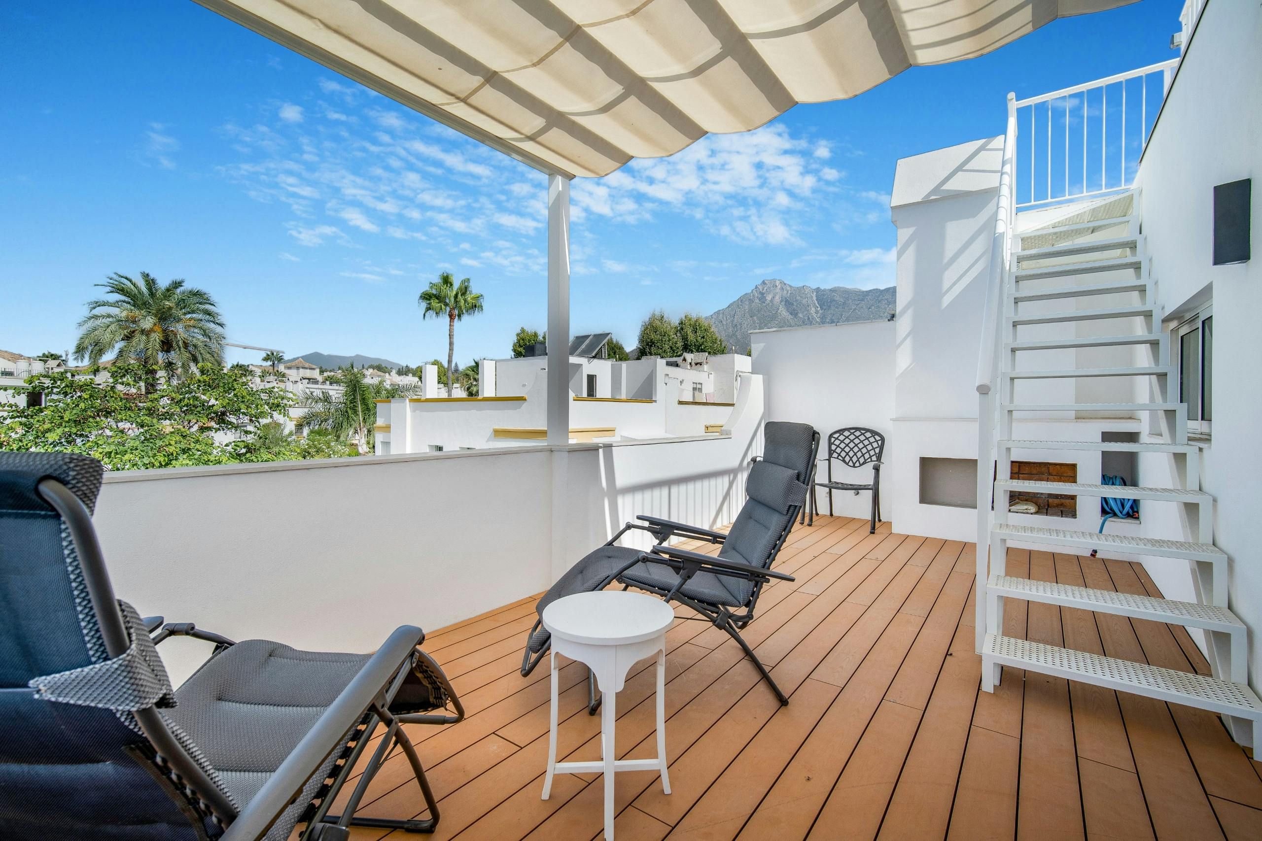 You get views of the sea and mountains from this home’s roof terrace. There’s also a garden with a barbeque and dining table, while communal facilities include a tennis court and a swimming pool. More about the home itself – this townhouse has two living spaces, so it’s great for families and friends. We love the fantastic vistas over the bay from the top-floor living room. The main bedroom suite is spacious – there’s a king-size bed, a single sofa bed, and a separate dressing area here. We should also mention that bedroom three has a double sofa bed. The location is a gem too – situated in the heart of Marbella's Golden Mile, you’ll be just metres from the beautiful Casablanca Beach.