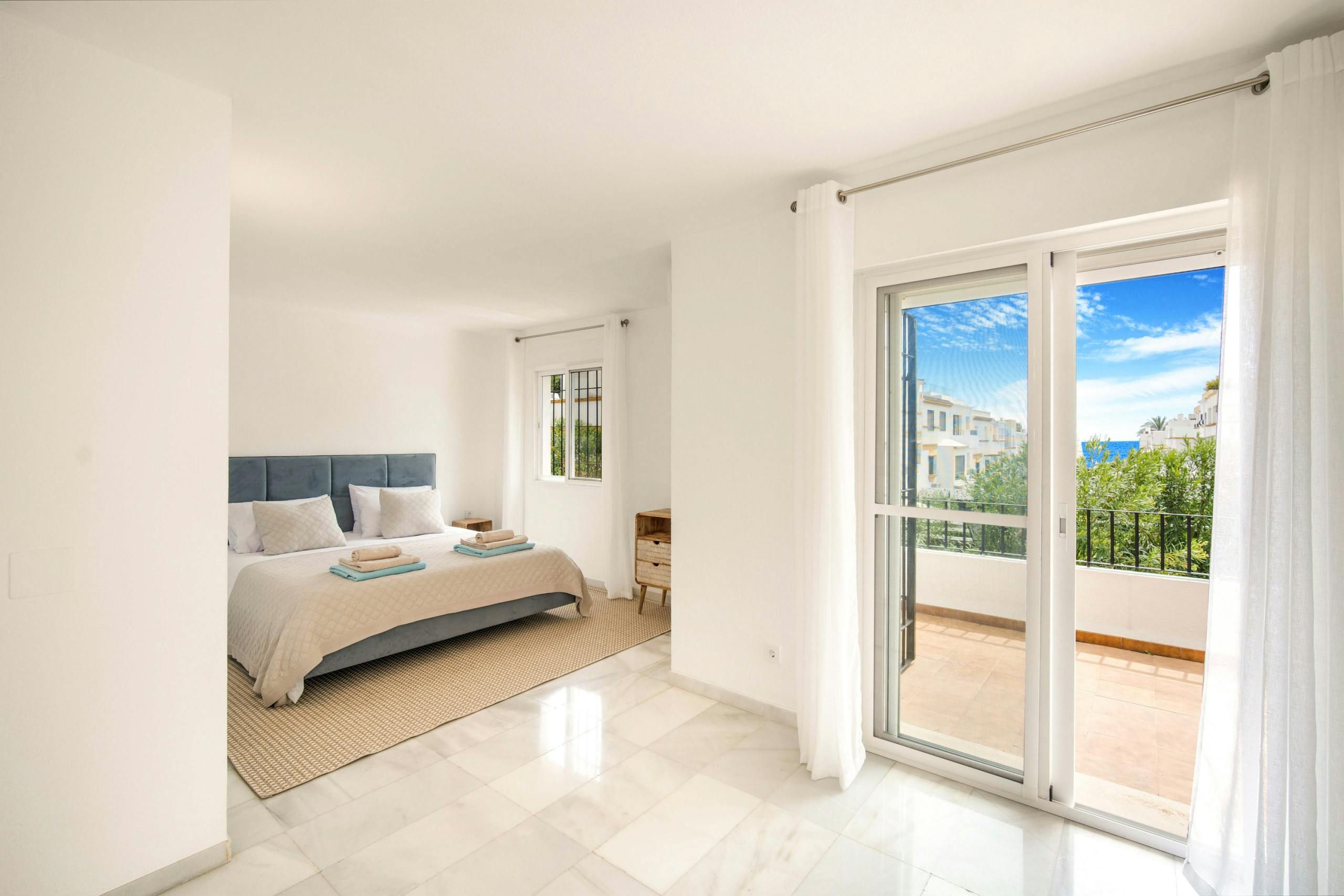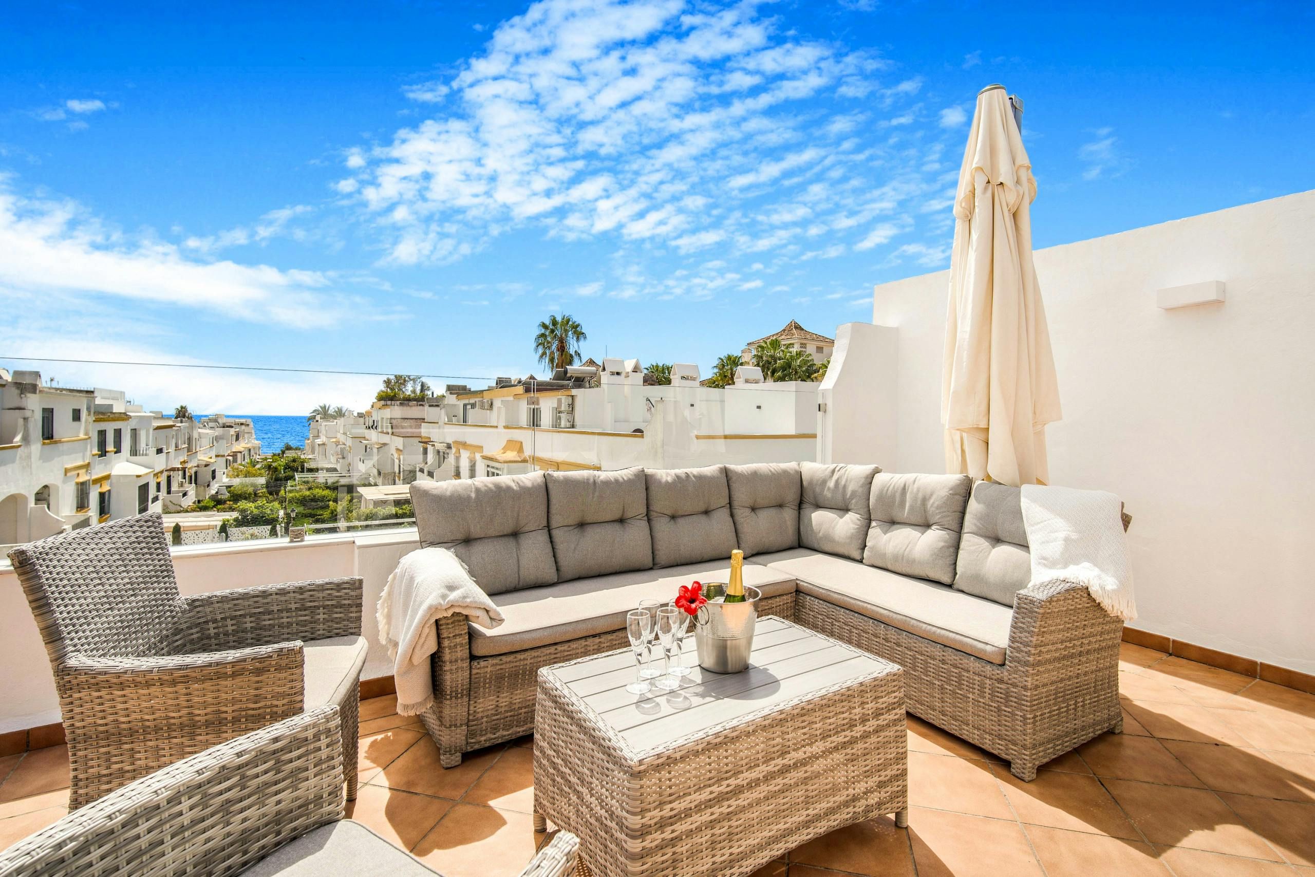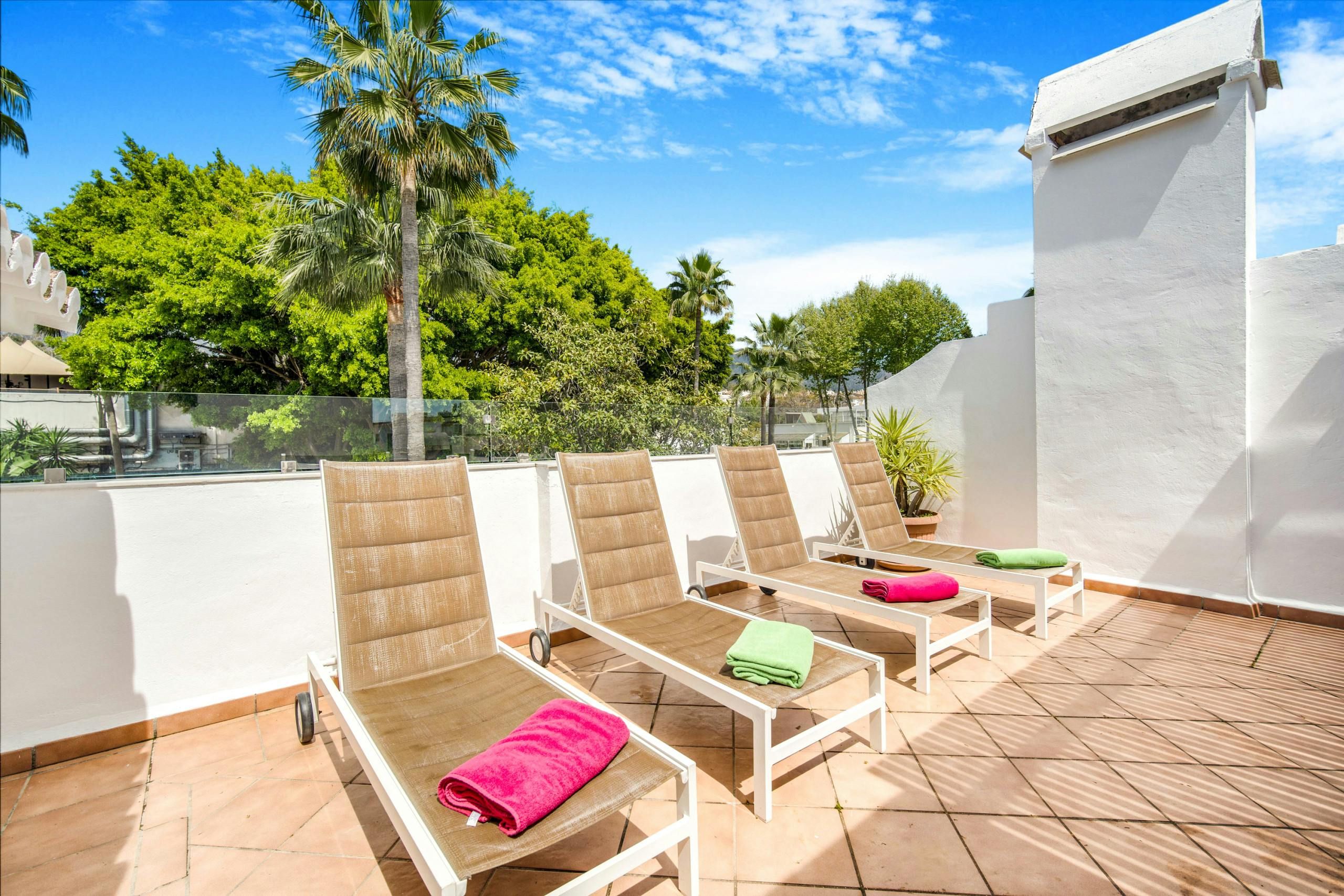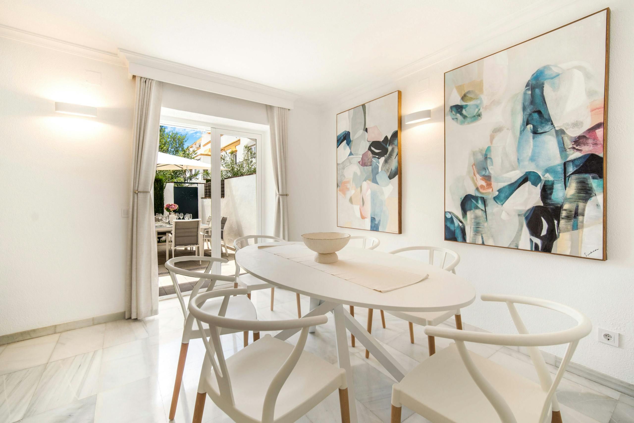 Just 100 metres from the sandy Casablanca Beach, you’ll find this three-storey townhouse. You can also take a stroll along the Paseo Maritimo to the old town of Marbella or indulge in Michelin-starred dining at the Puente Romano Resort. For those seeking active leisure pursuits, you can take part in kite surfing, horse riding and golf. So that’s the prime location, now the home itself. The outdoor space is great – there are two large terraces with a covered seating area, bar, sunbeds and barbeque and we love the sea glimpses from the roof terrace. There’s also a communal pool surrounded by lawns and palm trees and a tennis and paddle court. Inside, it’s light and airy and there’s plenty of room for entertaining.