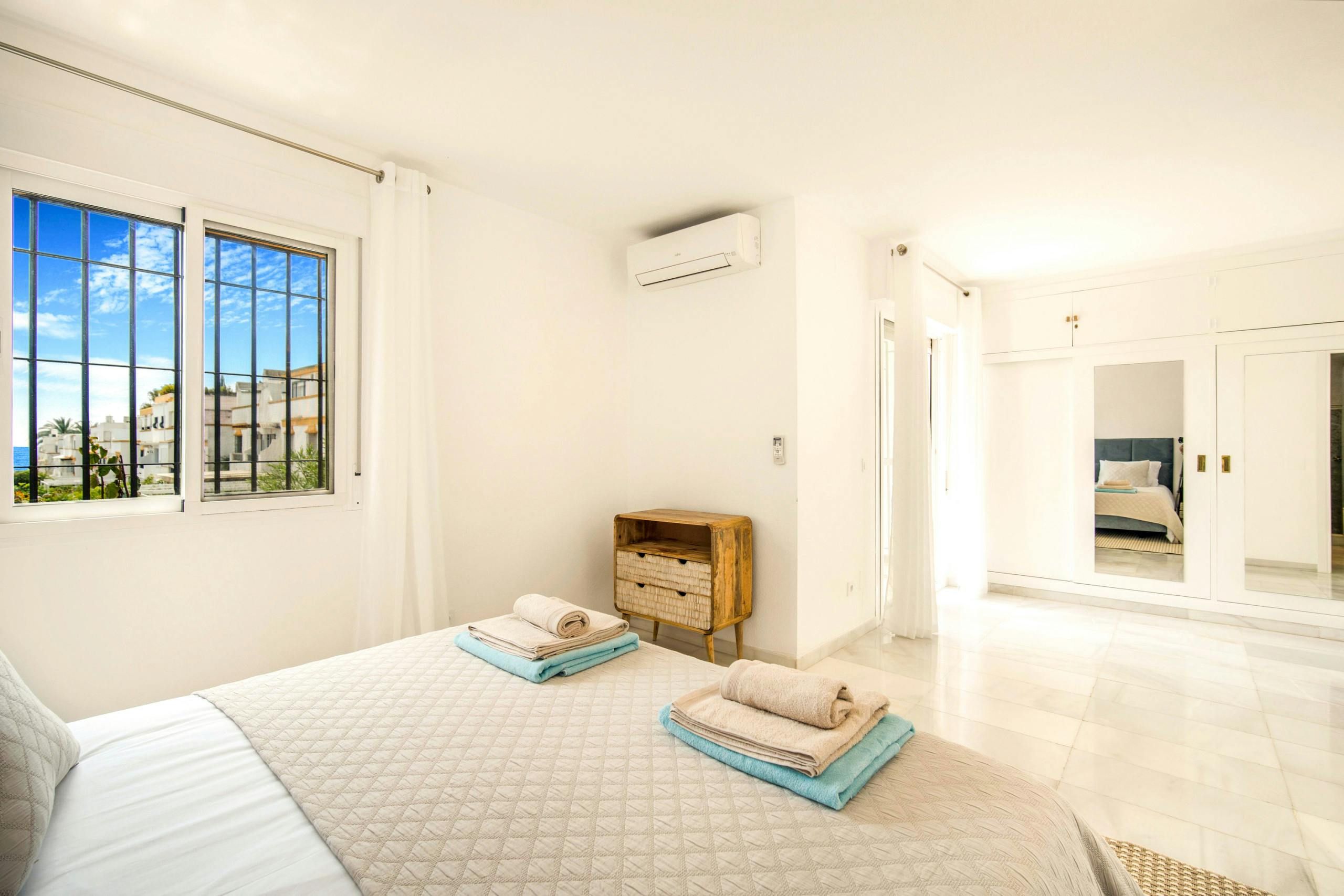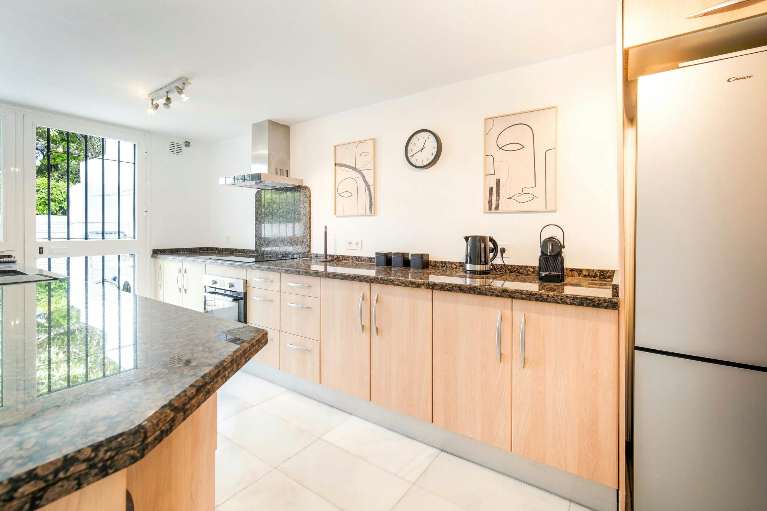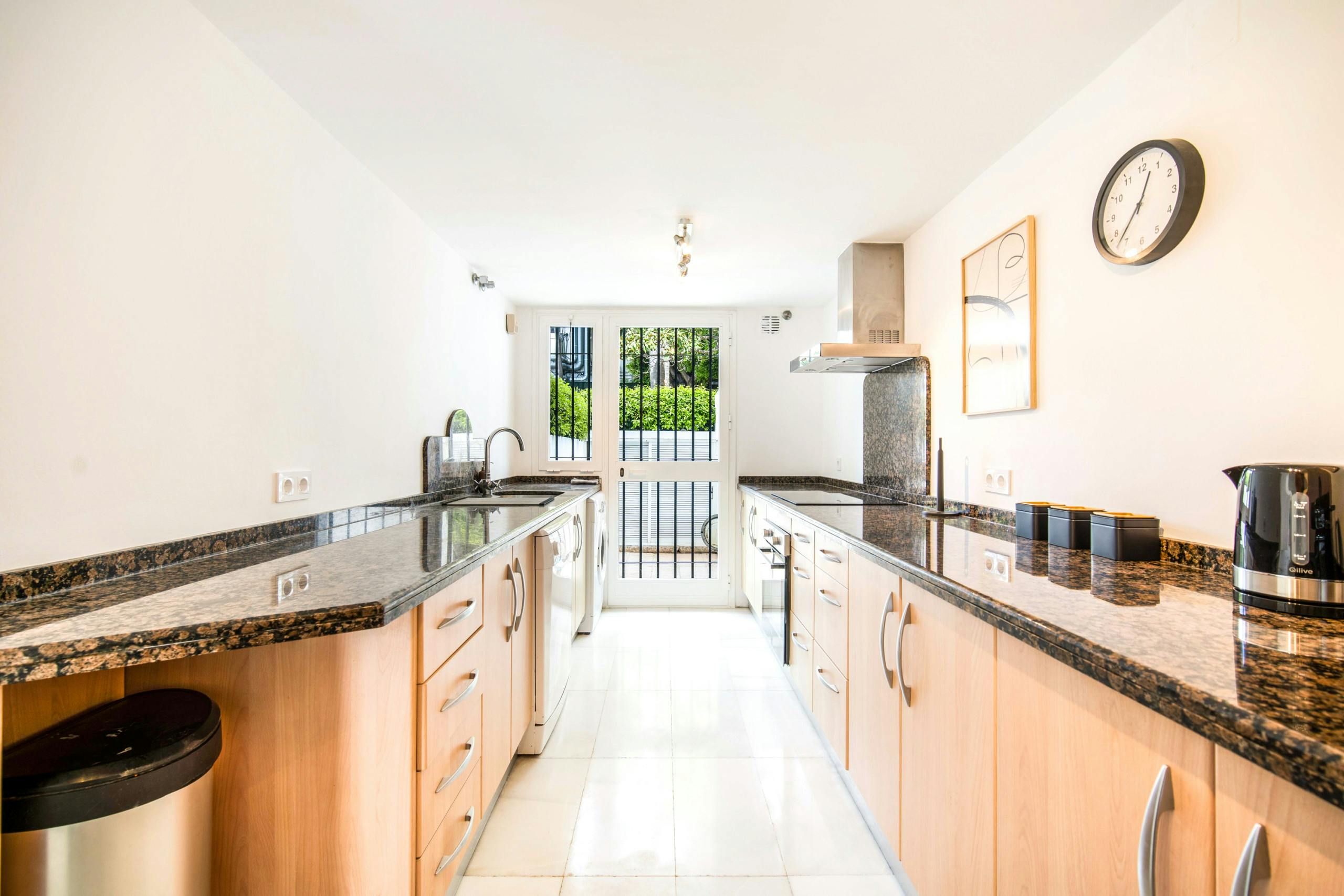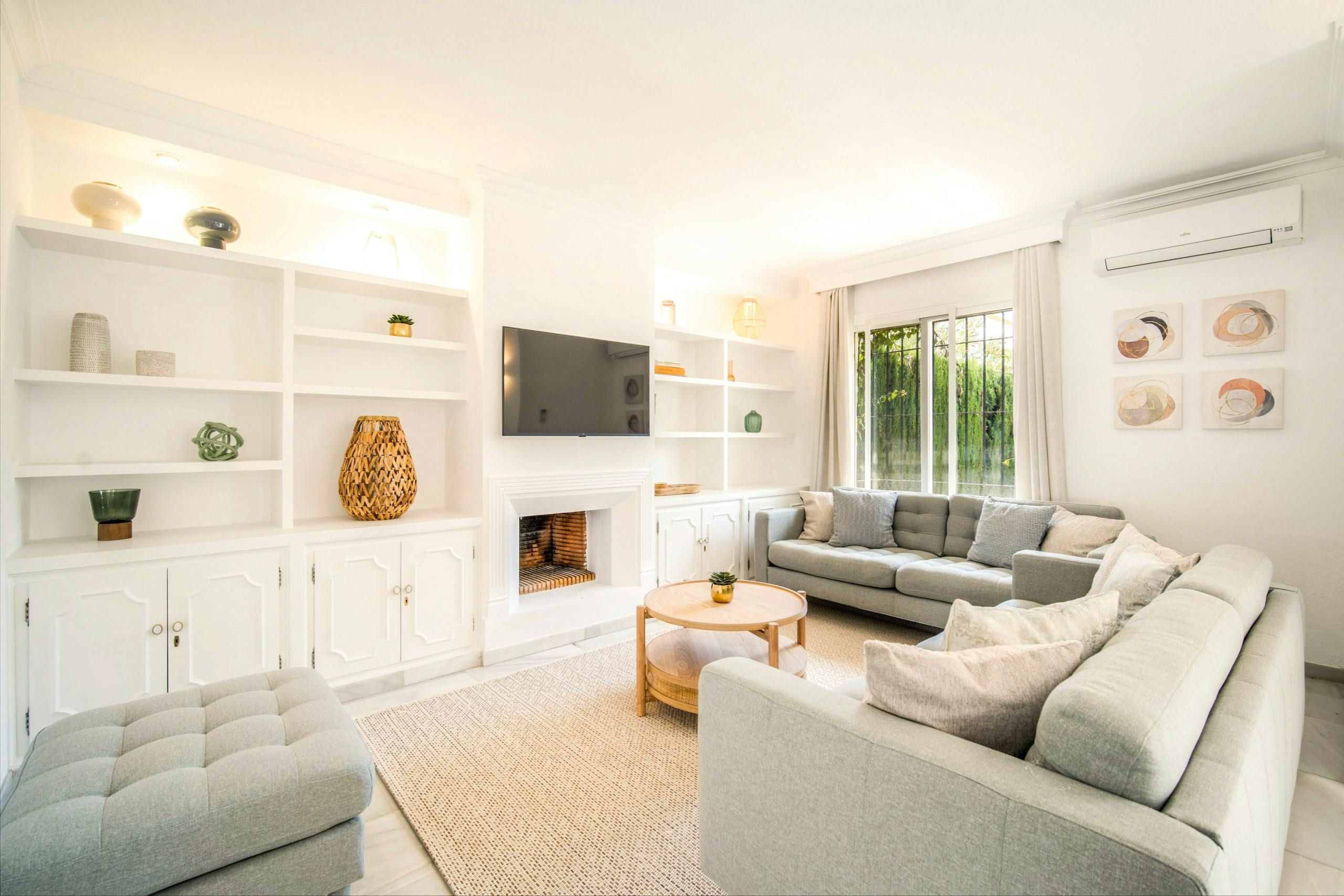 Just 100 metres from the sandy Casablanca Beach, you’ll find this three-storey townhouse. You can also take a stroll along the Paseo Maritimo to the old town of Marbella or indulge in Michelin-starred dining at the Puente Romano Resort. For those seeking active leisure pursuits, you can take part in kite surfing, horse riding and golf. So that’s the prime location, now the home itself. The outdoor space is great – there are two large terraces with a covered seating area, bar, sunbeds and barbeque and we love the sea glimpses from the roof terrace. There’s also a communal pool surrounded by lawns and palm trees and a tennis and paddle court. Inside, it’s light and airy and there’s plenty of room for entertaining.
