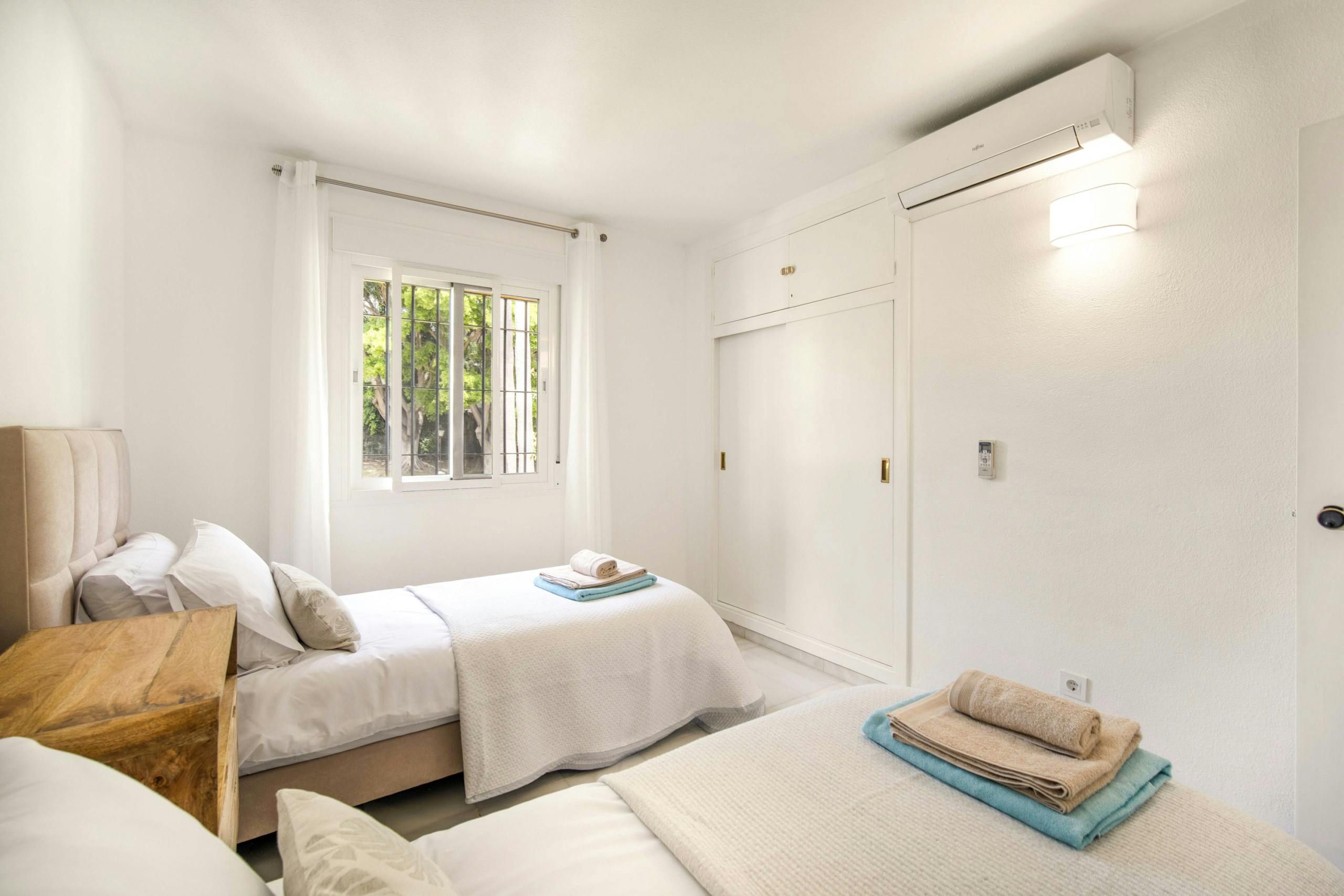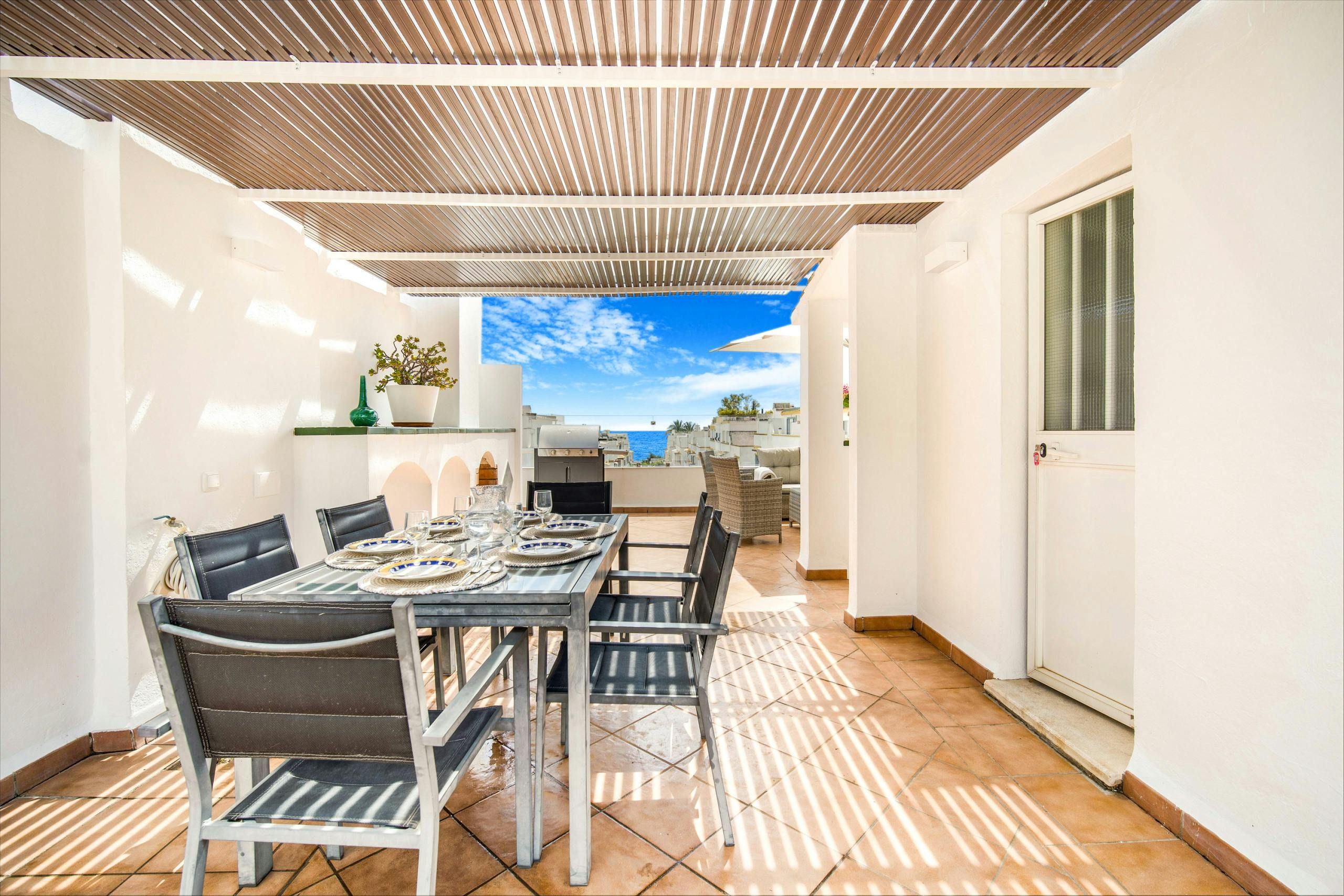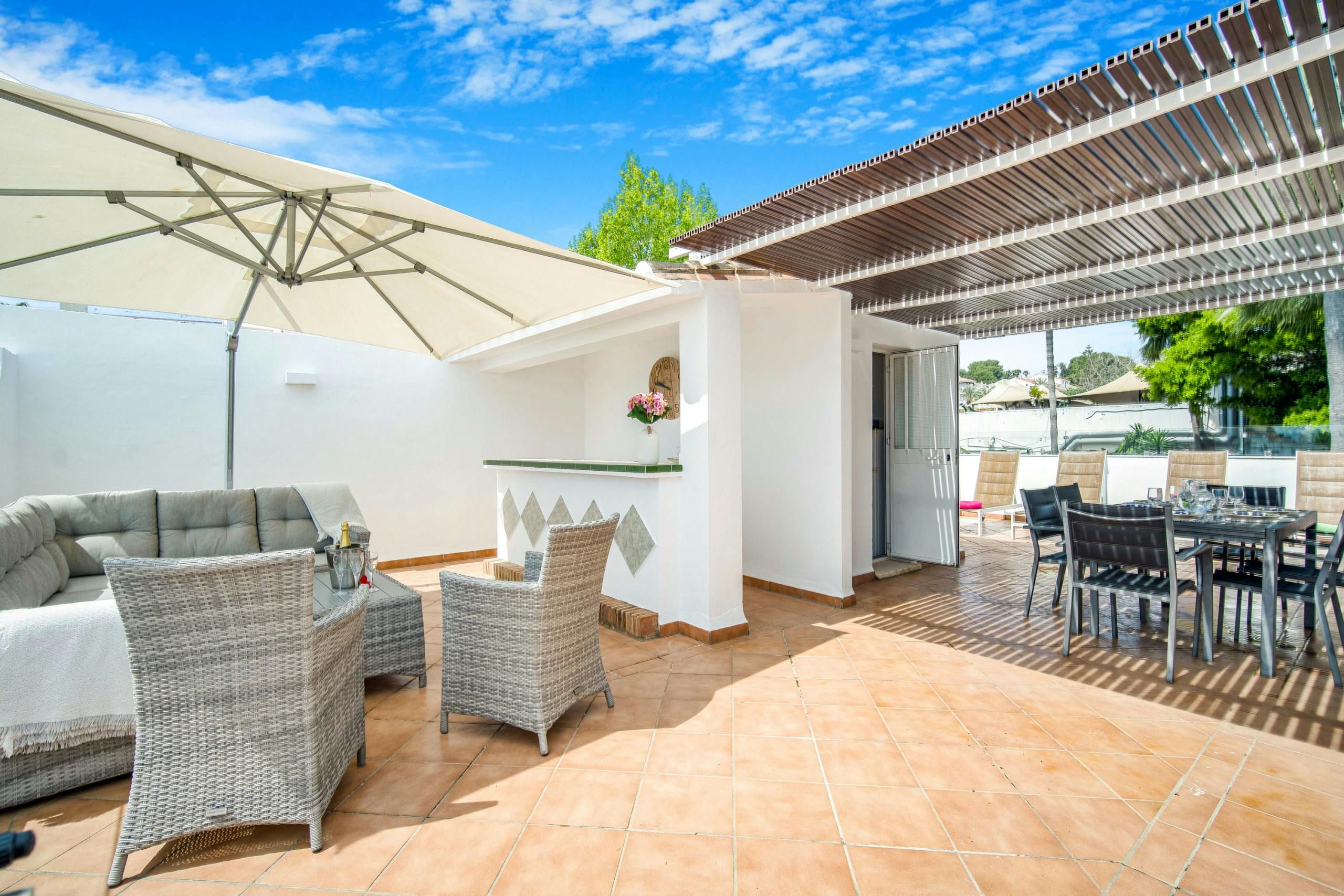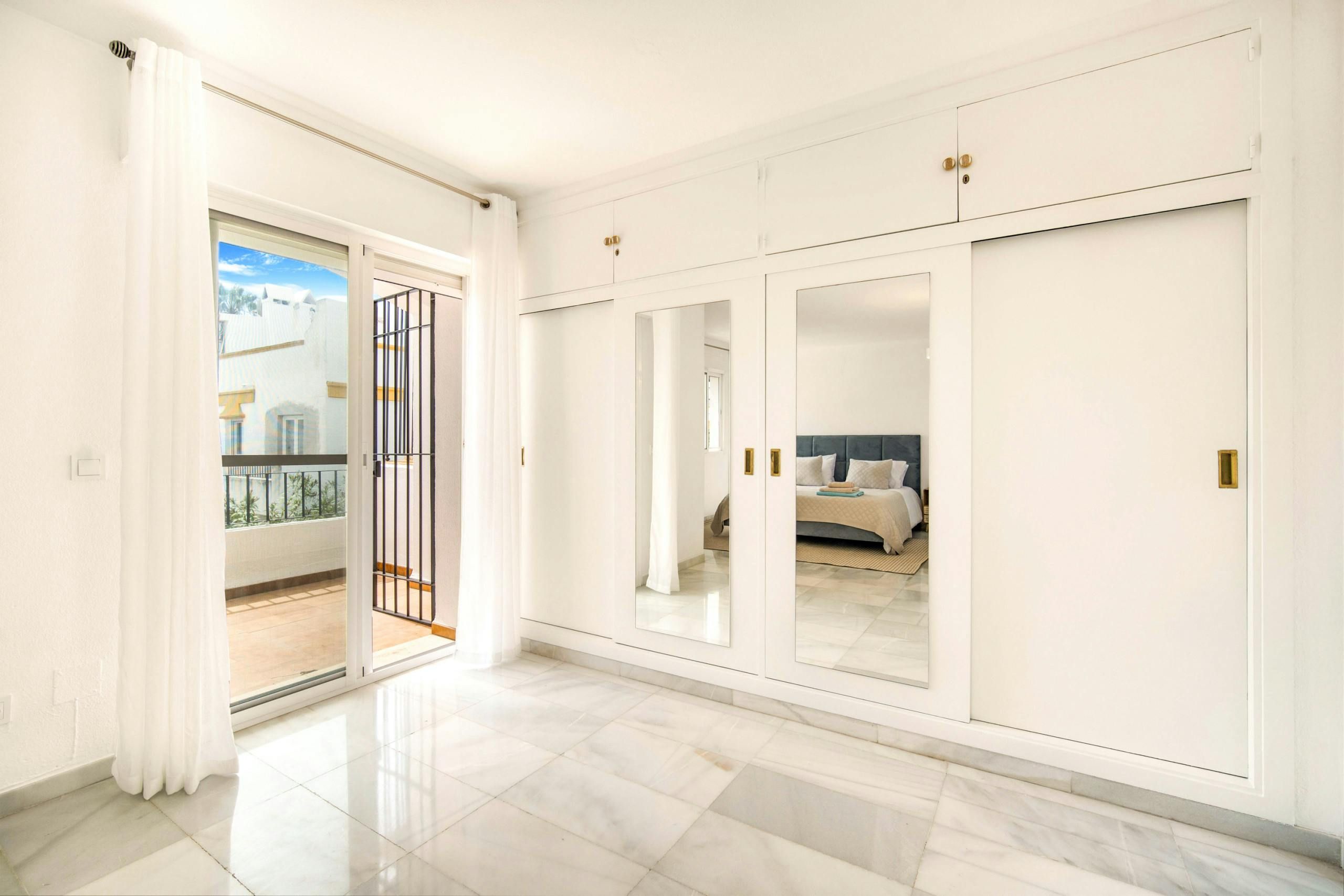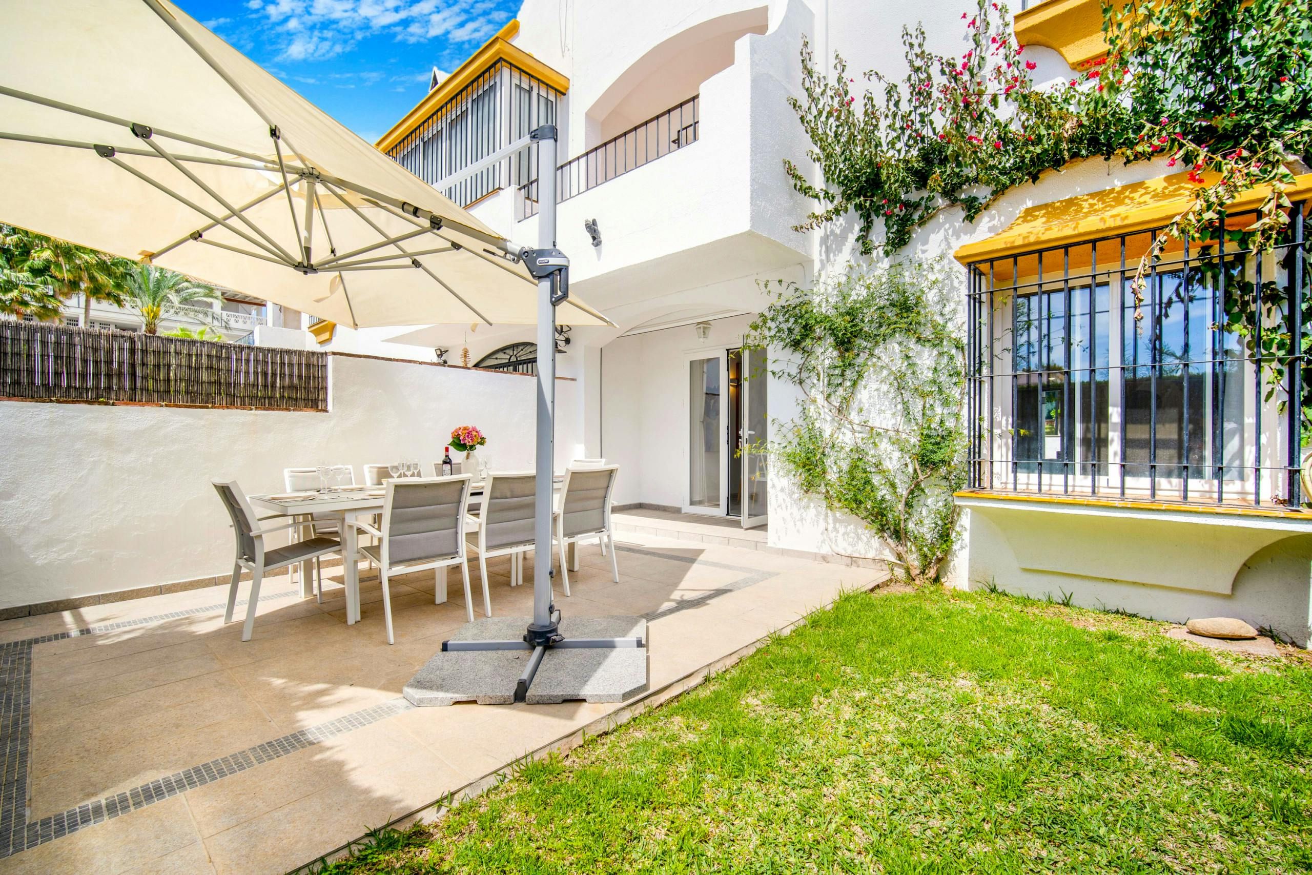 Just 100 metres from the sandy Casablanca Beach, you’ll find this three-storey townhouse. You can also take a stroll along the Paseo Maritimo to the old town of Marbella or indulge in Michelin-starred dining at the Puente Romano Resort. For those seeking active leisure pursuits, you can take part in kite surfing, horse riding and golf. So that’s the prime location, now the home itself. The outdoor space is great – there are two large terraces with a covered seating area, bar, sunbeds and barbeque and we love the sea glimpses from the roof terrace. There’s also a communal pool surrounded by lawns and palm trees and a tennis and paddle court. Inside, it’s light and airy and there’s plenty of room for entertaining.