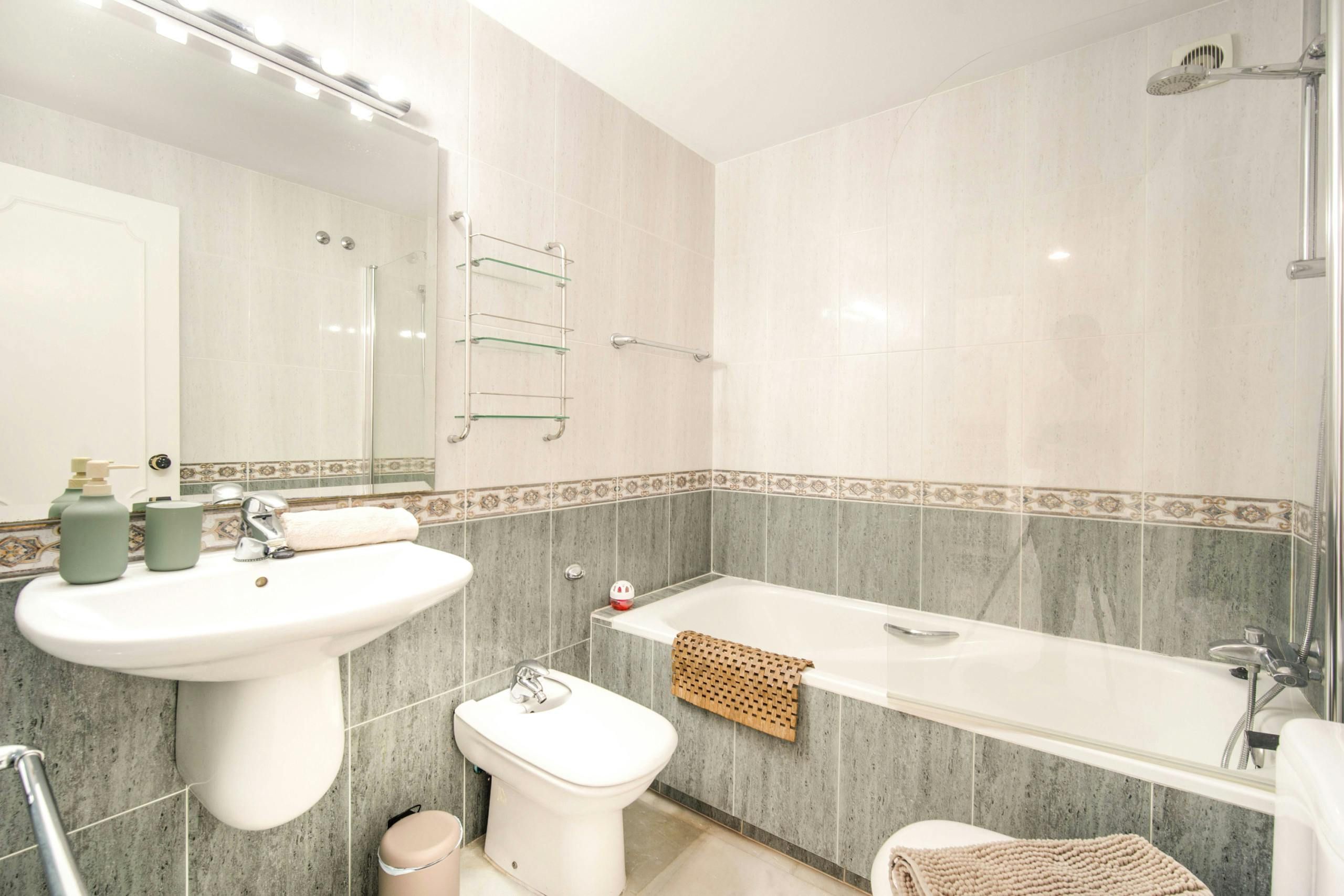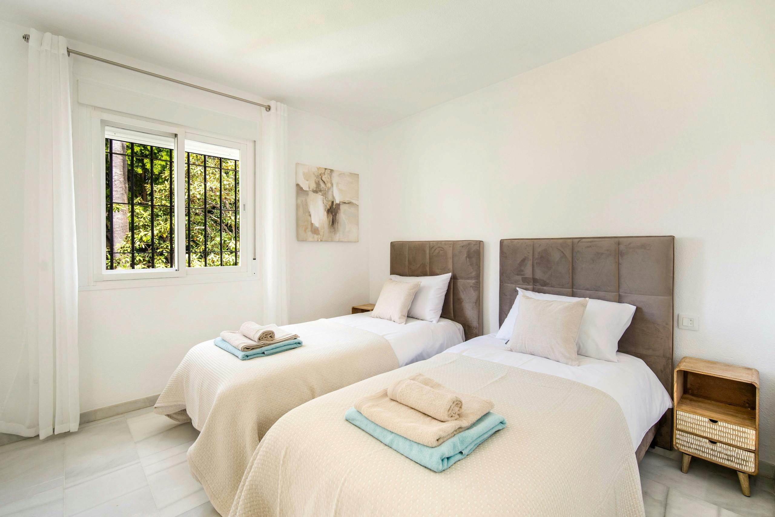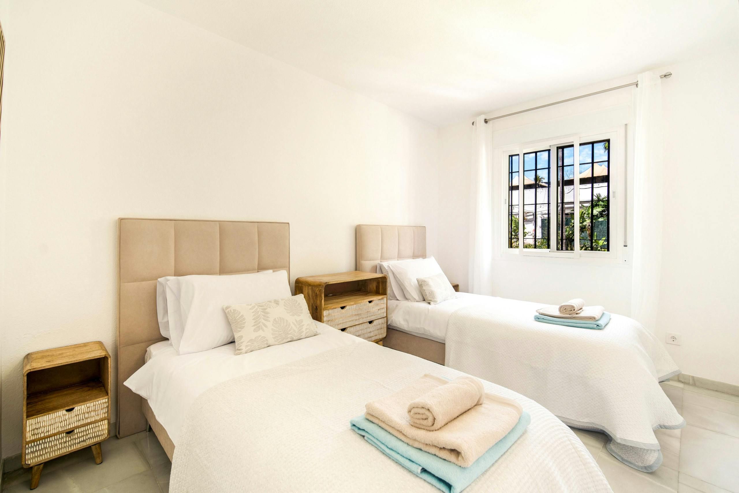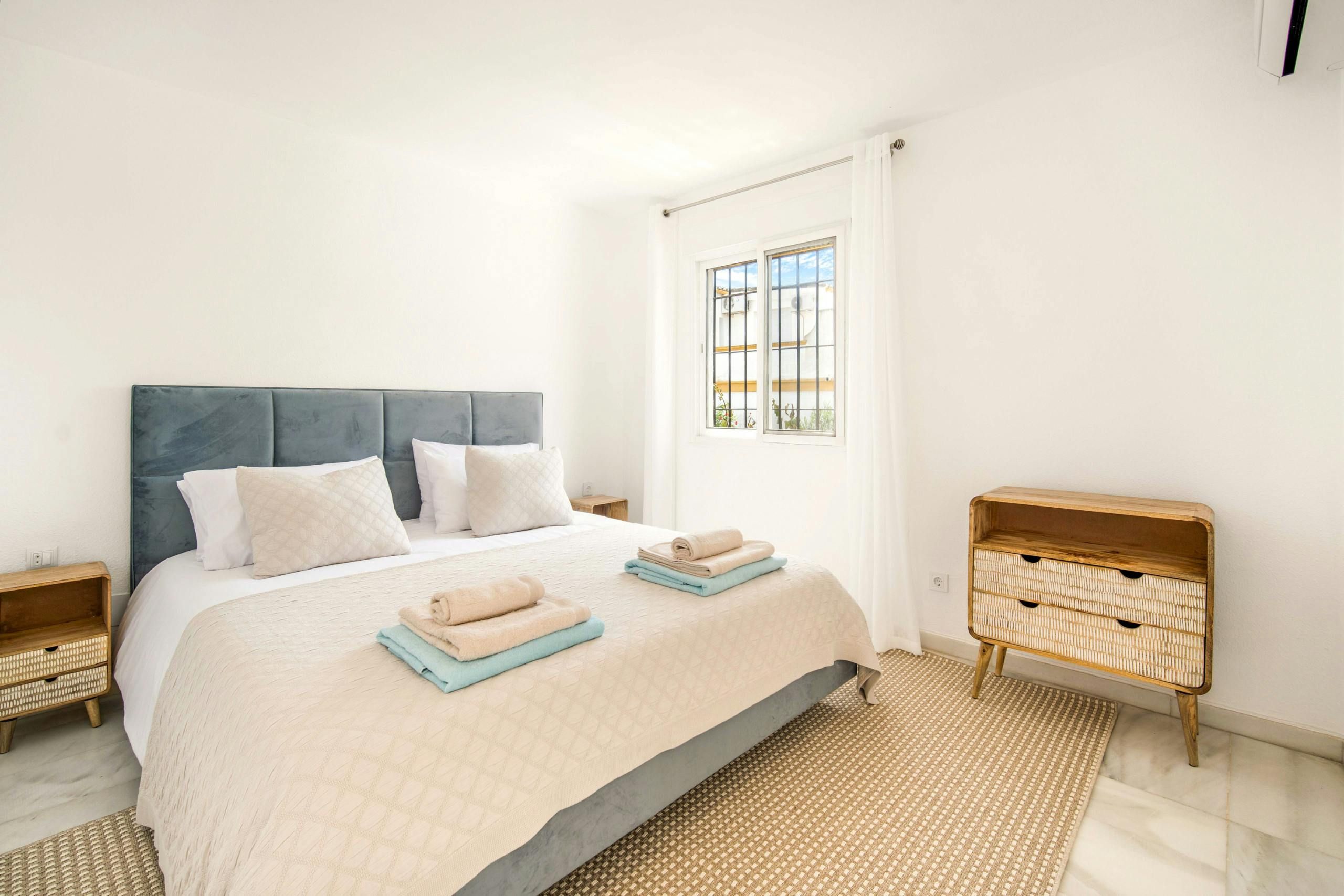 Just 100 metres from the sandy Casablanca Beach, you’ll find this three-storey townhouse. You can also take a stroll along the Paseo Maritimo to the old town of Marbella or indulge in Michelin-starred dining at the Puente Romano Resort. For those seeking active leisure pursuits, you can take part in kite surfing, horse riding and golf. So that’s the prime location, now the home itself. The outdoor space is great – there are two large terraces with a covered seating area, bar, sunbeds and barbeque and we love the sea glimpses from the roof terrace. There’s also a communal pool surrounded by lawns and palm trees and a tennis and paddle court. Inside, it’s light and airy and there’s plenty of room for entertaining.
