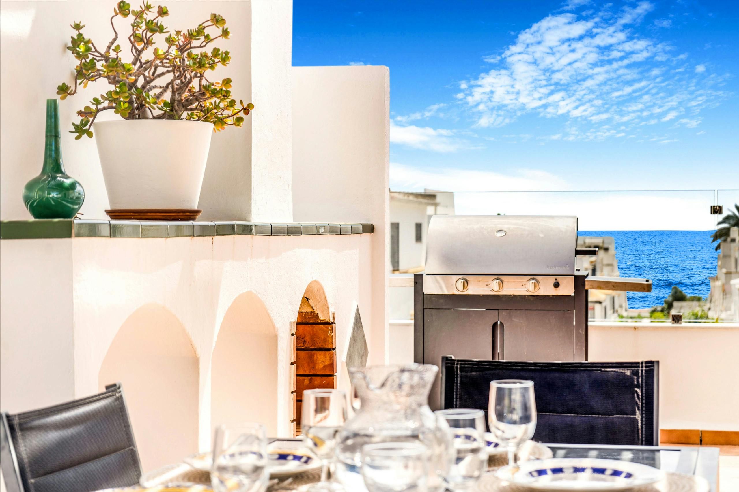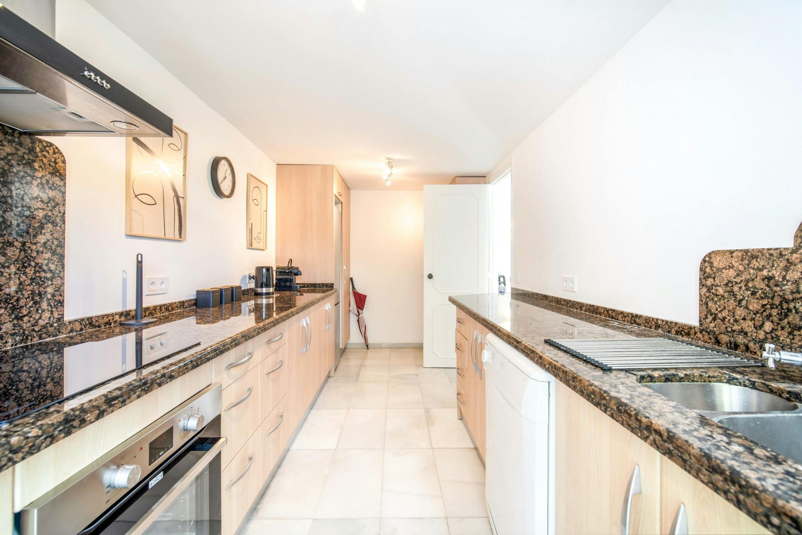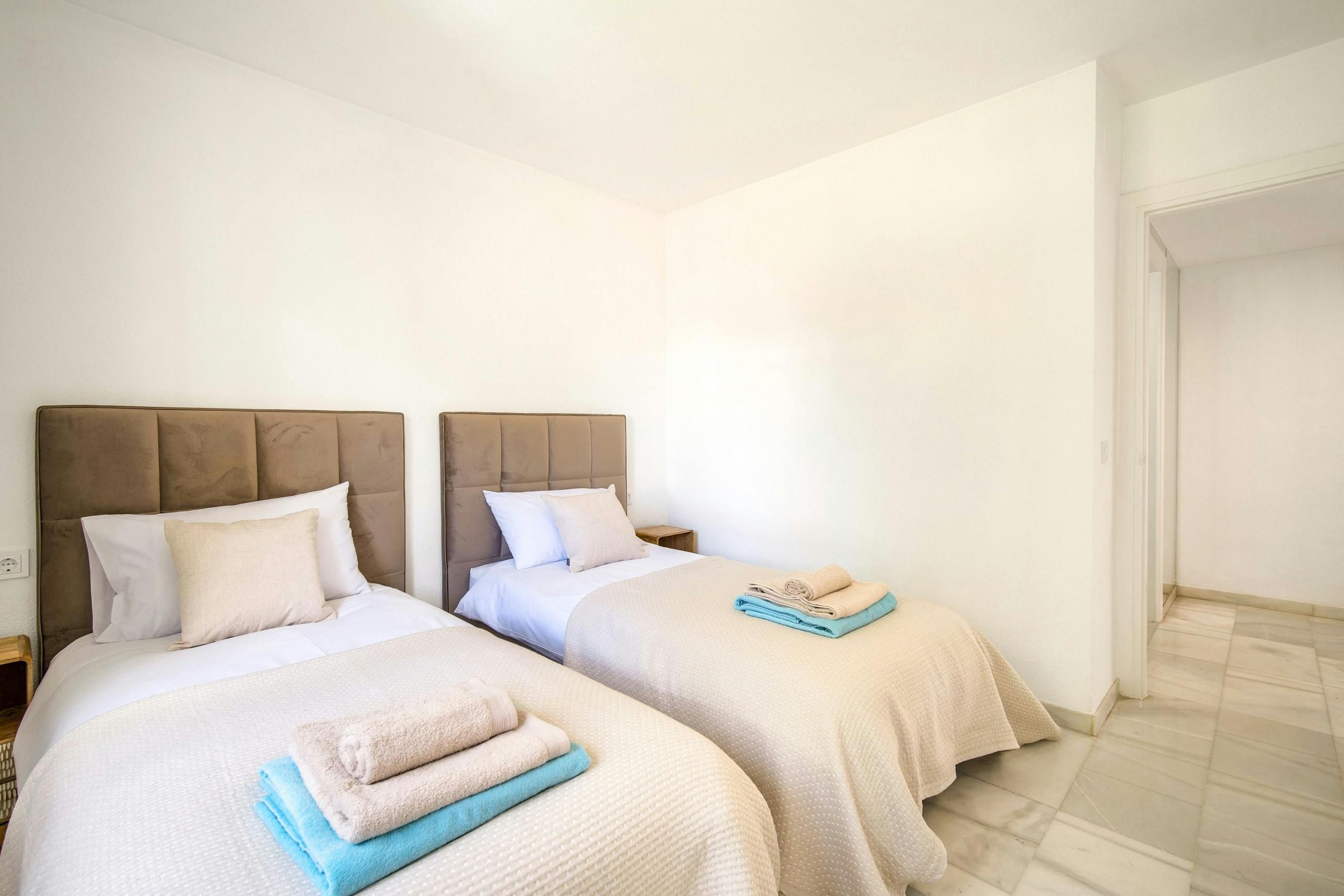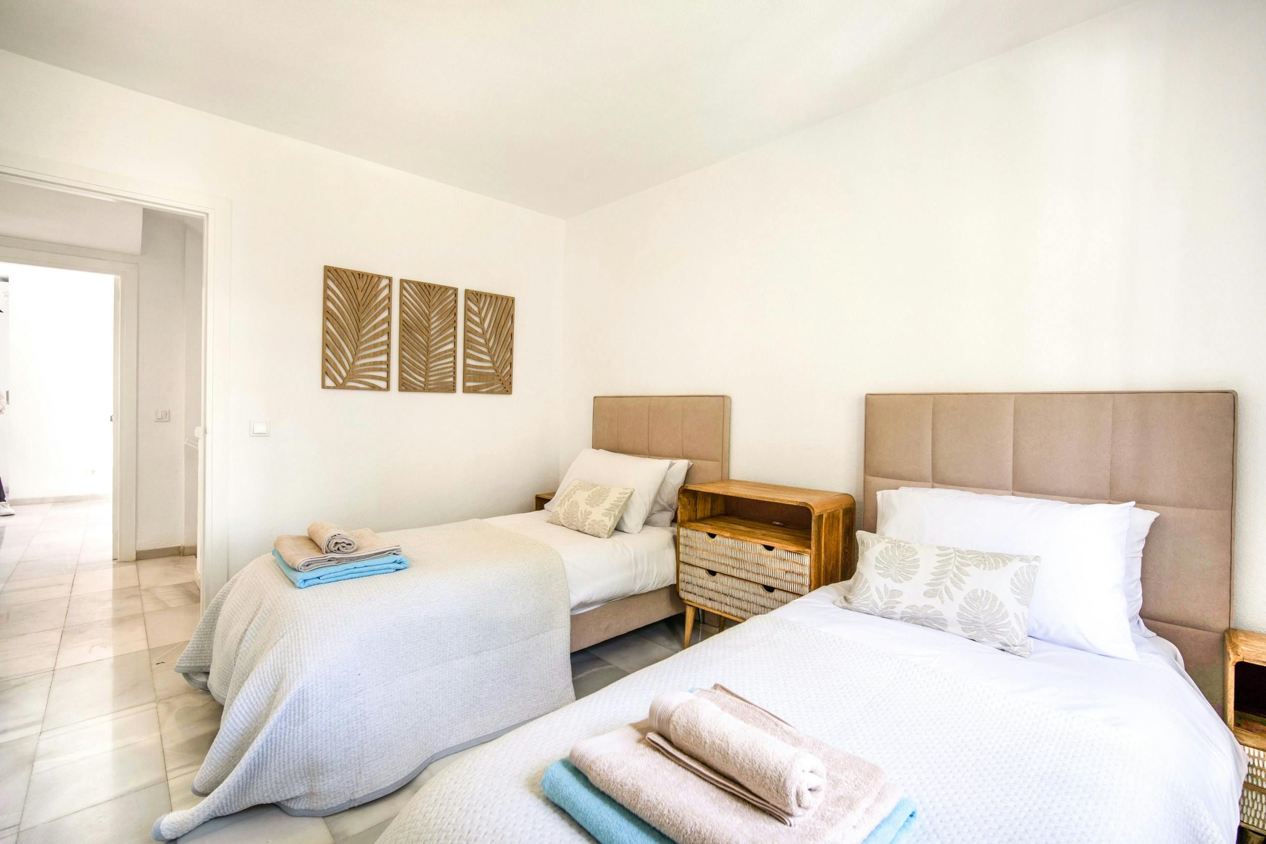 Just 100 metres from the sandy Casablanca Beach, you’ll find this three-storey townhouse. You can also take a stroll along the Paseo Maritimo to the old town of Marbella or indulge in Michelin-starred dining at the Puente Romano Resort. For those seeking active leisure pursuits, you can take part in kite surfing, horse riding and golf. So that’s the prime location, now the home itself. The outdoor space is great – there are two large terraces with a covered seating area, bar, sunbeds and barbeque and we love the sea glimpses from the roof terrace. There’s also a communal pool surrounded by lawns and palm trees and a tennis and paddle court. Inside, it’s light and airy and there’s plenty of room for entertaining.