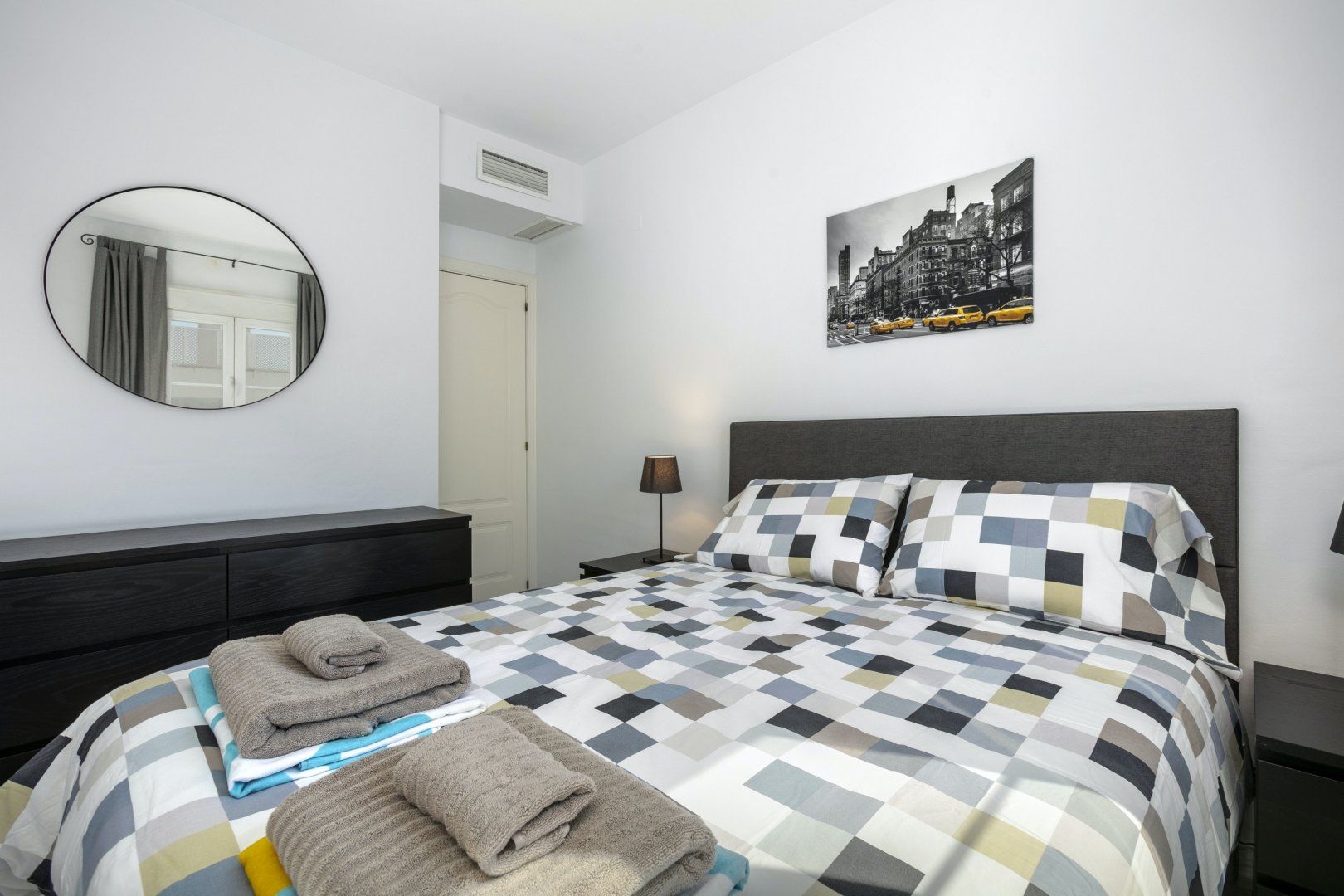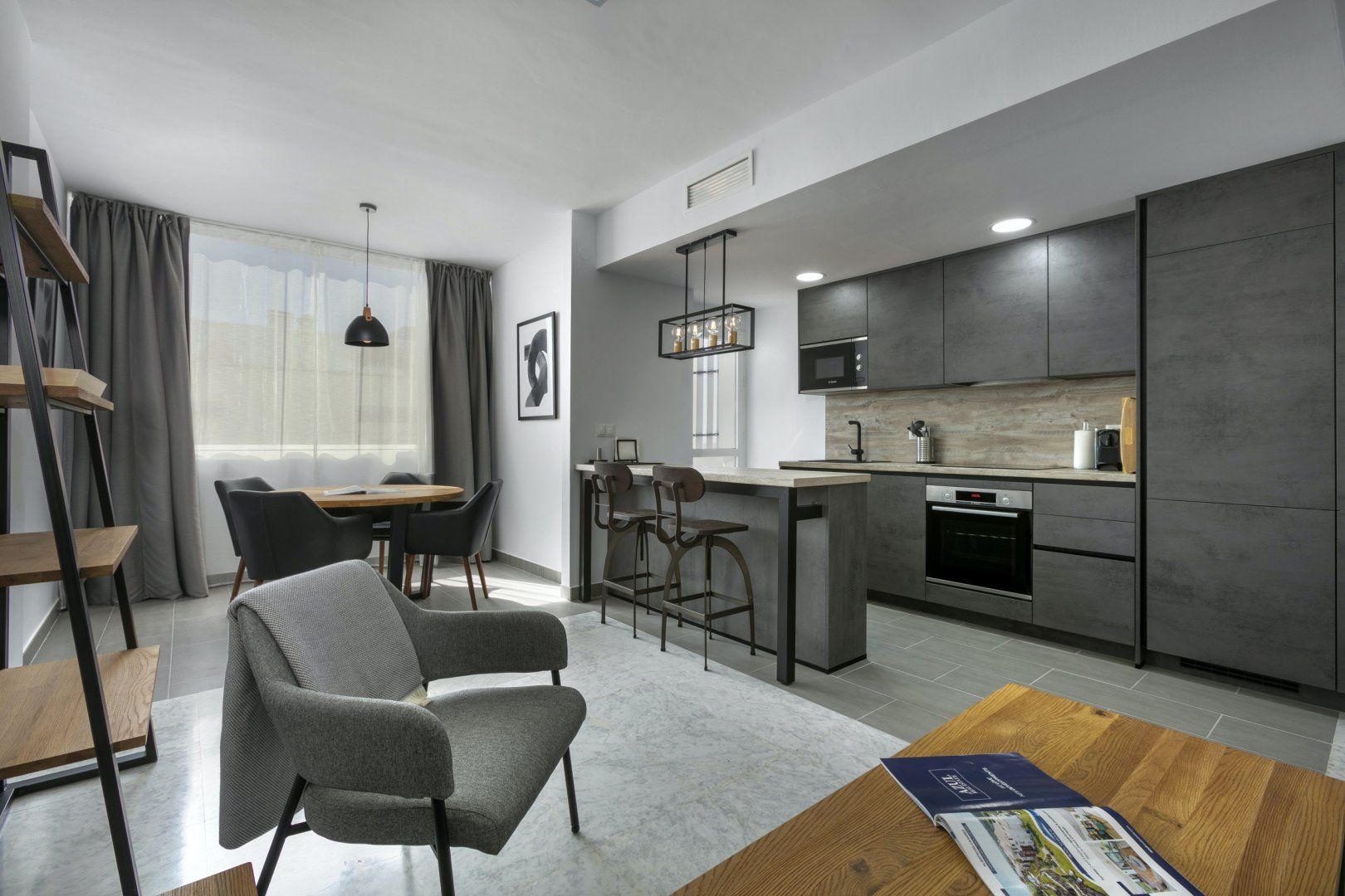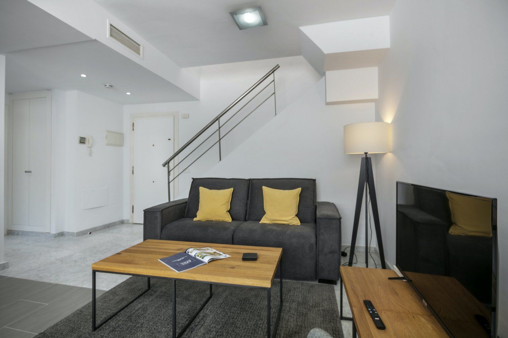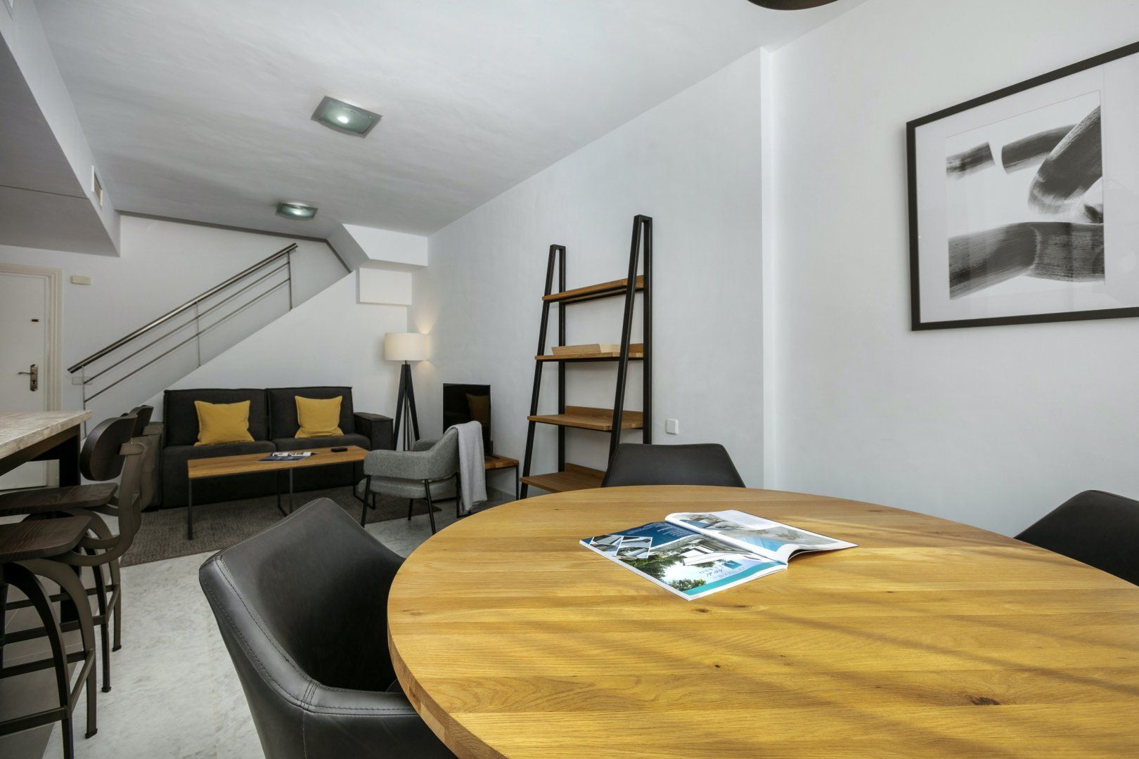 Escape to Marbella's ultra-exclusive Golden Mile and stay in this cool, contemporary apartment in a gorgeous resort-style coastal community. Inside, you'll be greeted by a monochrome masterpiece, with industrial-inspired steel framed furniture and statement lighting warmed by natural wooden accents throughout the stunning open-plan living area.