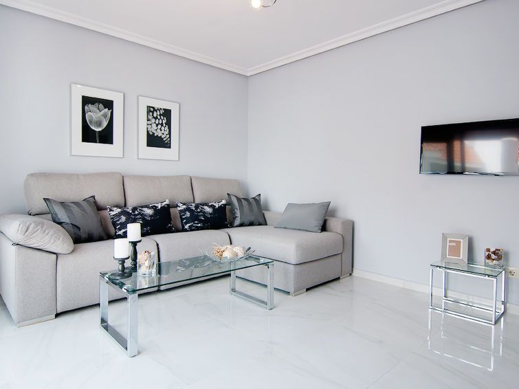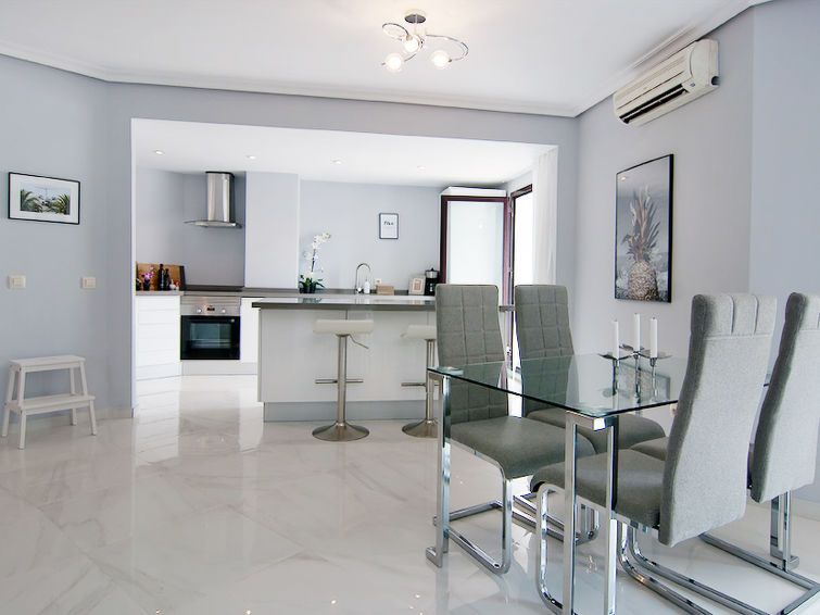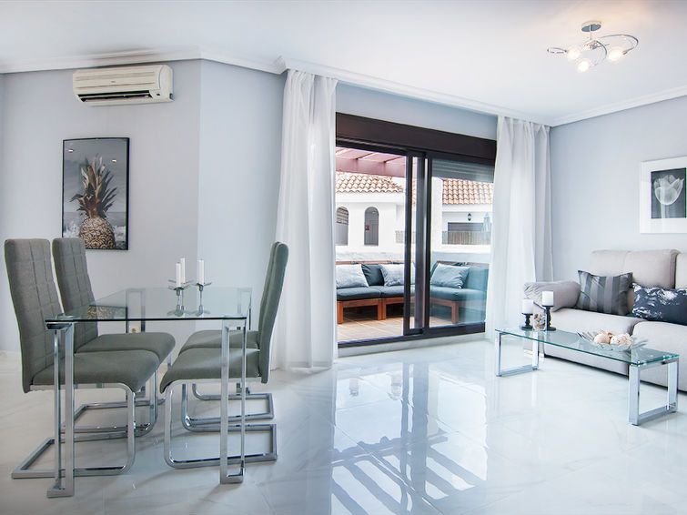 "La Maestranza", 3-room apartment 95 m2. Modern and tasteful furnishings: living/dining room with dining table and digital TV. Exit to the terrace. 1 room with 1 double bed and shower/WC (private). 1 room with 2 beds and bath/bidet/WC (private). Open kitchen (oven, dishwasher, 4 ceramic glass hob hotplates, microwave, freezer).