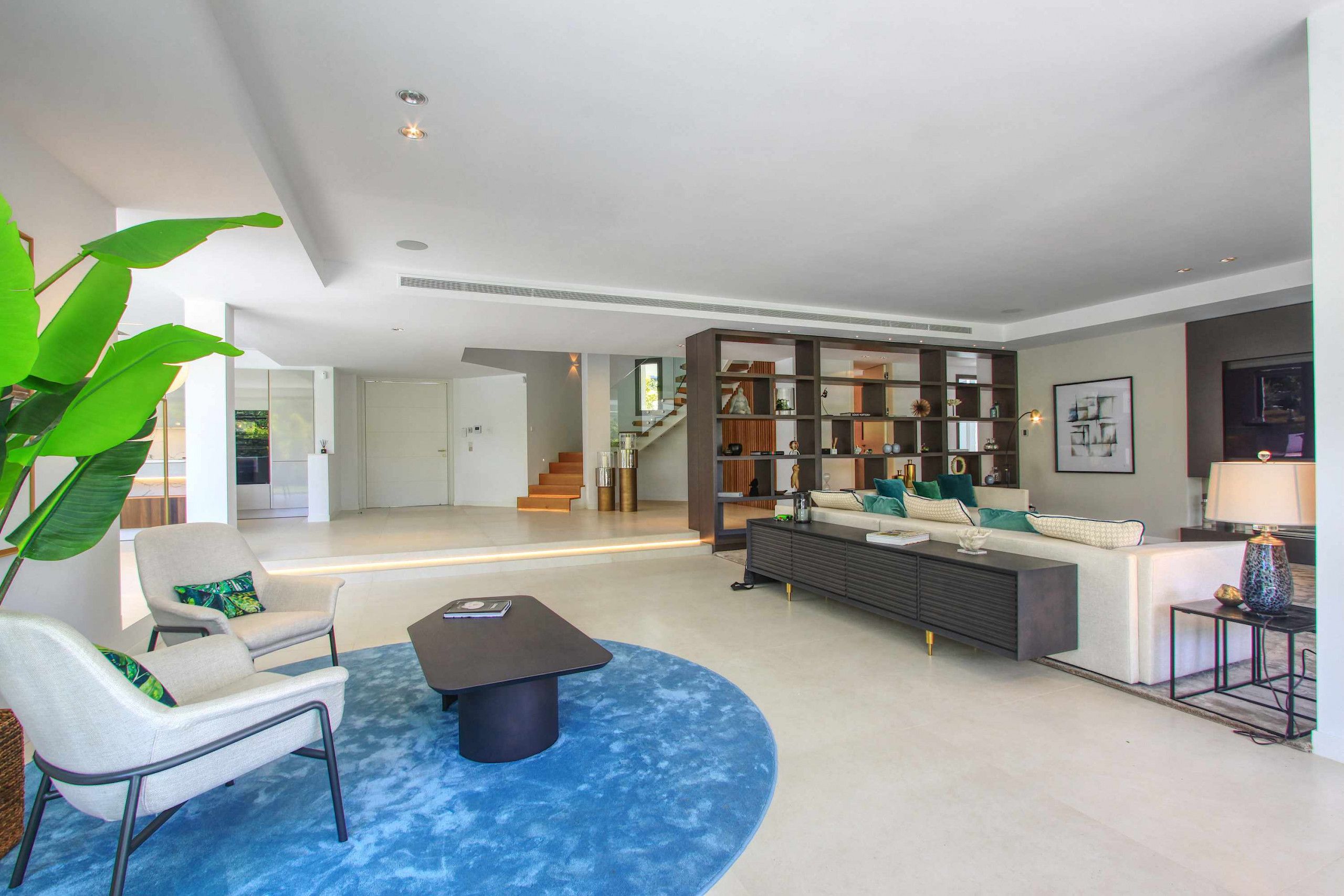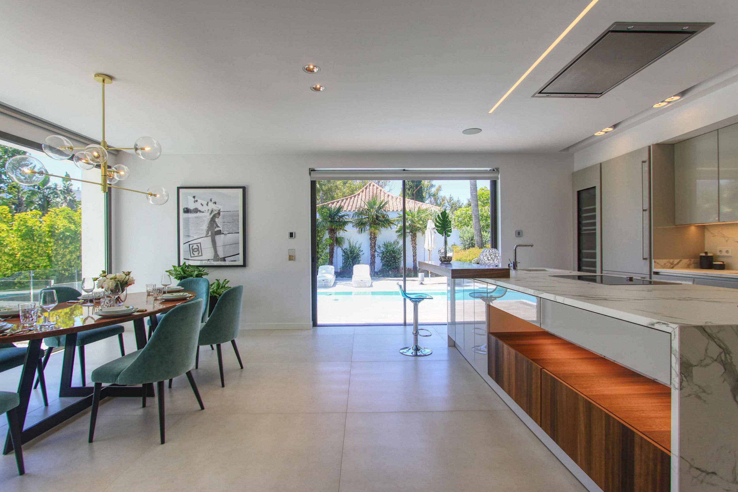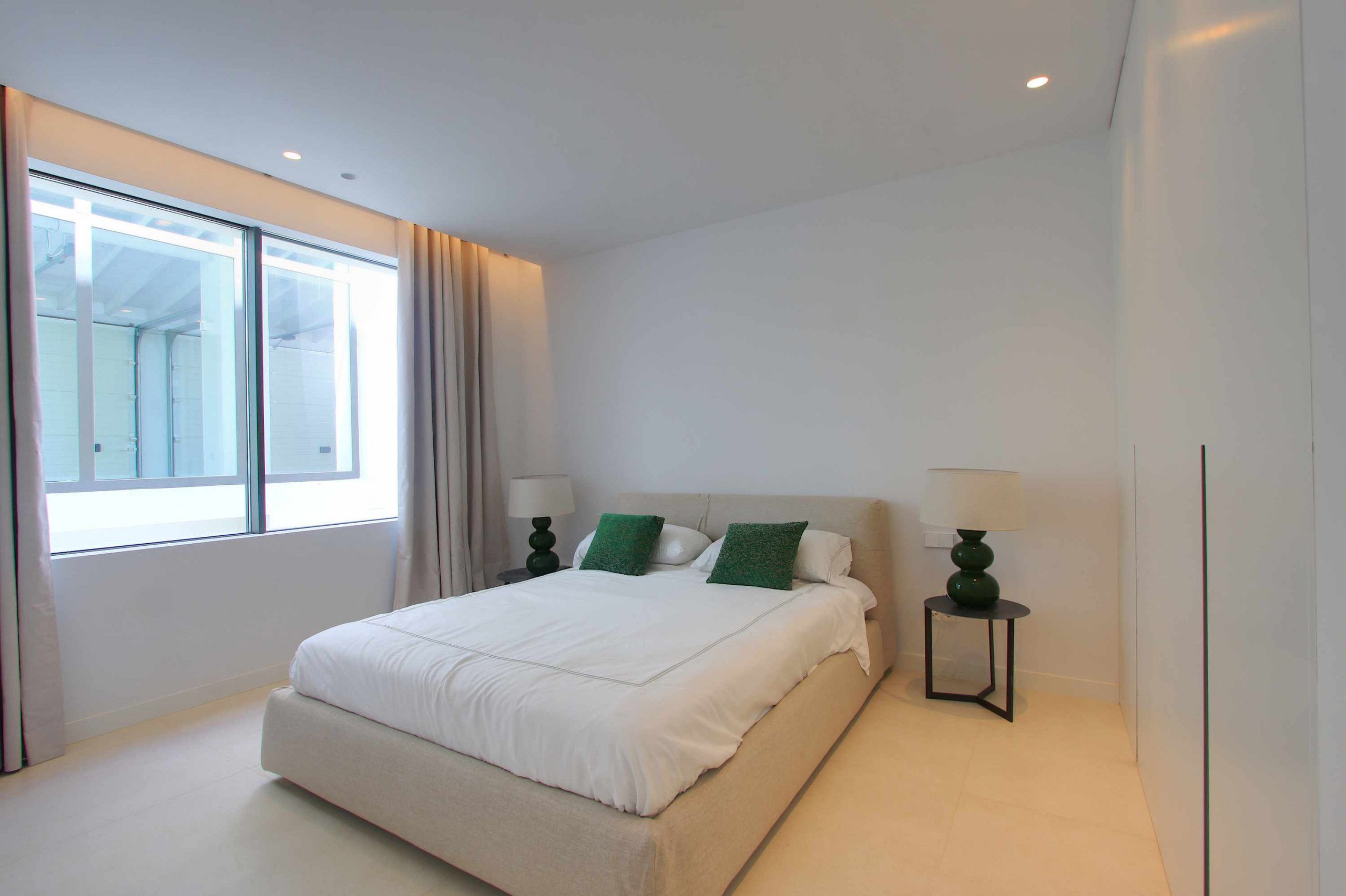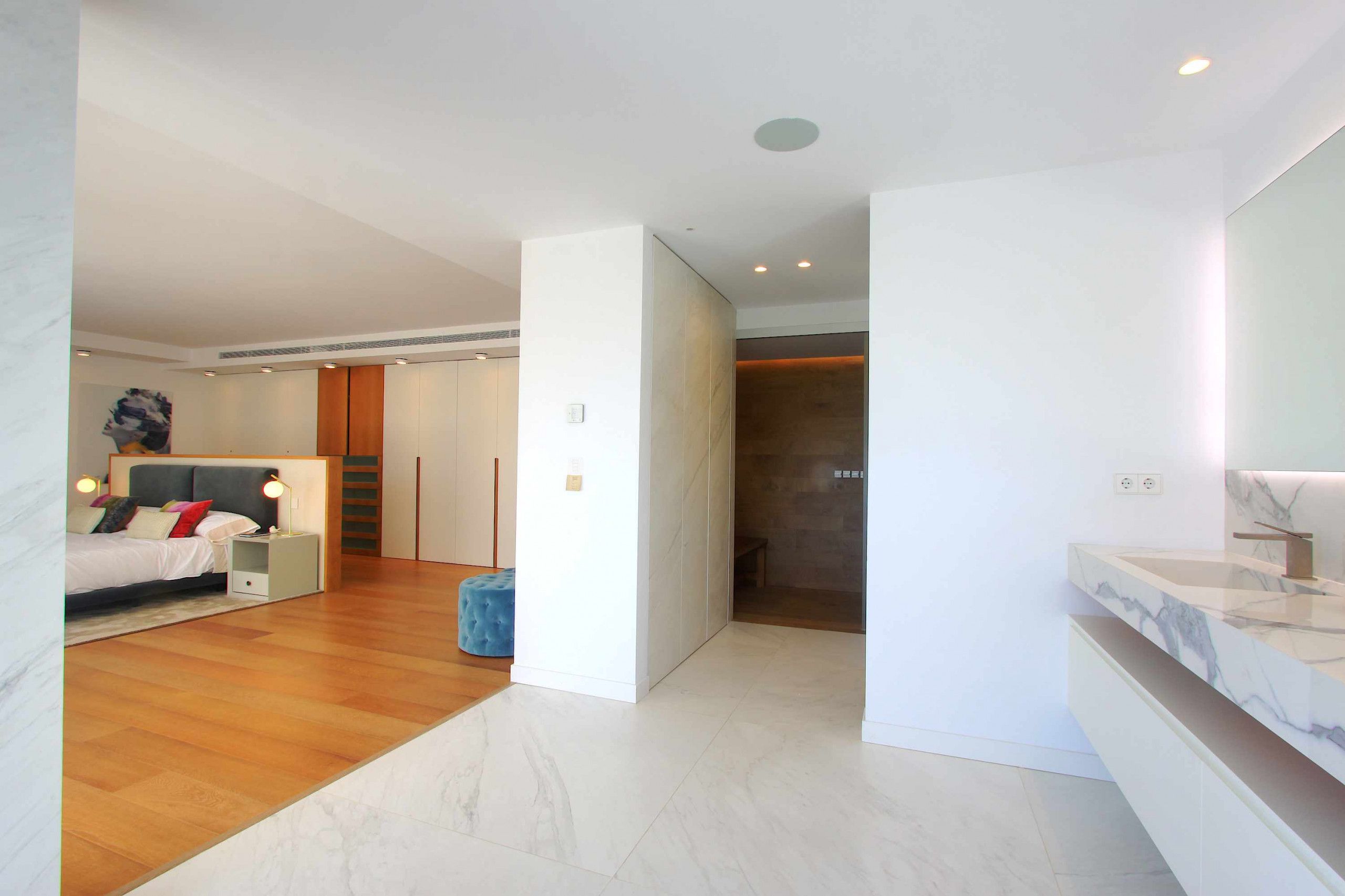 Inside, it’s impressive. Glass doors are automated, and can fold back to blend the huge living area with the terrace outside. Gallery-white walls let the quirky lighting fixtures above the dining table and plush velvet chairs speak for themselves. Yet, there’s something study-like about the main lounge with its wall of shelves showing off all manner of object d’art. The kitchen, with its long, marble-style bar, wouldn’t look out of place in a 1960’s entertainer’s LA pad. Then there are the bedrooms which embrace the sunny climes with floor-to-ceiling windows and glass doors.