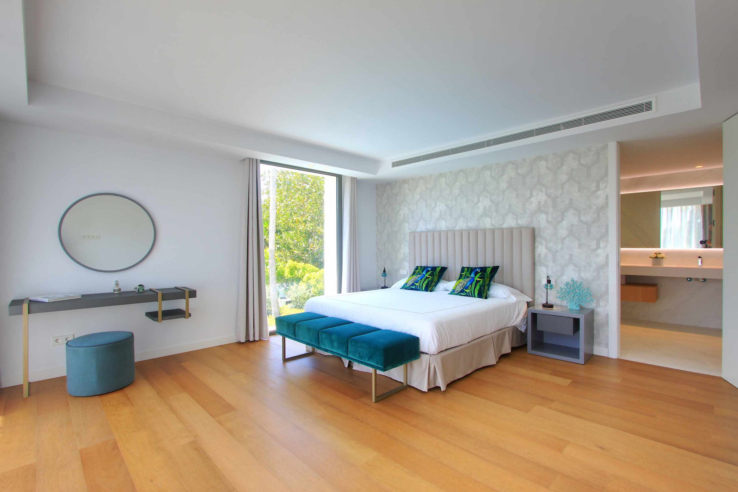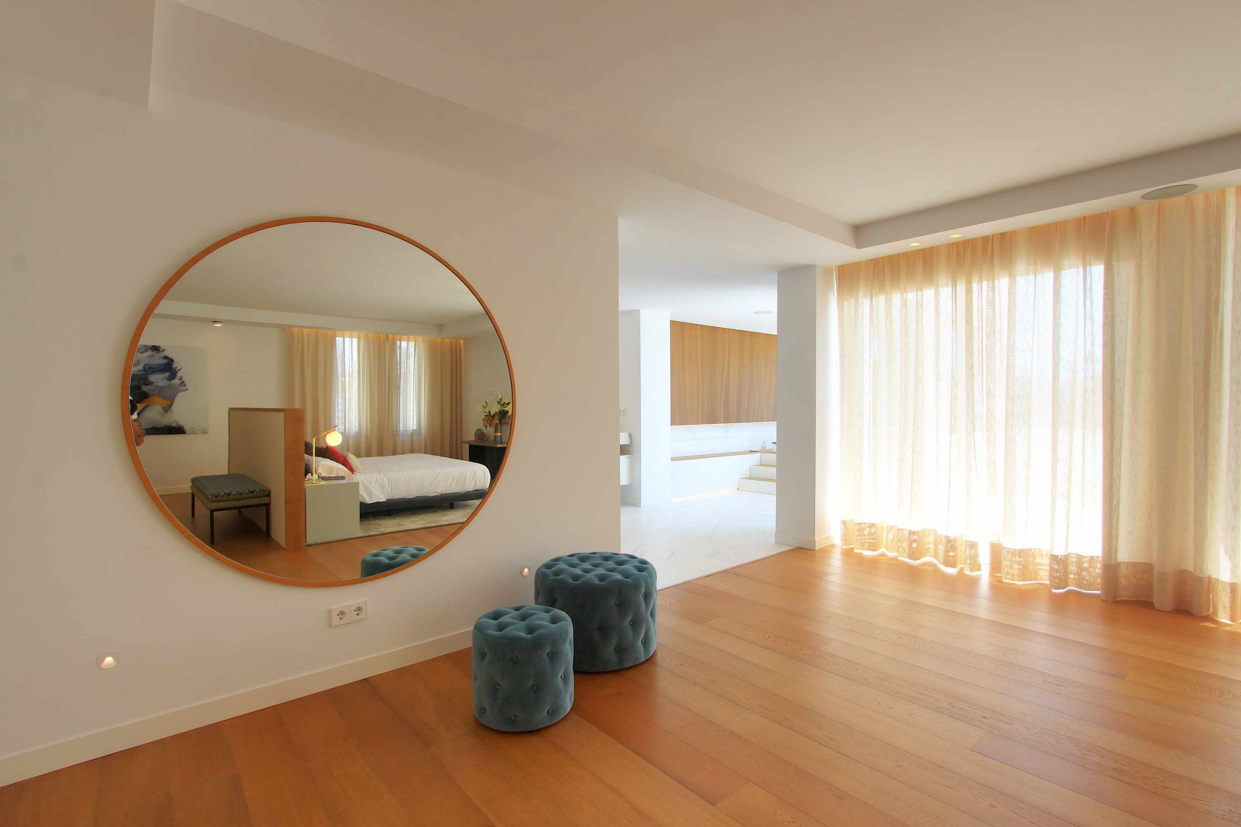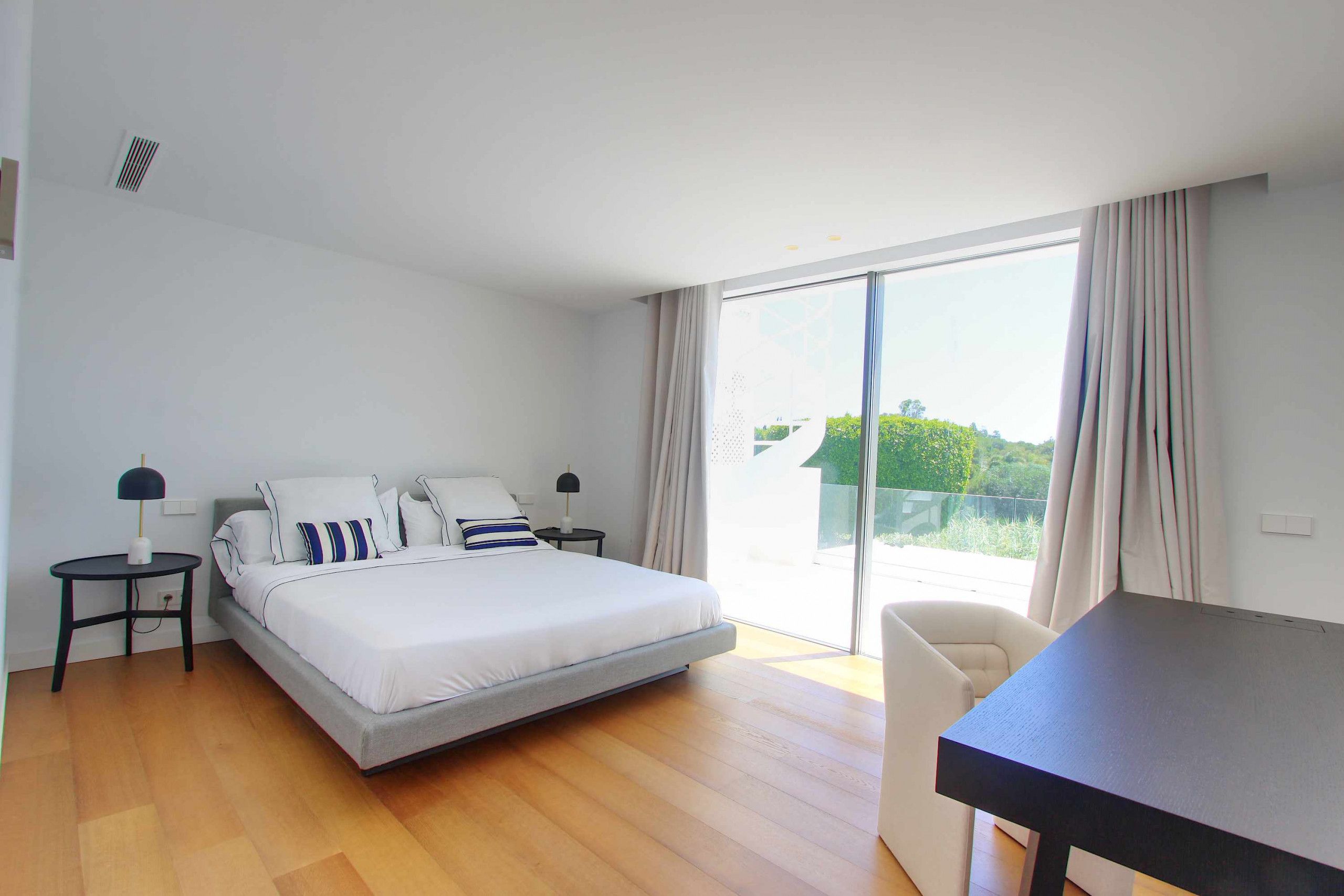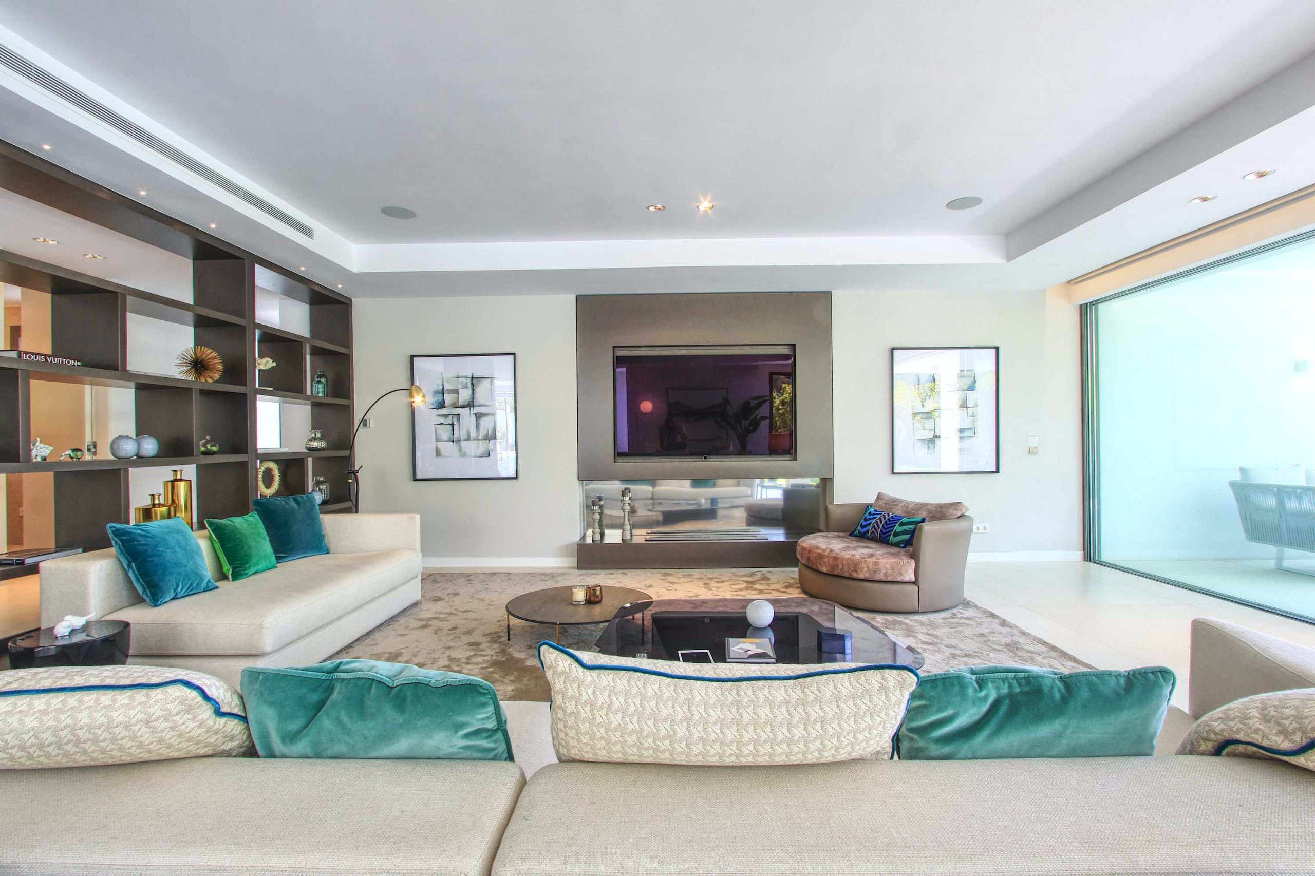 Inside, it’s impressive. Glass doors are automated, and can fold back to blend the huge living area with the terrace outside. Gallery-white walls let the quirky lighting fixtures above the dining table and plush velvet chairs speak for themselves. Yet, there’s something study-like about the main lounge with its wall of shelves showing off all manner of object d’art. The kitchen, with its long, marble-style bar, wouldn’t look out of place in a 1960’s entertainer’s LA pad. Then there are the bedrooms which embrace the sunny climes with floor-to-ceiling windows and glass doors.