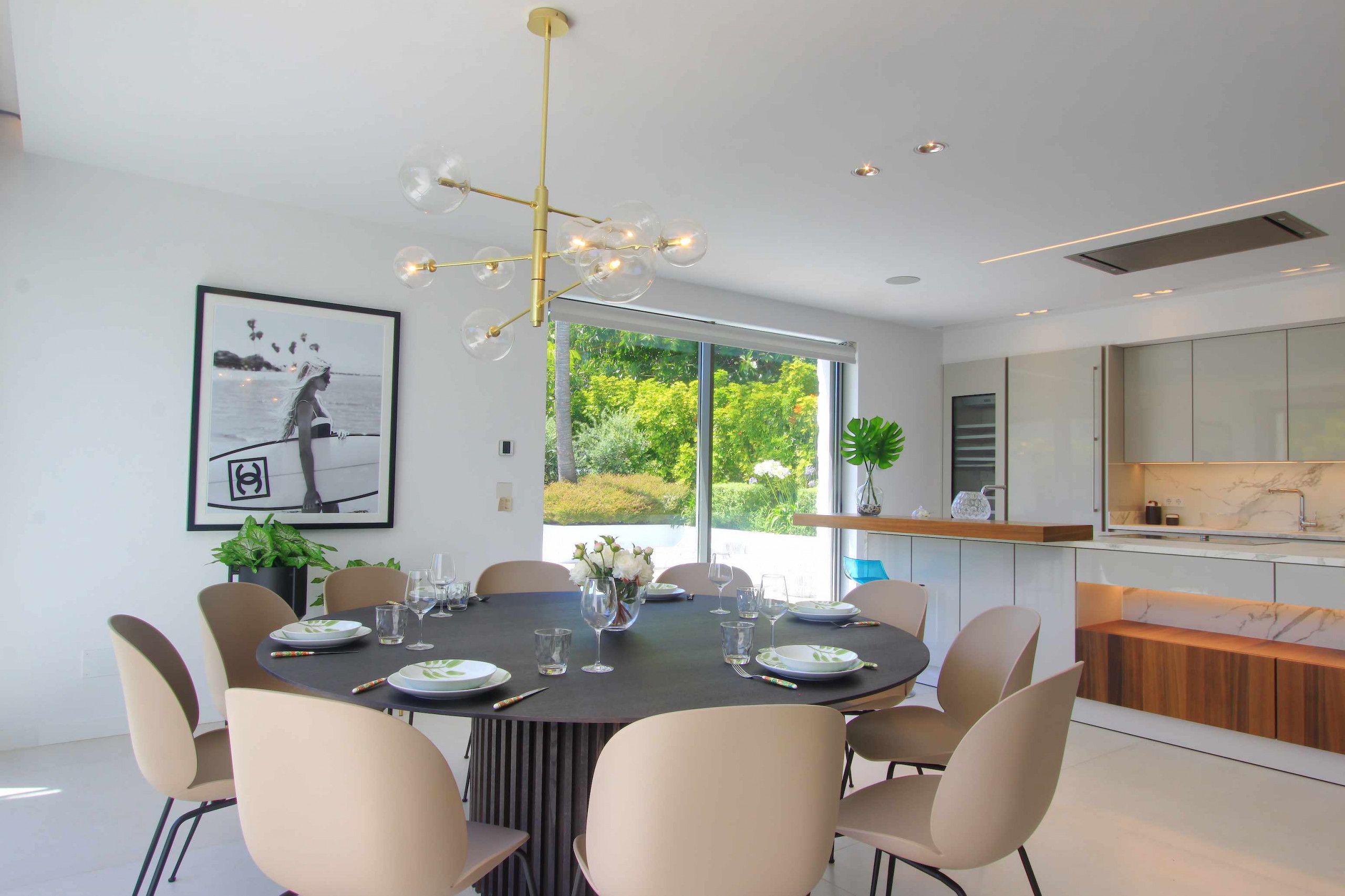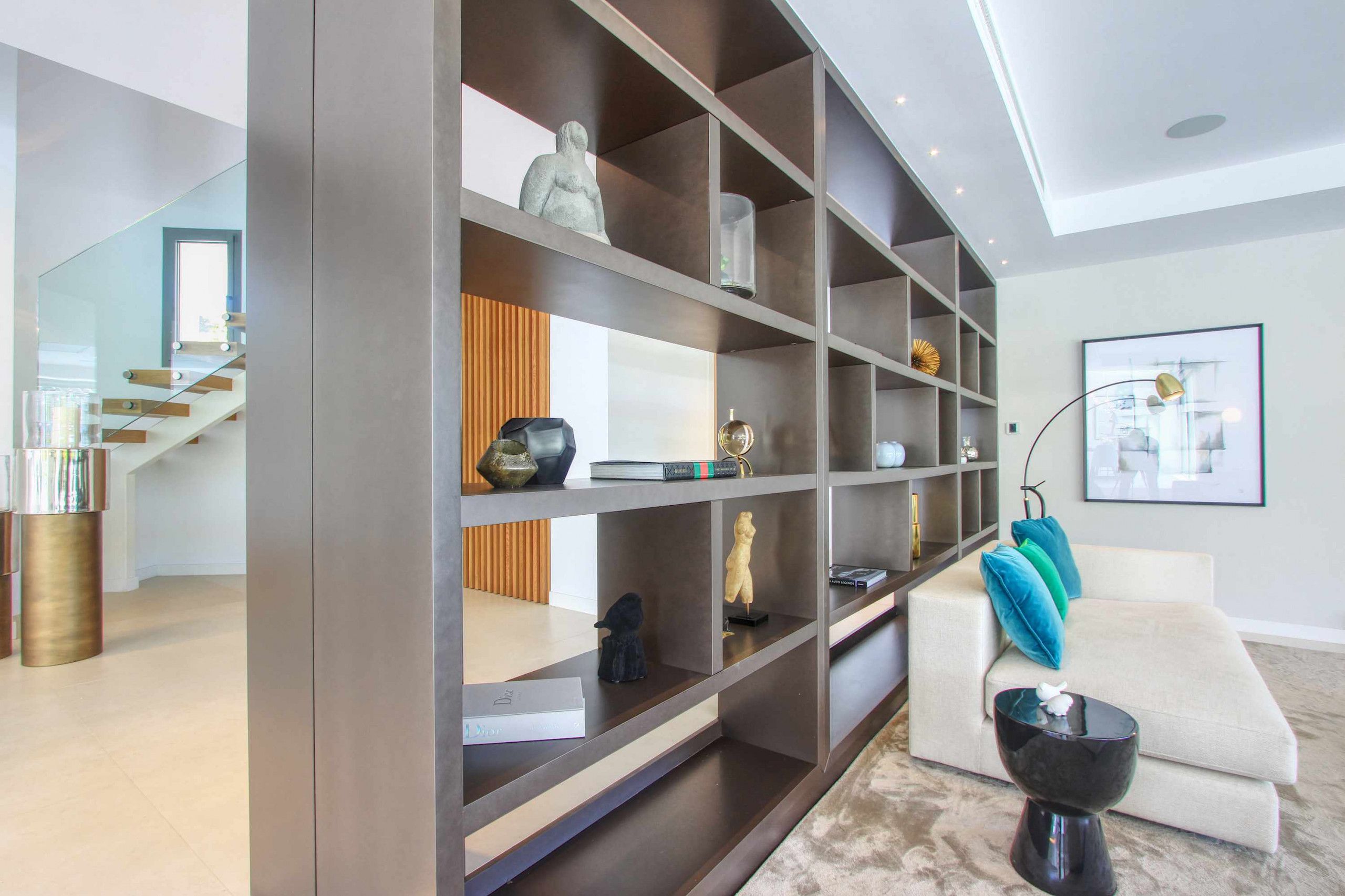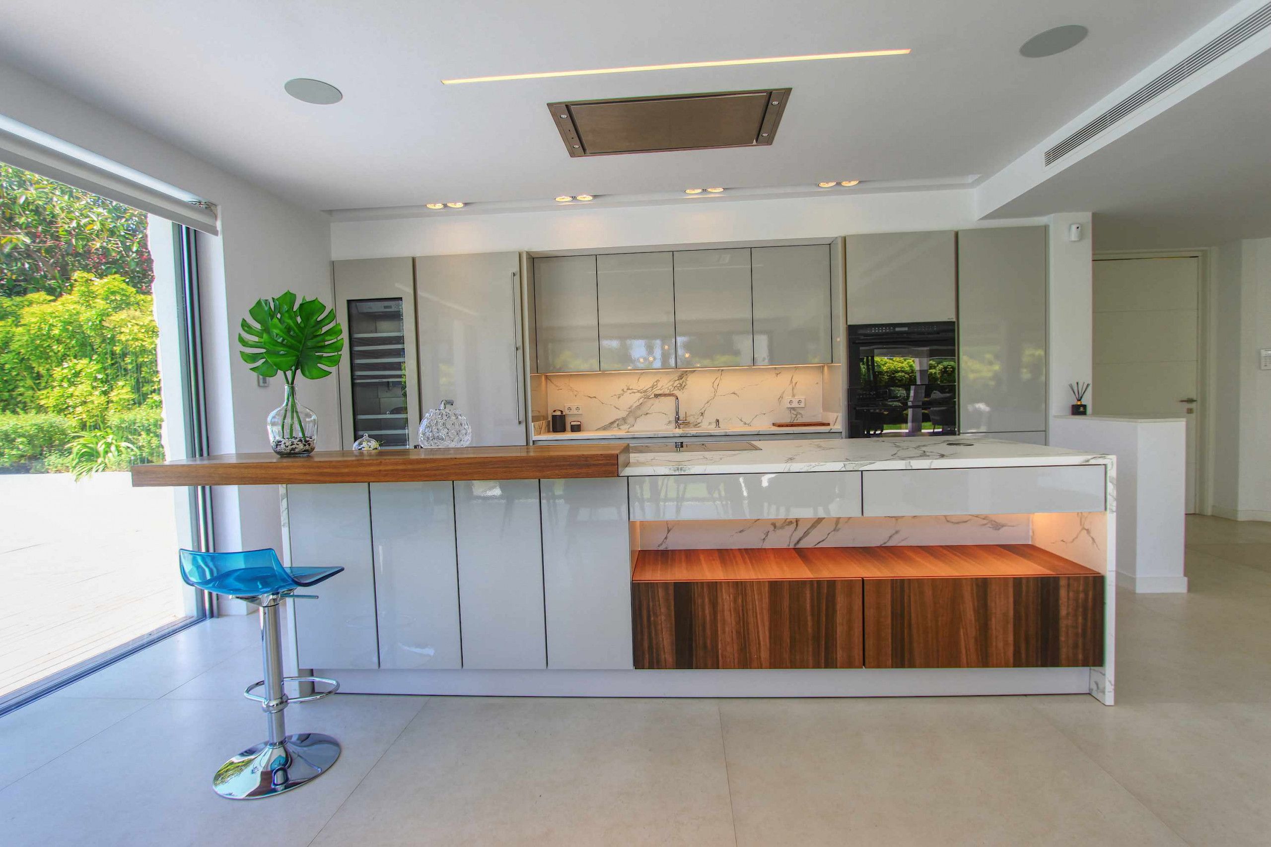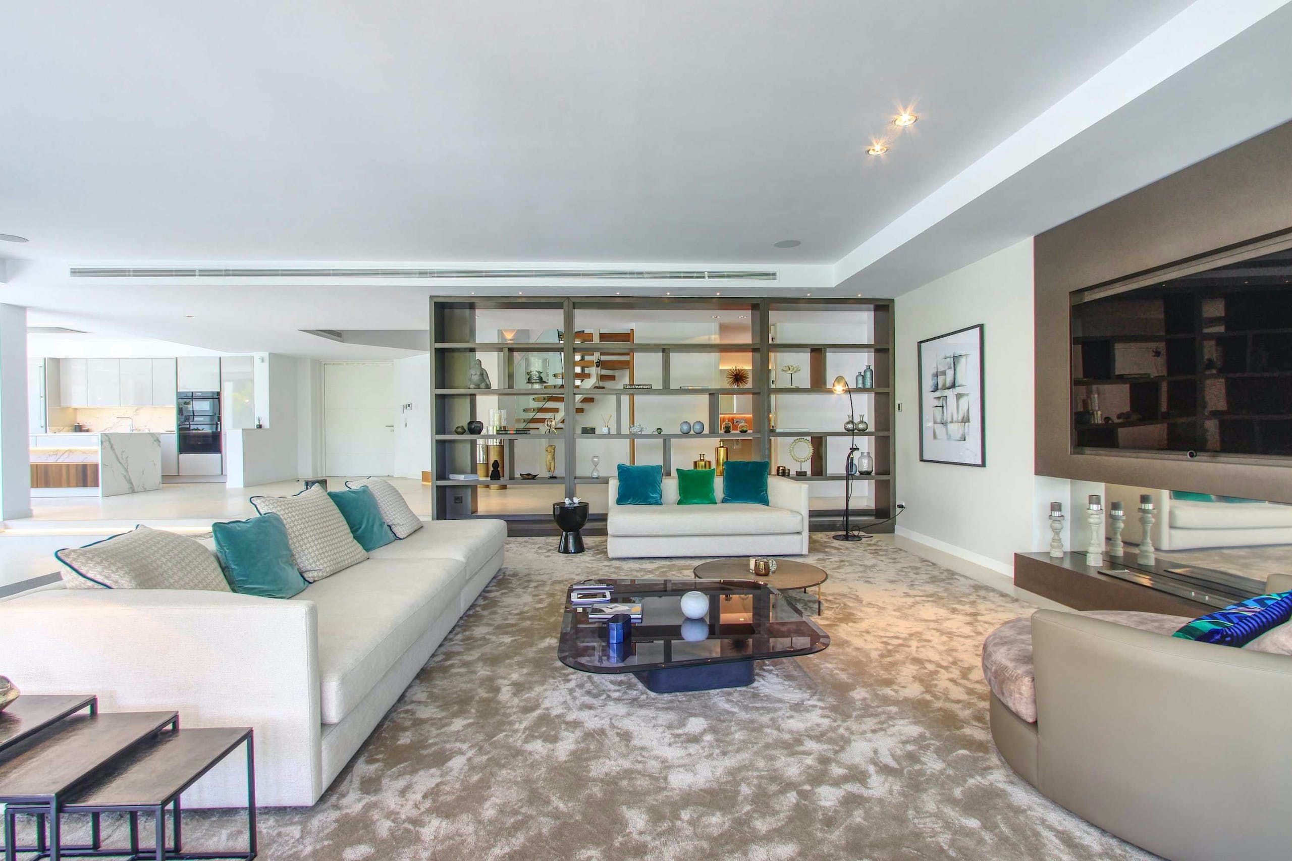 Inside, it’s impressive. Glass doors are automated, and can fold back to blend the huge living area with the terrace outside. Gallery-white walls let the quirky lighting fixtures above the dining table and plush velvet chairs speak for themselves. Yet, there’s something study-like about the main lounge with its wall of shelves showing off all manner of object d’art. The kitchen, with its long, marble-style bar, wouldn’t look out of place in a 1960’s entertainer’s LA pad. Then there are the bedrooms which embrace the sunny climes with floor-to-ceiling windows and glass doors.