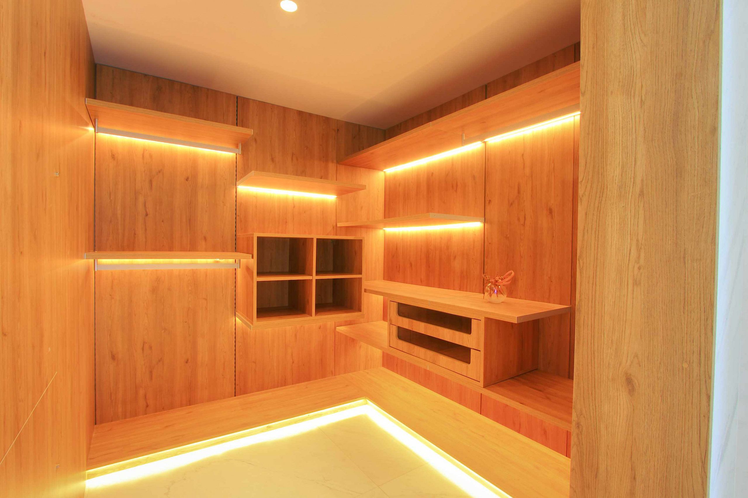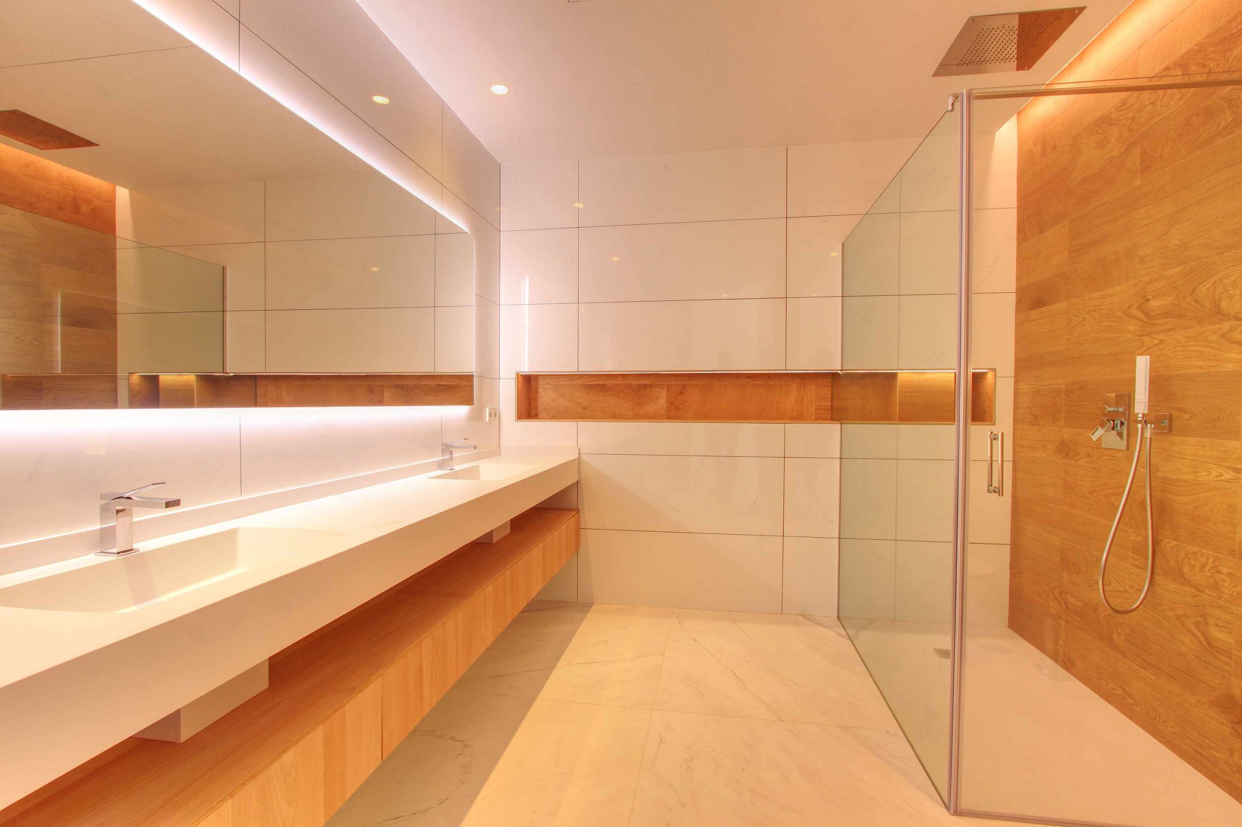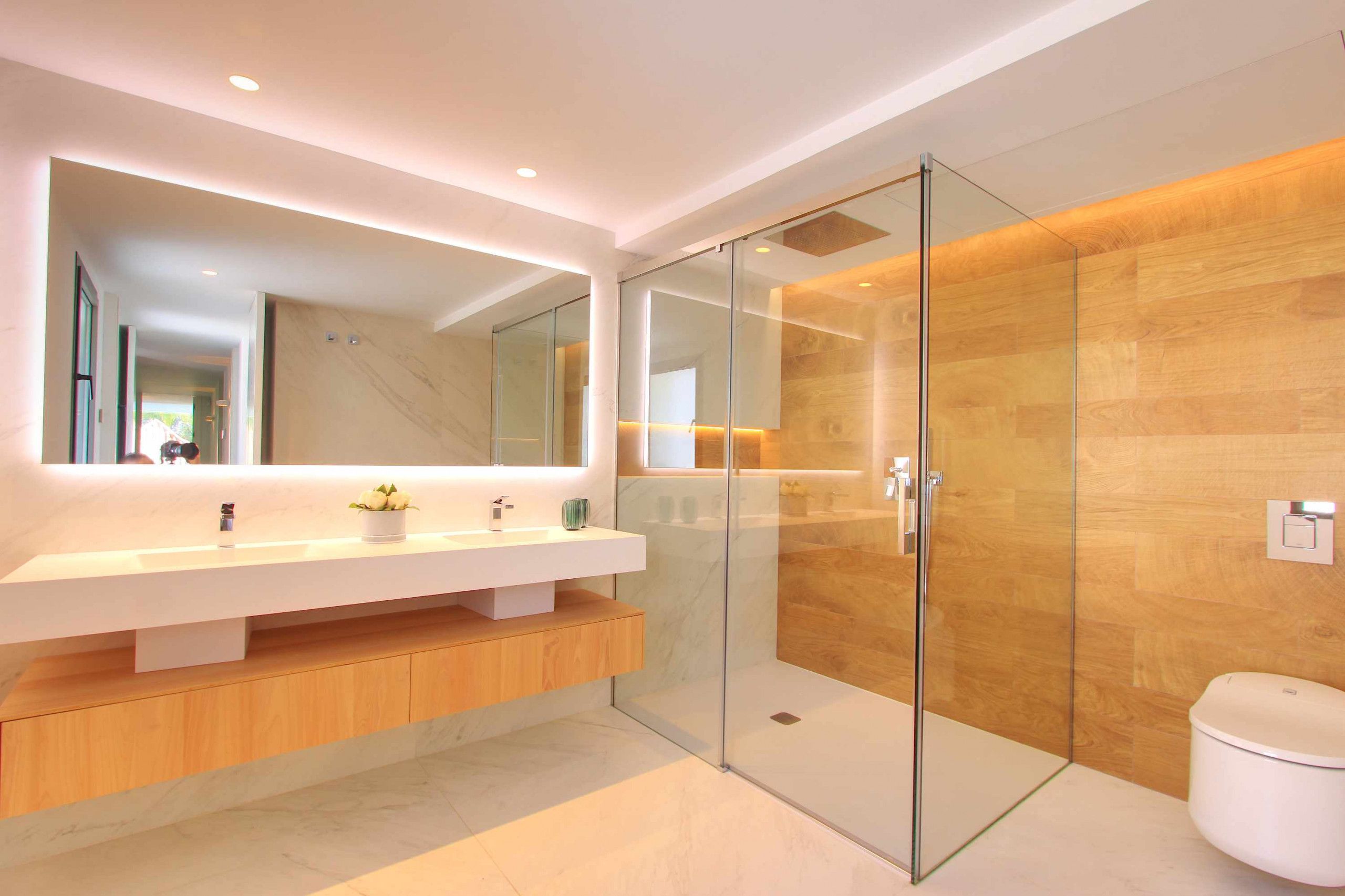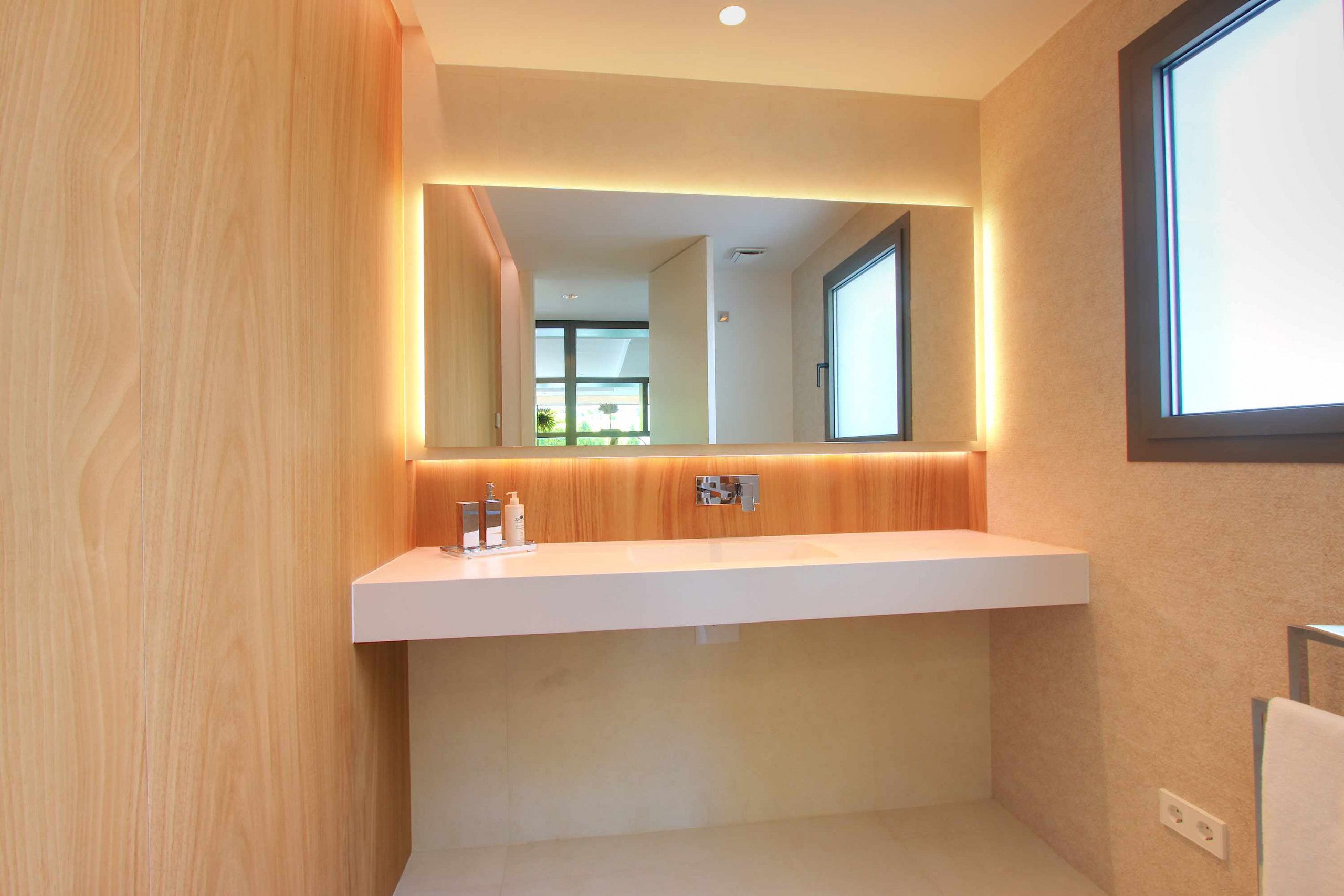 Inside, it’s impressive. Glass doors are automated, and can fold back to blend the huge living area with the terrace outside. Gallery-white walls let the quirky lighting fixtures above the dining table and plush velvet chairs speak for themselves. Yet, there’s something study-like about the main lounge with its wall of shelves showing off all manner of object d’art. The kitchen, with its long, marble-style bar, wouldn’t look out of place in a 1960’s entertainer’s LA pad. Then there are the bedrooms which embrace the sunny climes with floor-to-ceiling windows and glass doors.