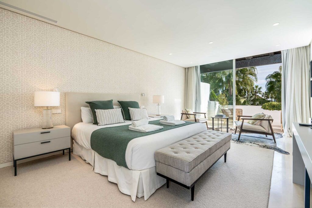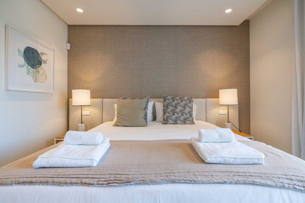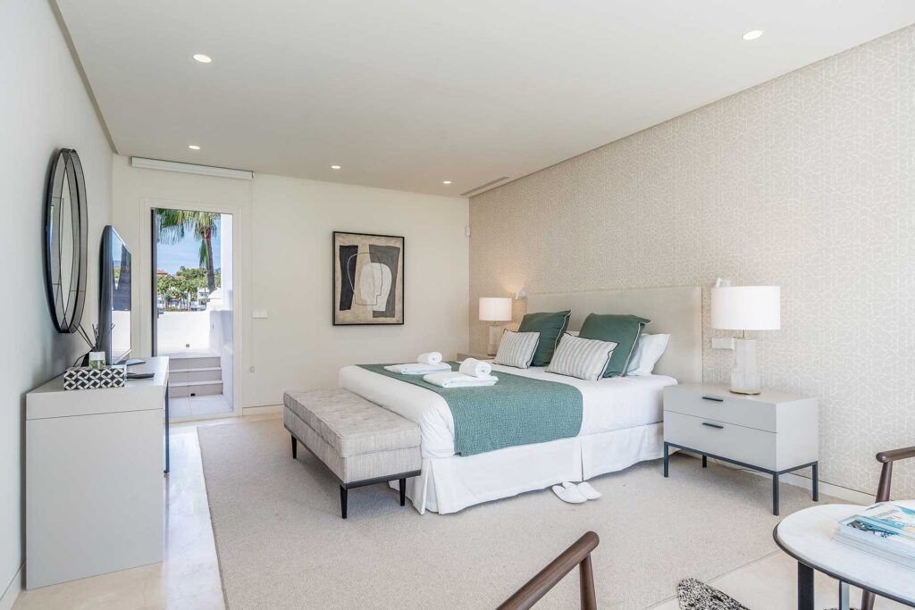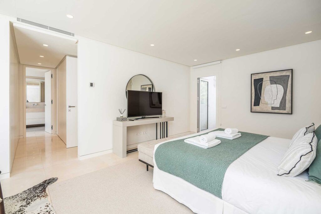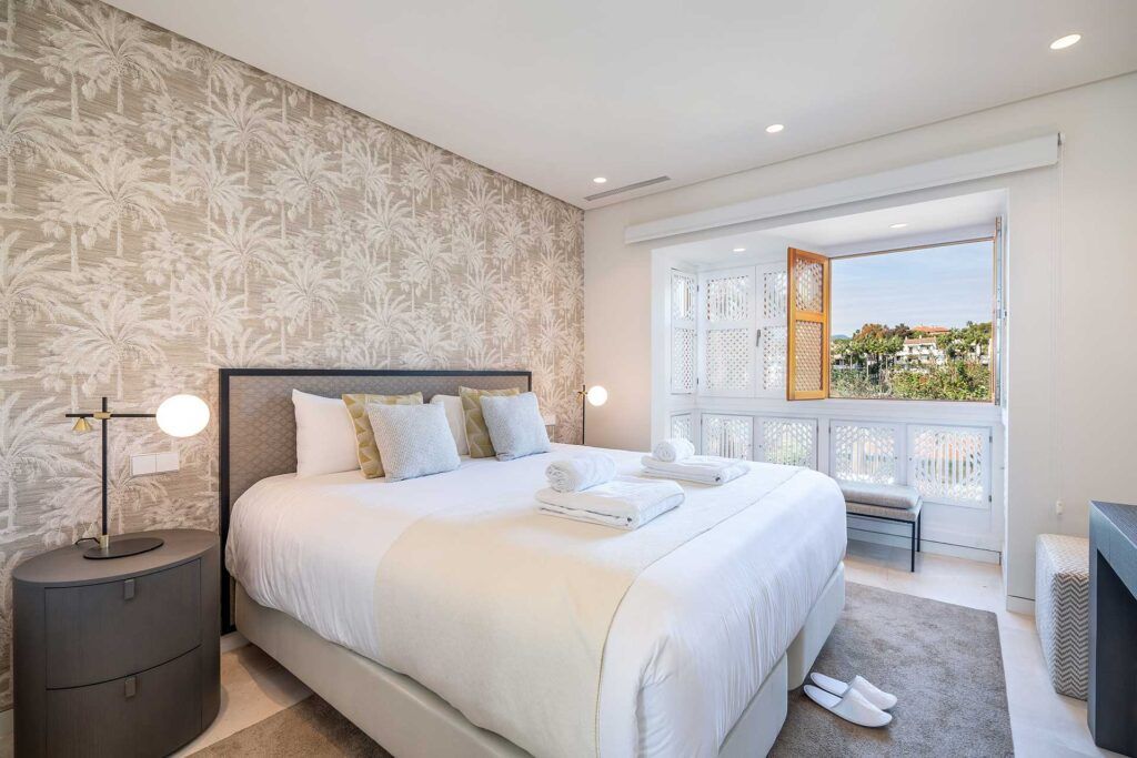 With a contemporary and minimalist aesthetic – the soft white colour palette, sleek black accents and thoughtful choices of modern lighting fixtures – it is at once effortlessly cool and breezy. Sip your morning coffee on the balcony or whip up a Mediterranean breakfast in the slick marble kitchen before stretching out on your balcony loungers for a sun-soaking session. There’s a tranquil atmosphere that invites you to wind down on the plump sofas after a memorable day watching a tennis tournament on the courts below your apartment. When evening rolls around, have a private chef prepare you an unforgettable feast to share in the charming dining room, illuminated by the Joe Colombo Coupe Arc lamp. For a night of restful sleep, sink into your plush king-sized bed enveloped in soft tones. Factor in the marbled spa-like bathtub and you’ve got everything you may need to make your stay here a restorative one.