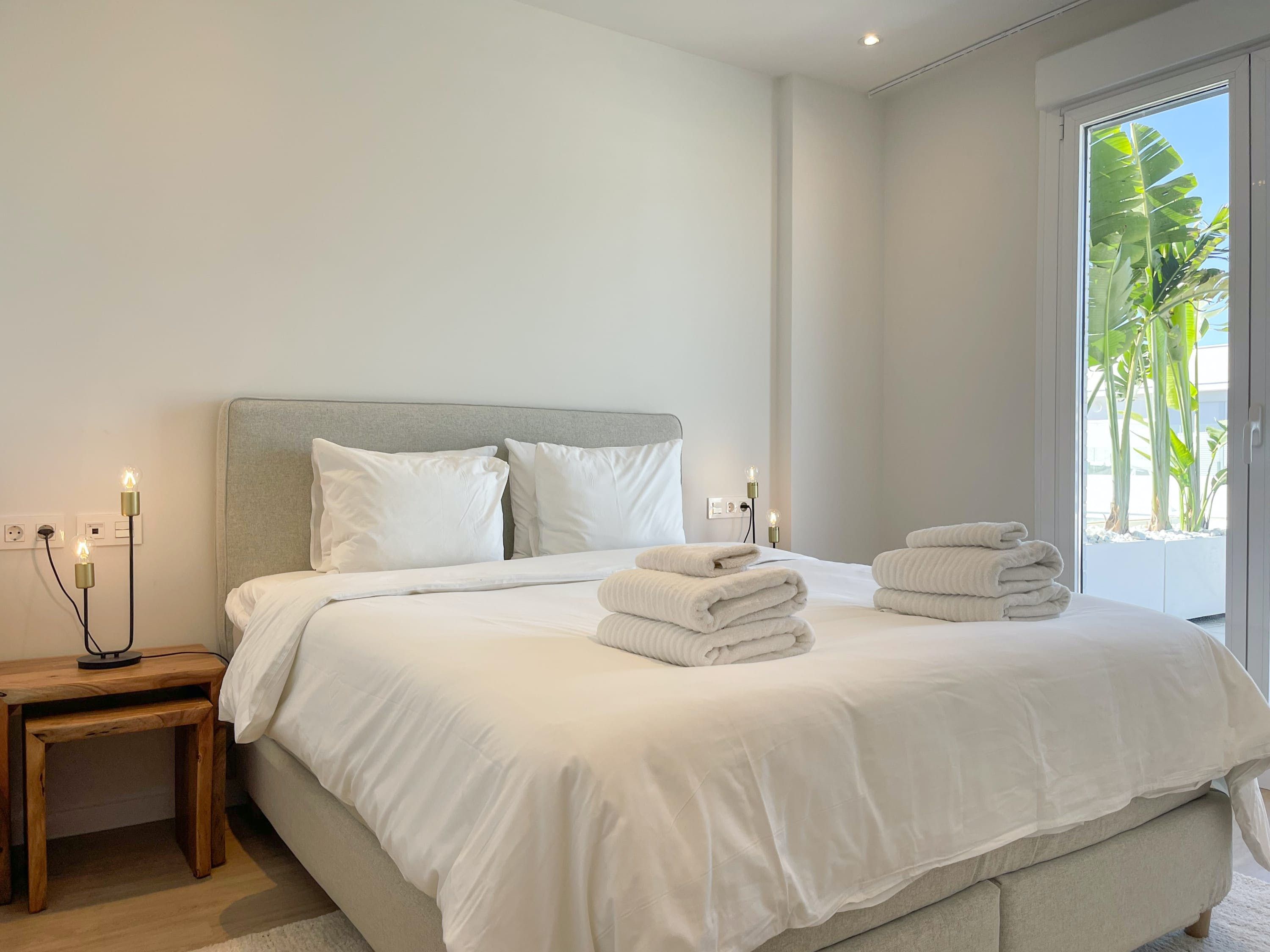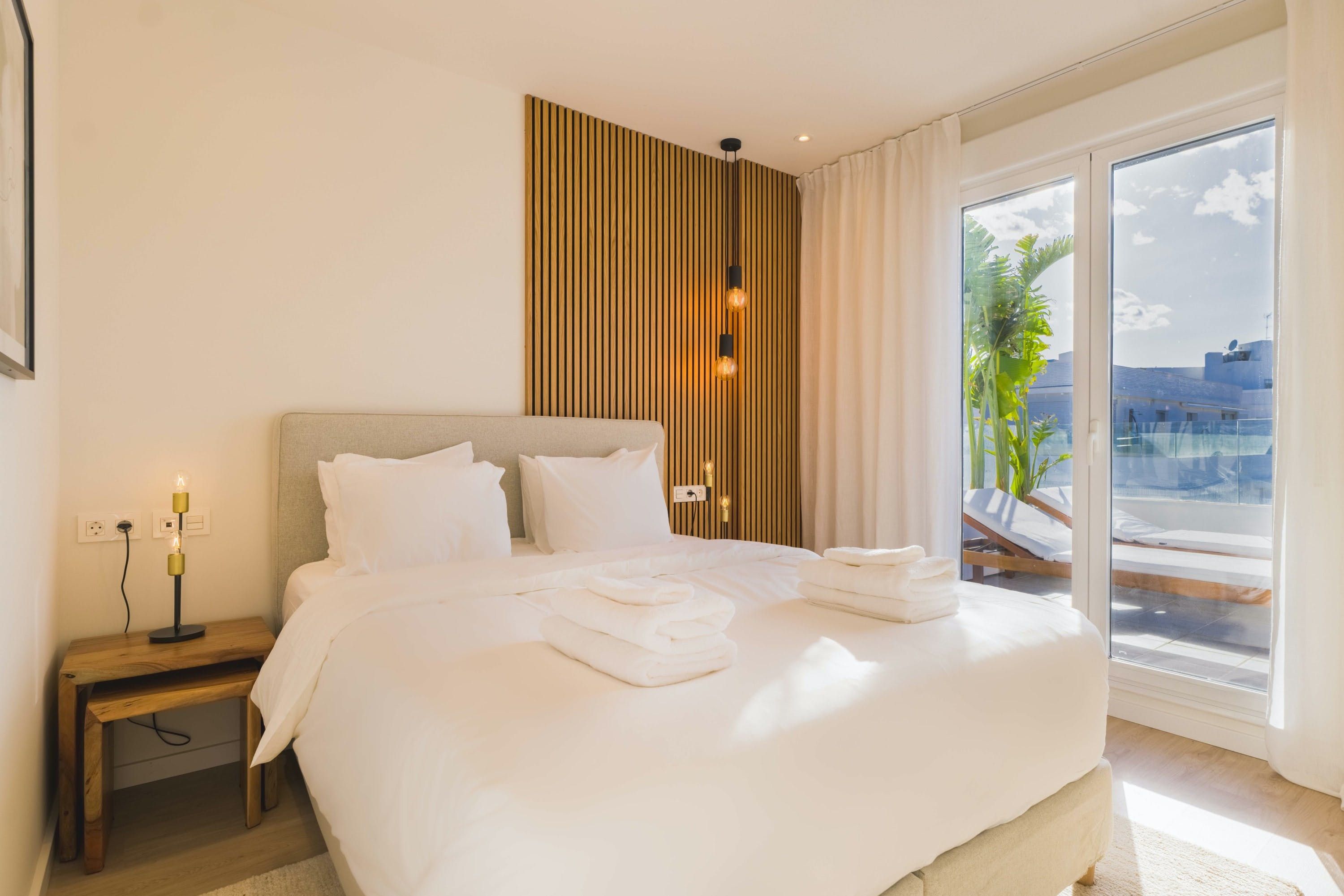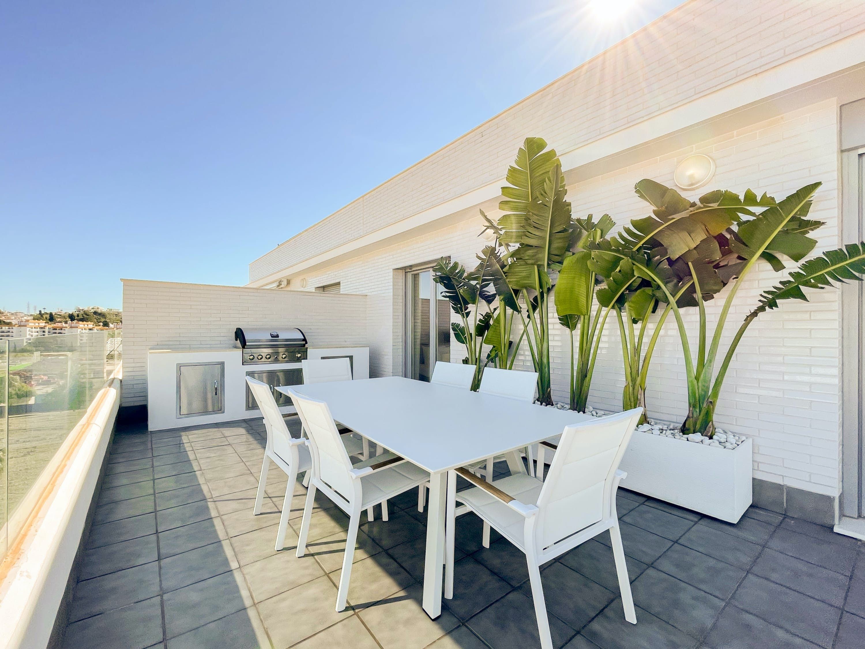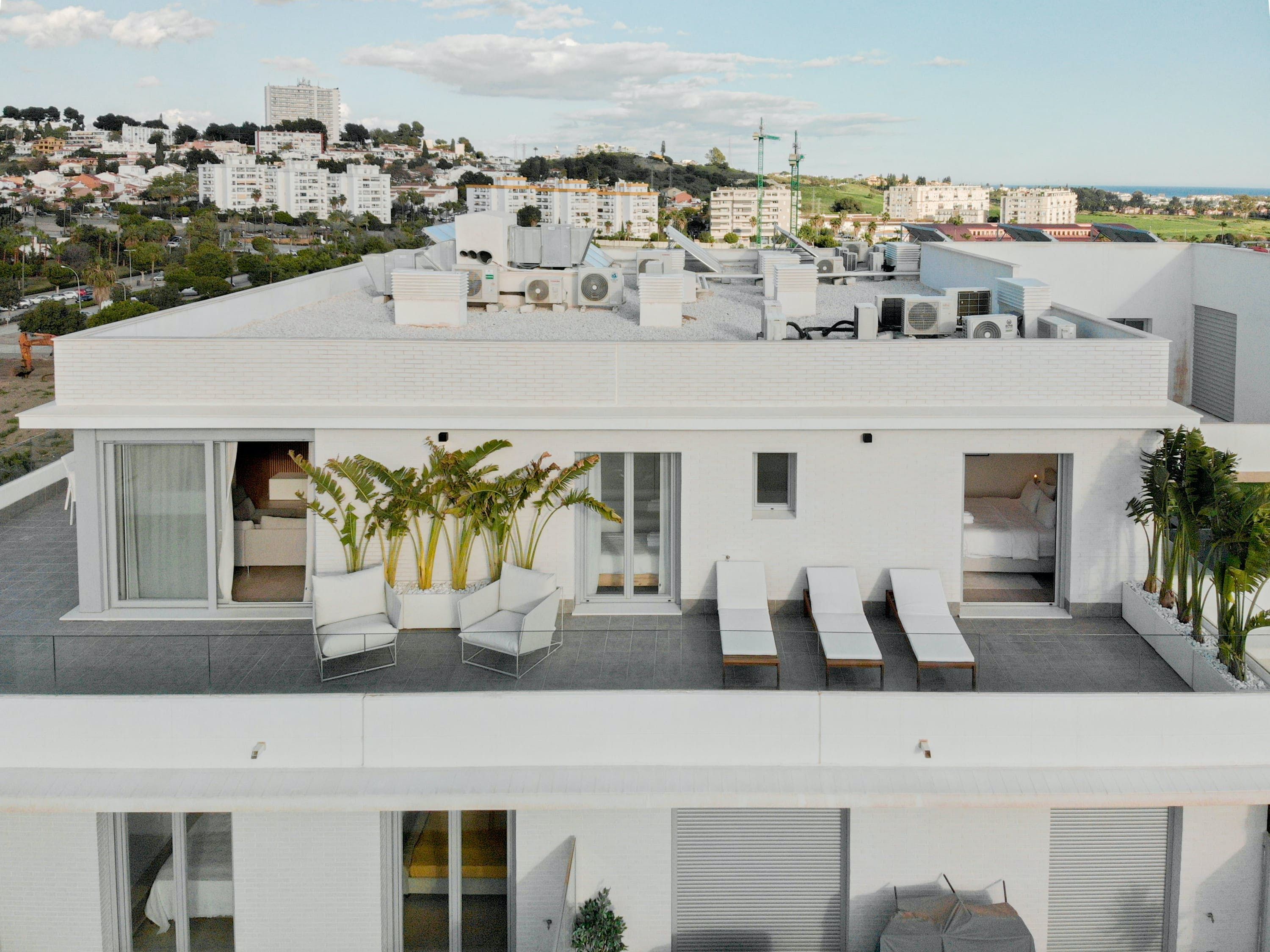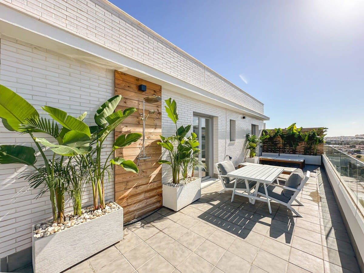 Just look at the beautiful sea views from this home’s shared rooftop pool (open from the 1st of May until the 1st of October). There’s a private wraparound terrace at this apartment, too – perfect for watching the sunrise over the Mediterranean. There are only four sunloungers, so you may need to pop your towel on one to claim it, but there's a sofa and dining area as well. We love that the bedrooms open out onto the balcony too. This development is within walking distance of San Pedro de Alcántara with its restaurants, bars and beaches, while glitzy Marbella is around a twenty-minute drive away.