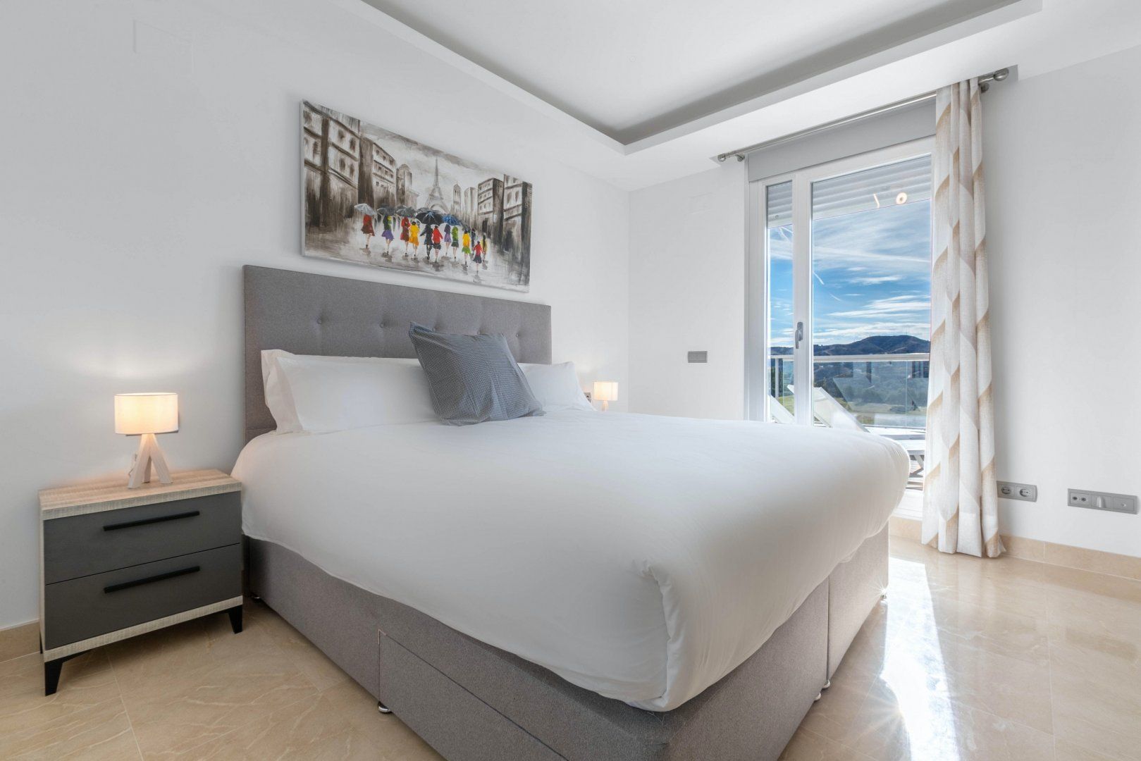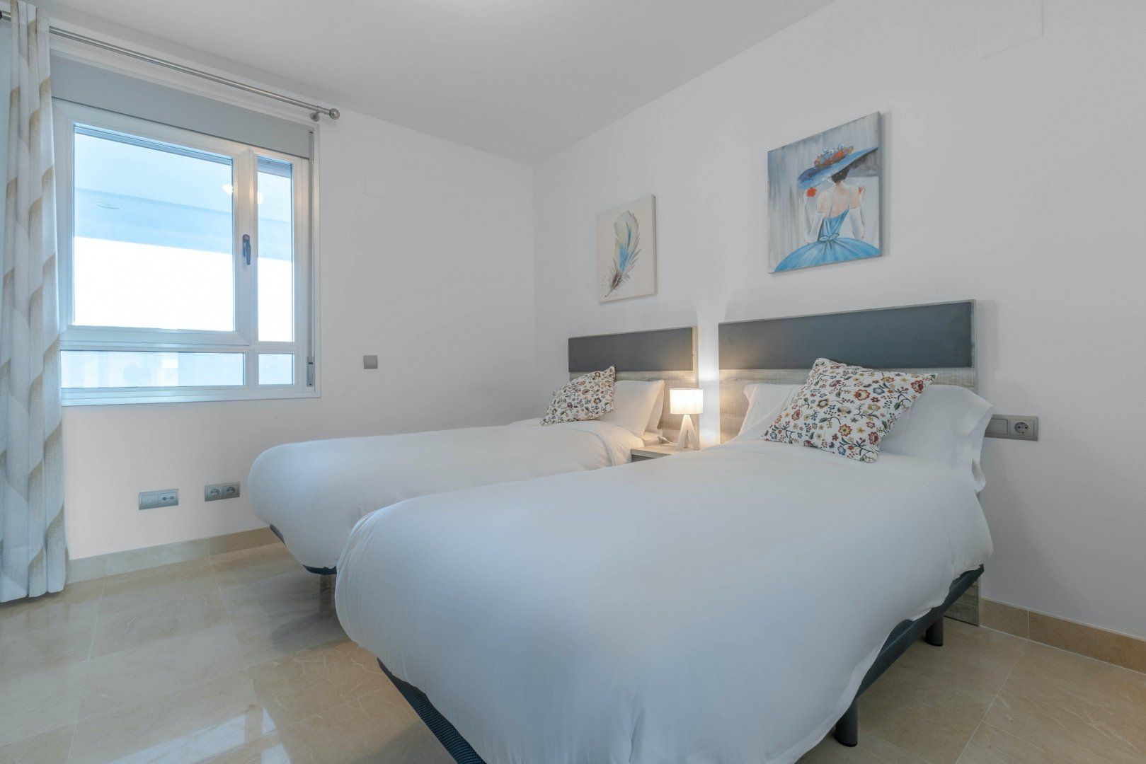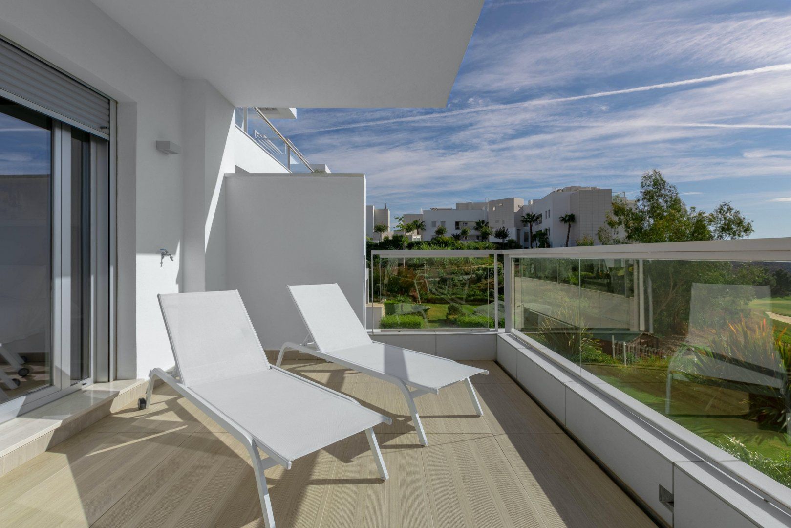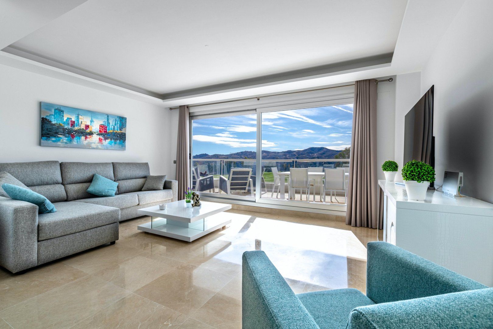 Or simply have a thrilling round of golf – there are three superb championship courses, each presenting its own unique challenges – there’s a golf academy here too and superb sports. With all these wonderful amenities, will you spend much time in the apartment itself? When you do, unwind on the sofa in the living space with its fresh, white, turquoise and grey colour scheme.