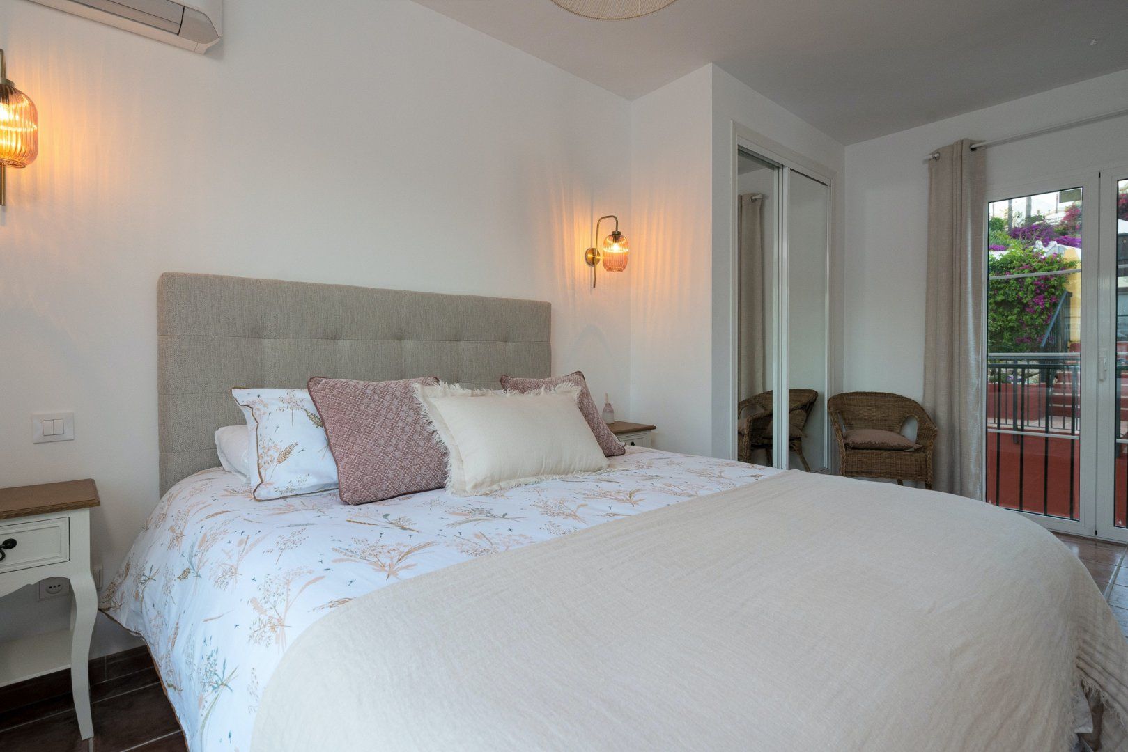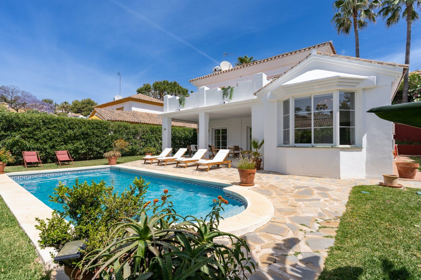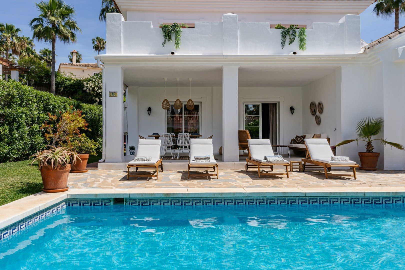 The white walls of the villa face onto a luscious back garden, decorated in verdant plant life, colourful flowers and a glistening pool. It's a dreamy spot where you'll probably spend most of your time on those glorious, sunny afternoons.