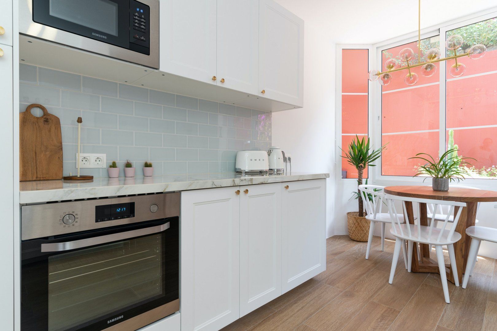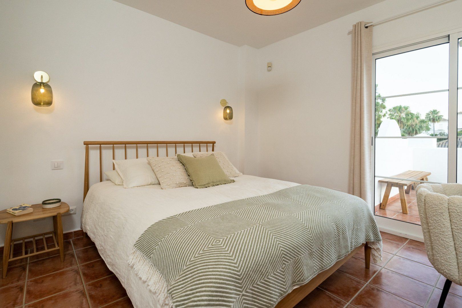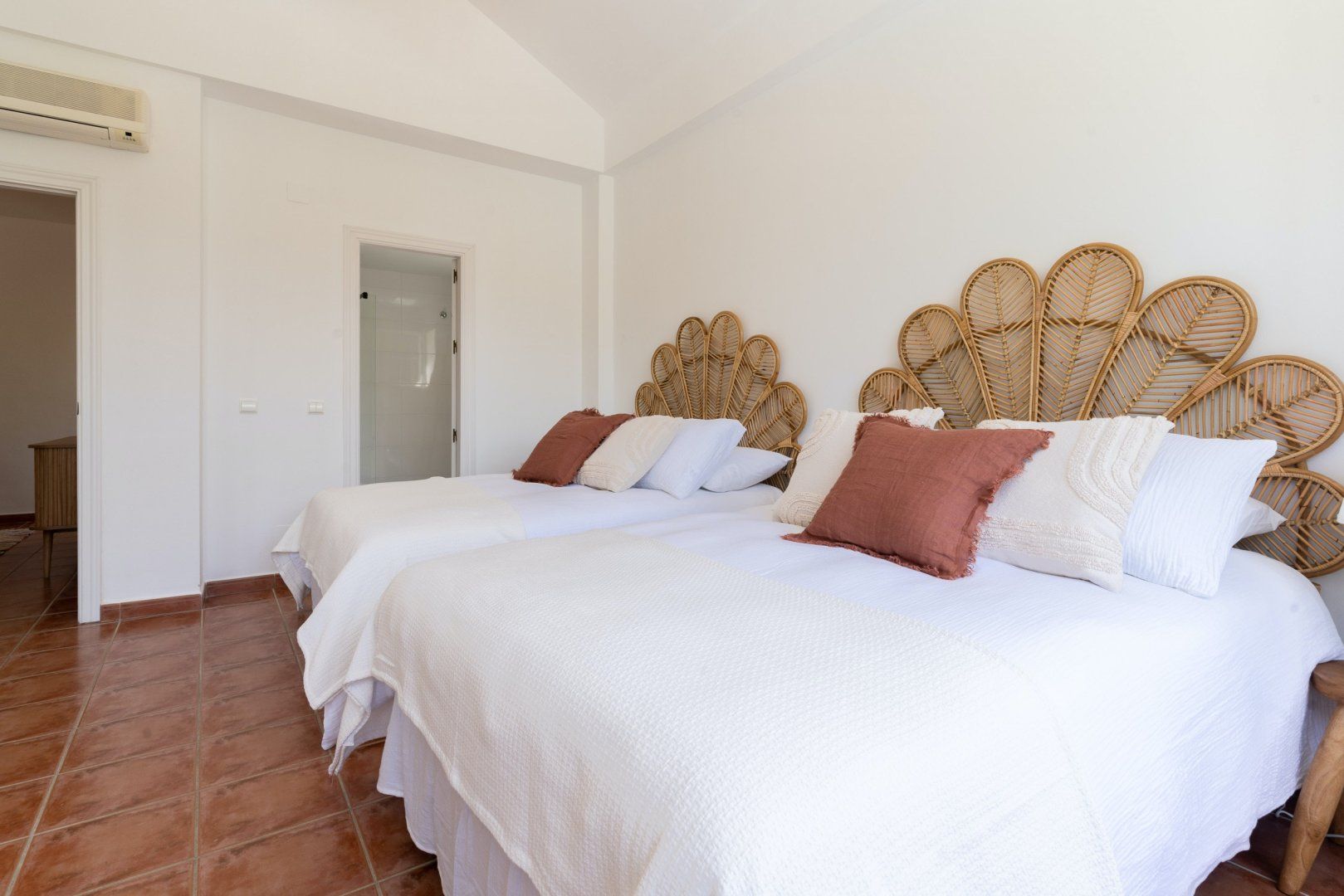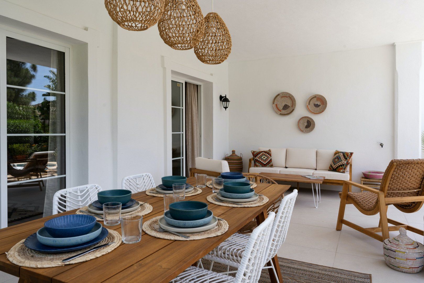 The white walls of the villa face onto a luscious back garden, decorated in verdant plant life, colourful flowers and a glistening pool. It's a dreamy spot where you'll probably spend most of your time on those glorious, sunny afternoons.