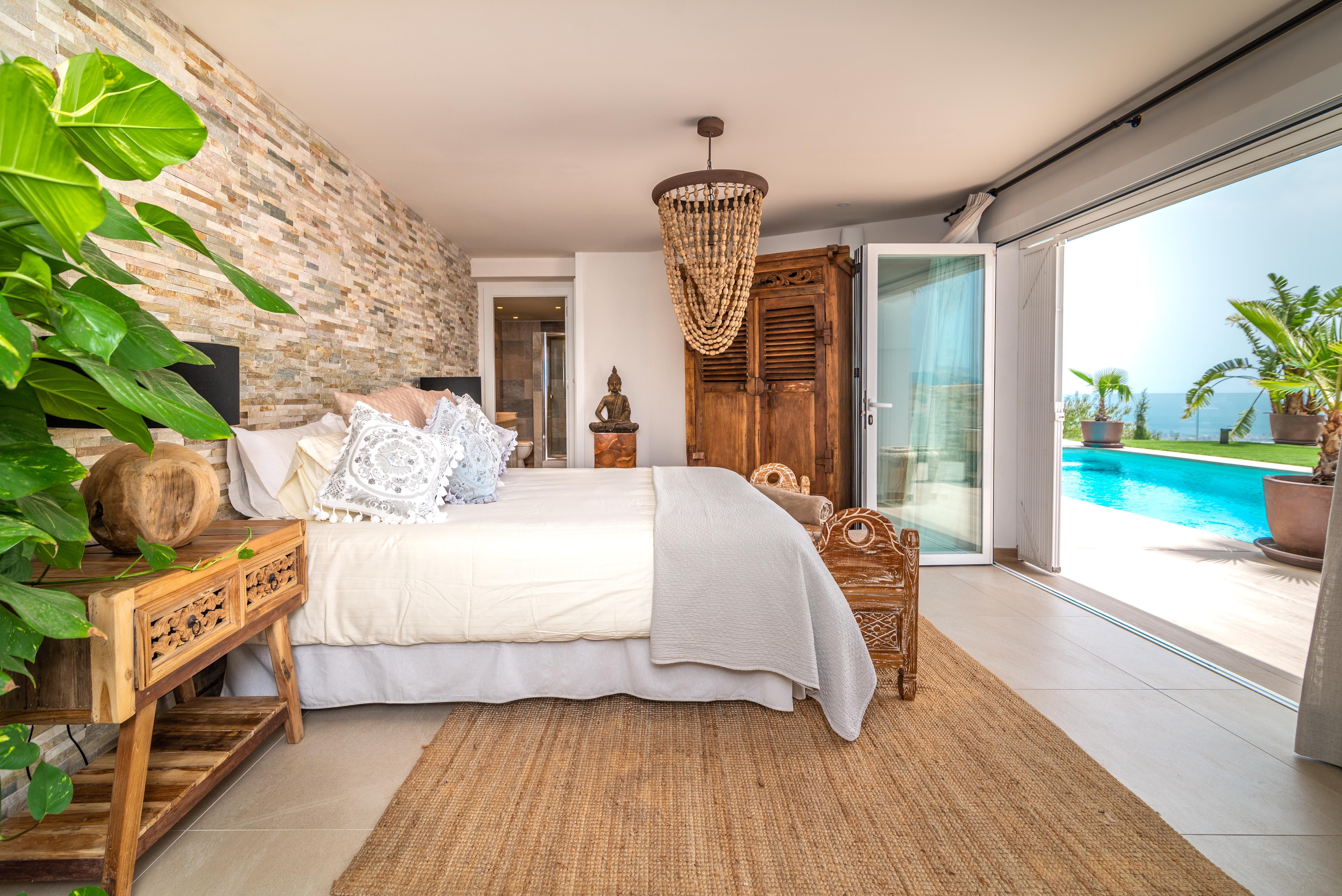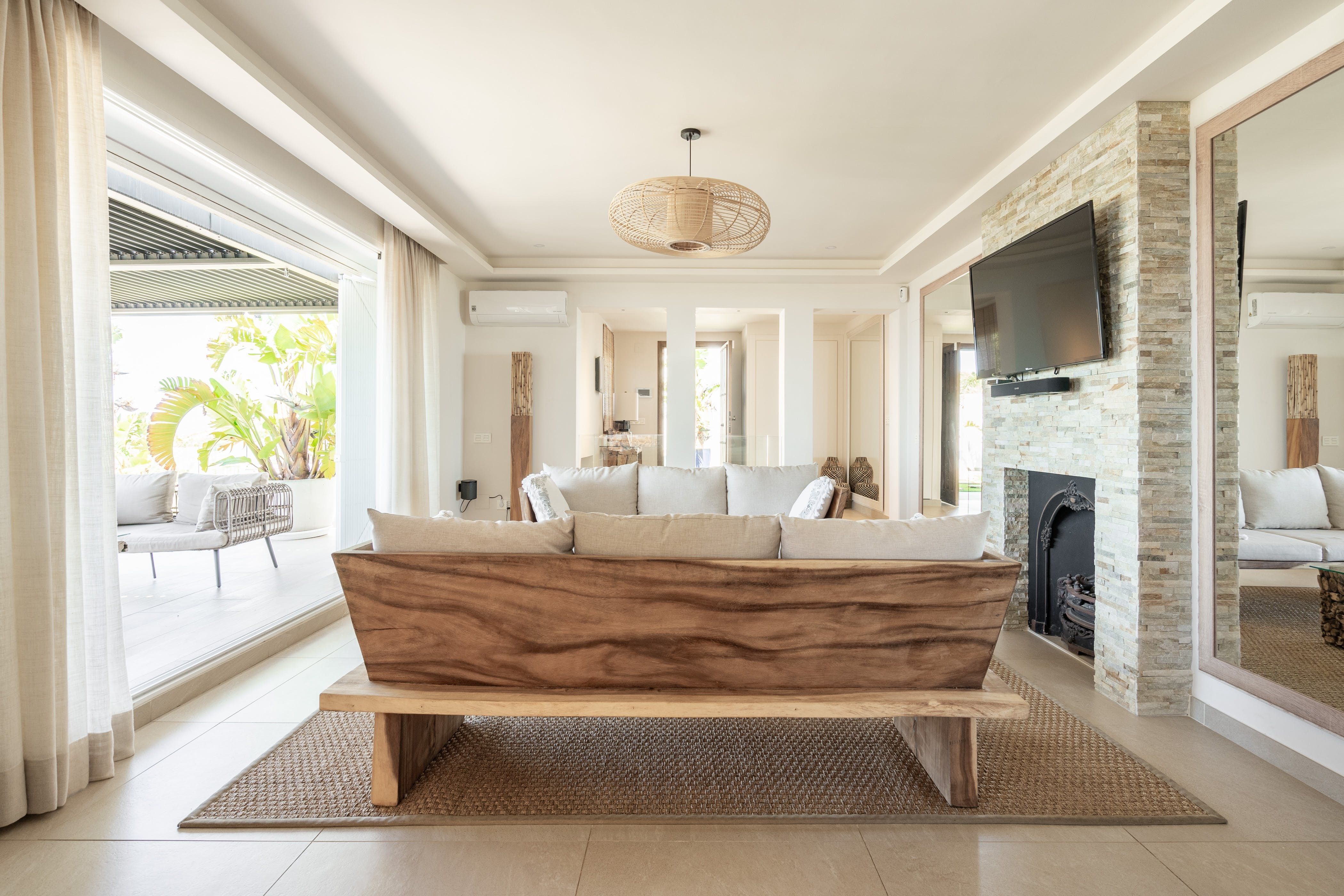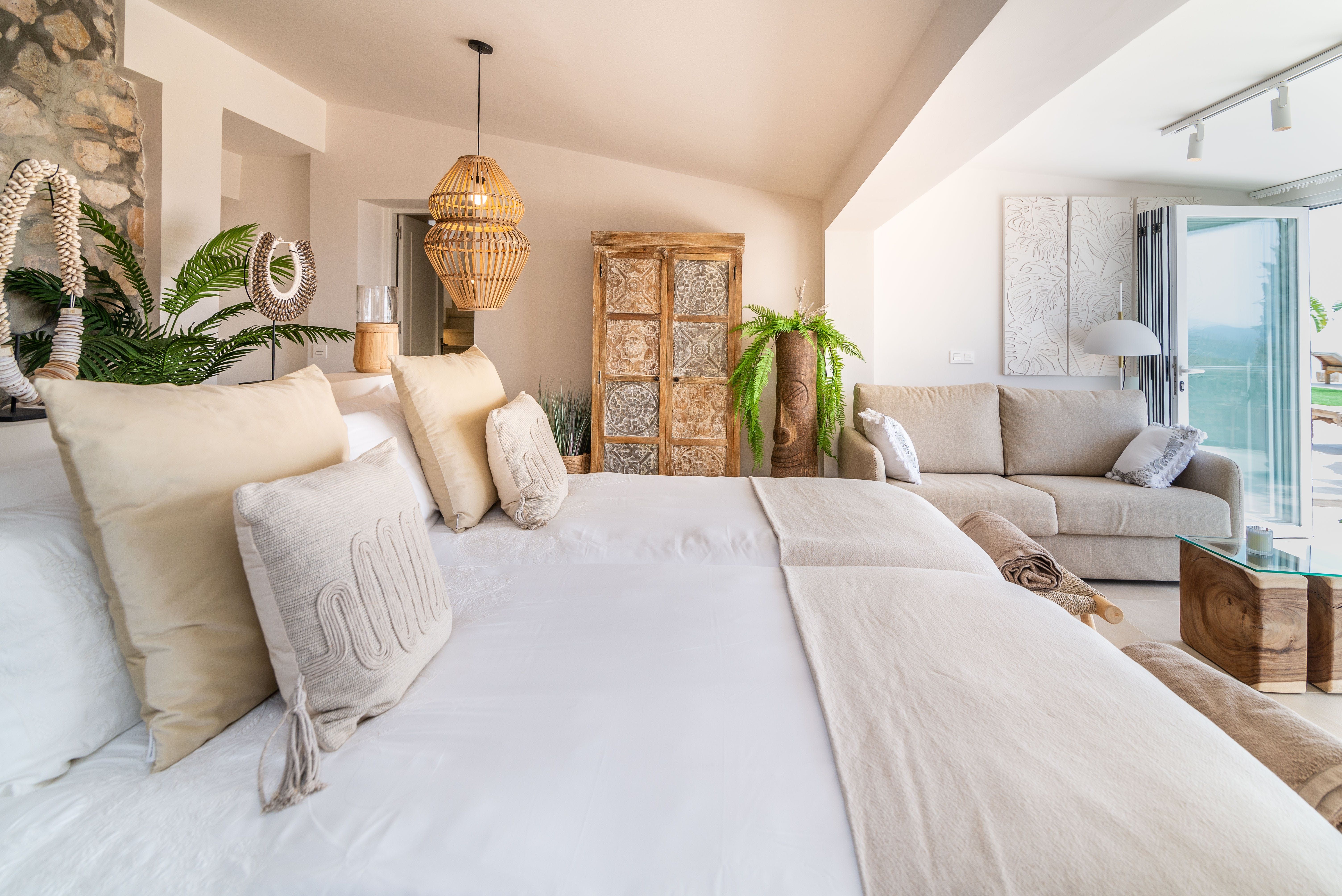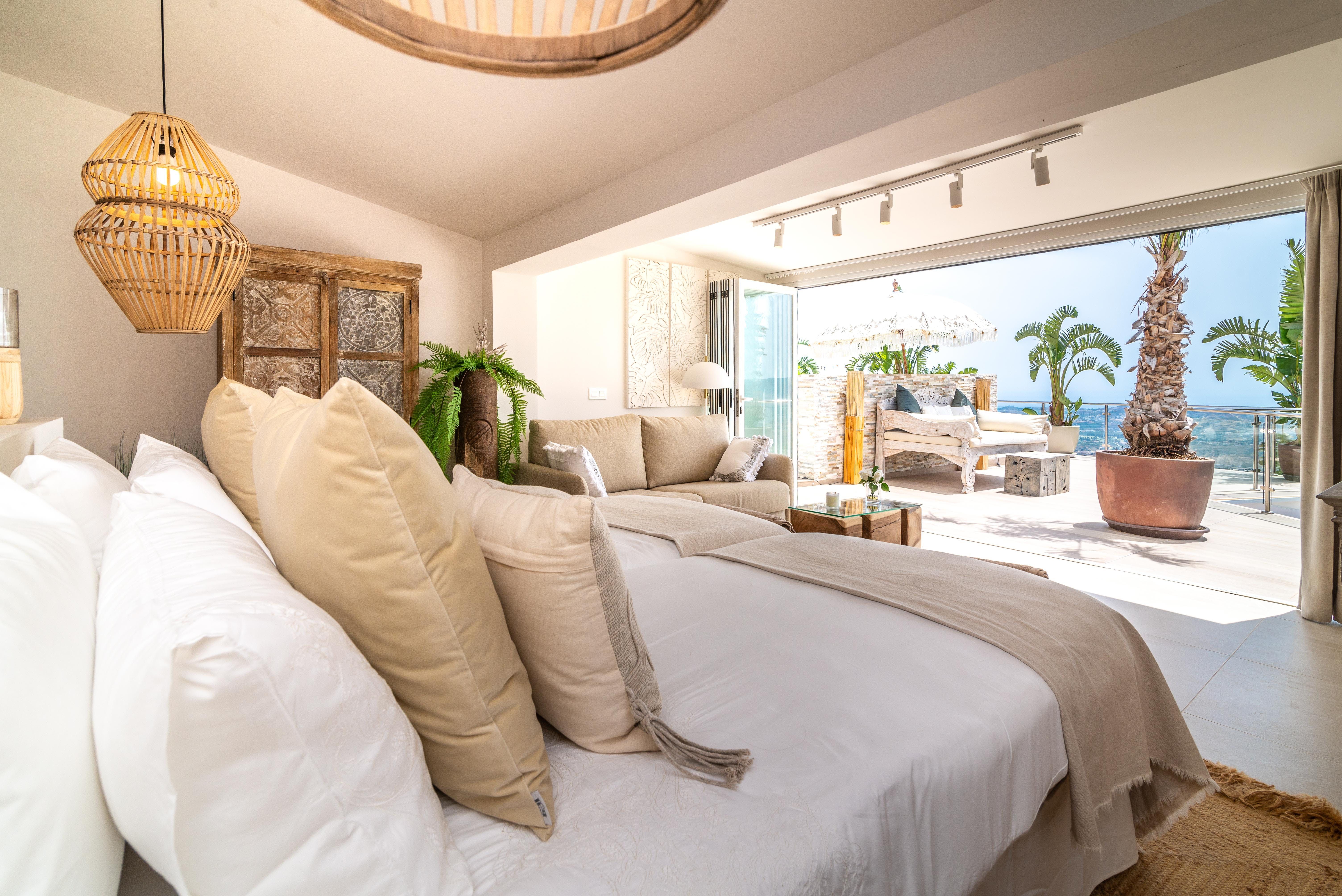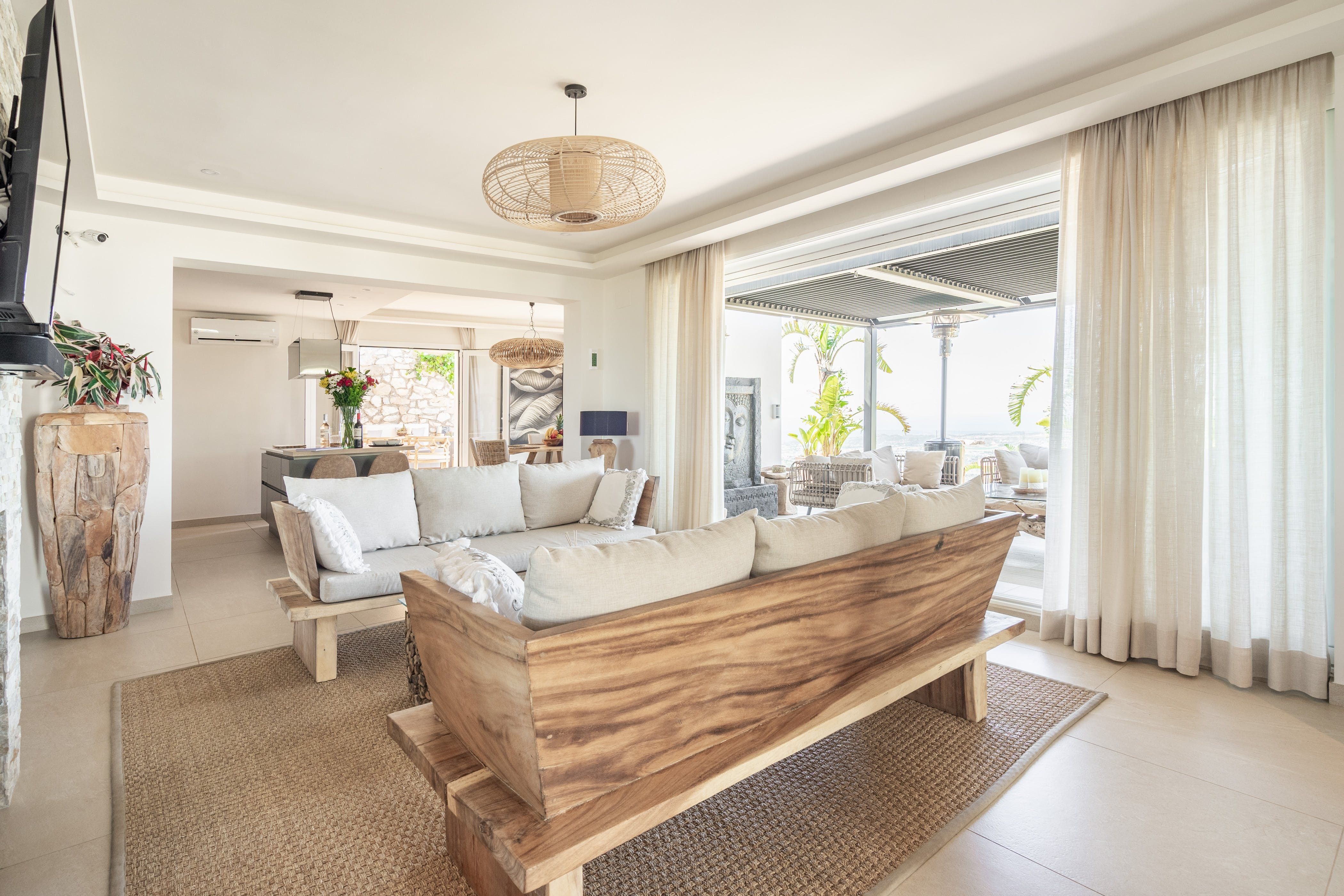 Flaunting a curation of natural textures and touches, the interior here is light, bright and fabulous. Sheer curtains canopy the windows and doors, letting the sunlight cascade its way from room to room, while the sleek floor tiles feel effortlessly cooling underfoot. Begin each morning by whipping up a creamy latte from the coffee machine and retreating back to the snug of your sumptuous slumber setting to admire the sensational views beyond. Suitably fuelled, venture outside to soak up the rays on whichever sunspot takes your fancy.