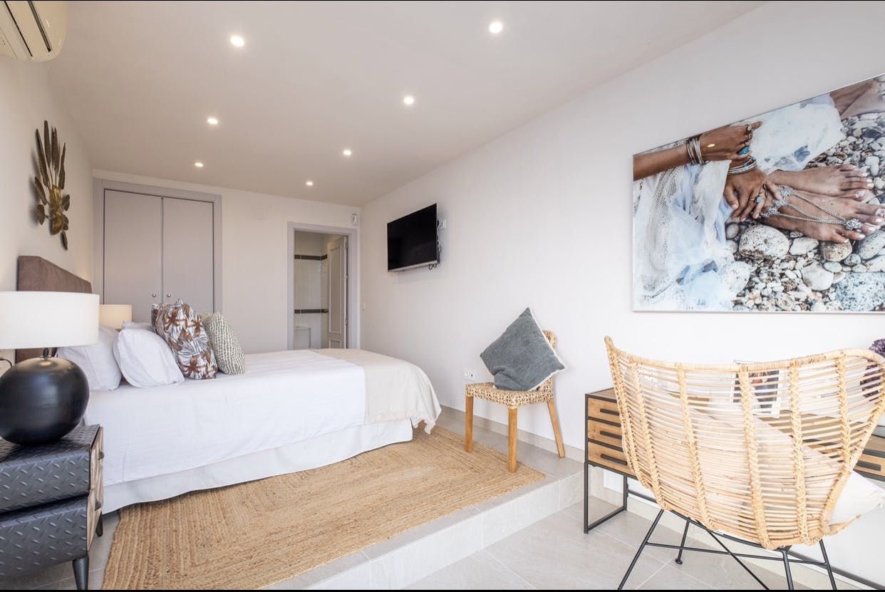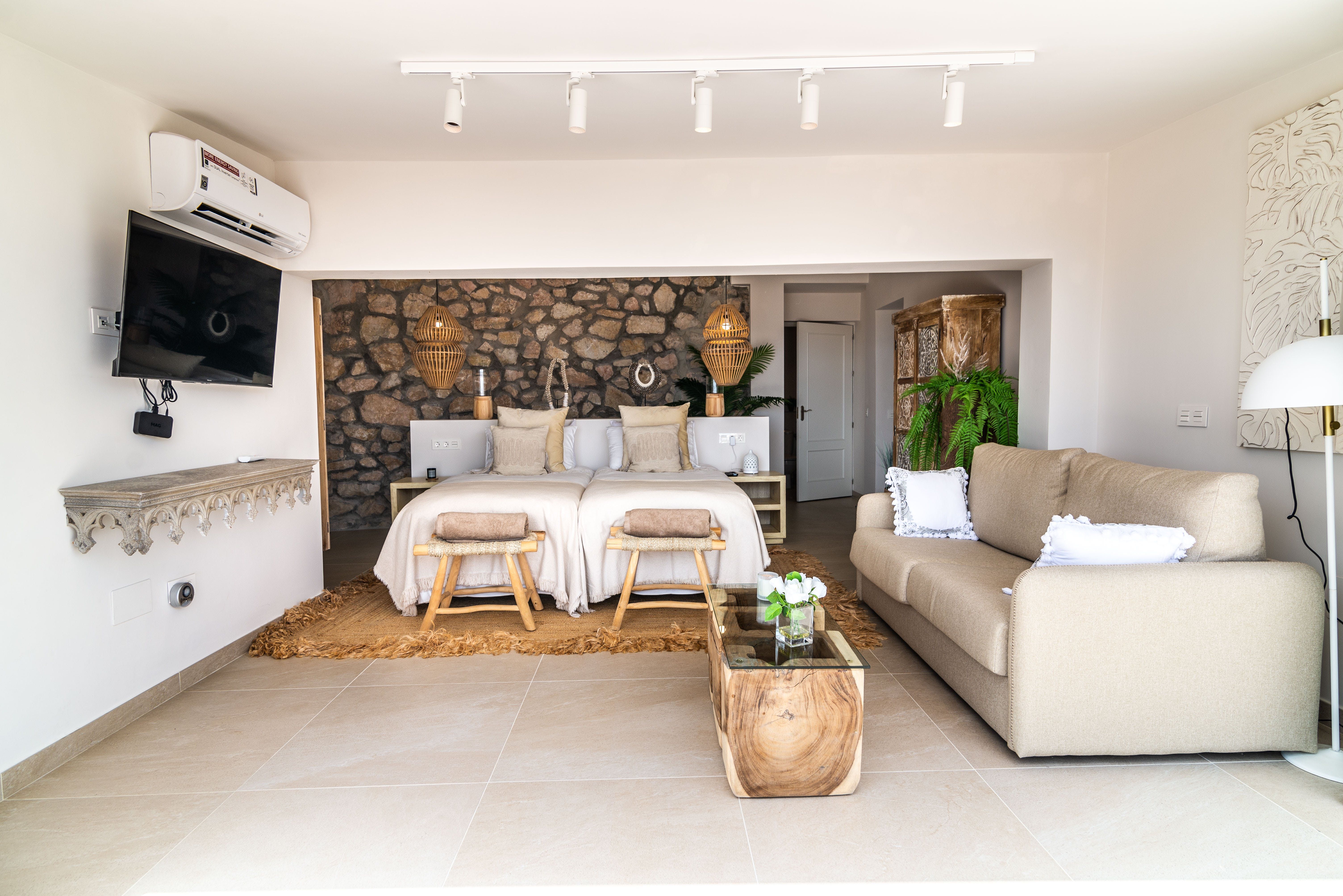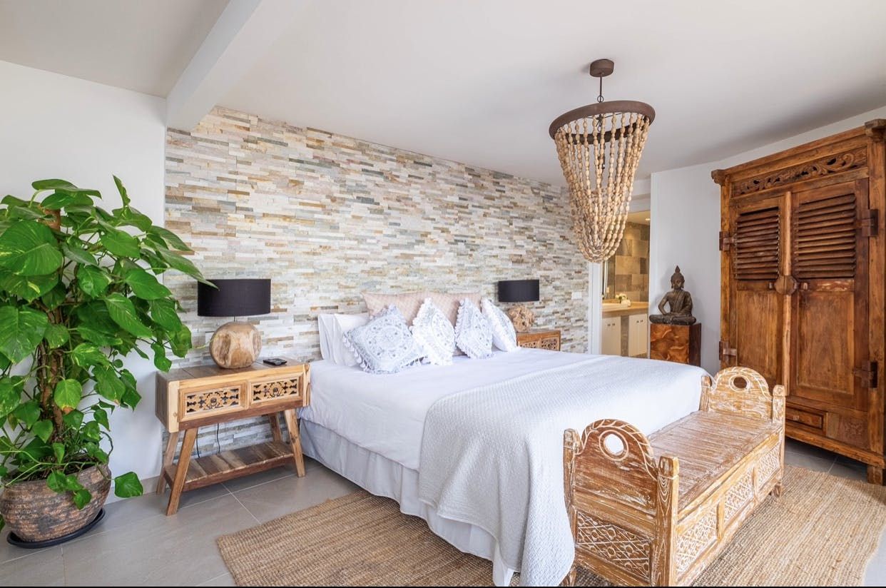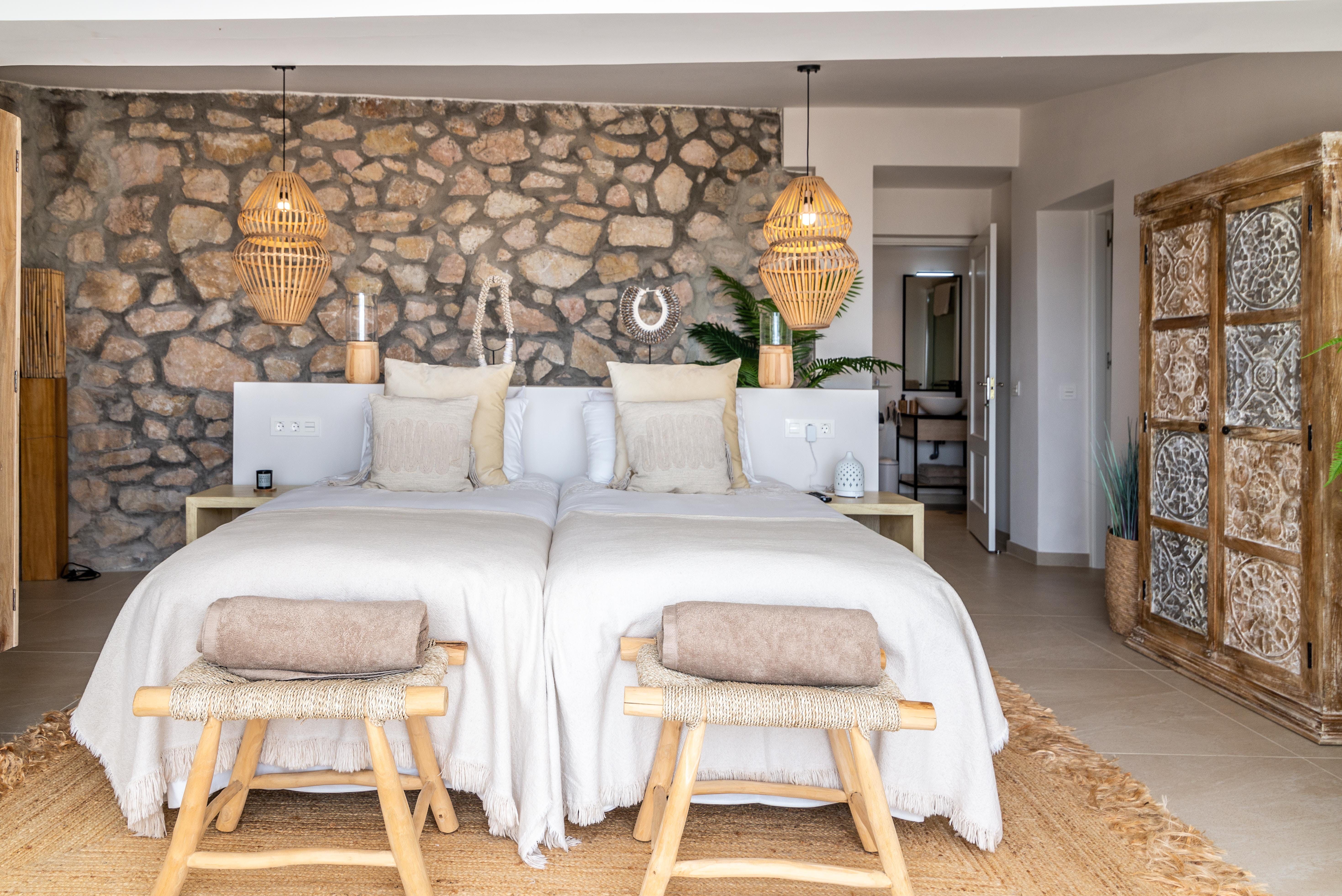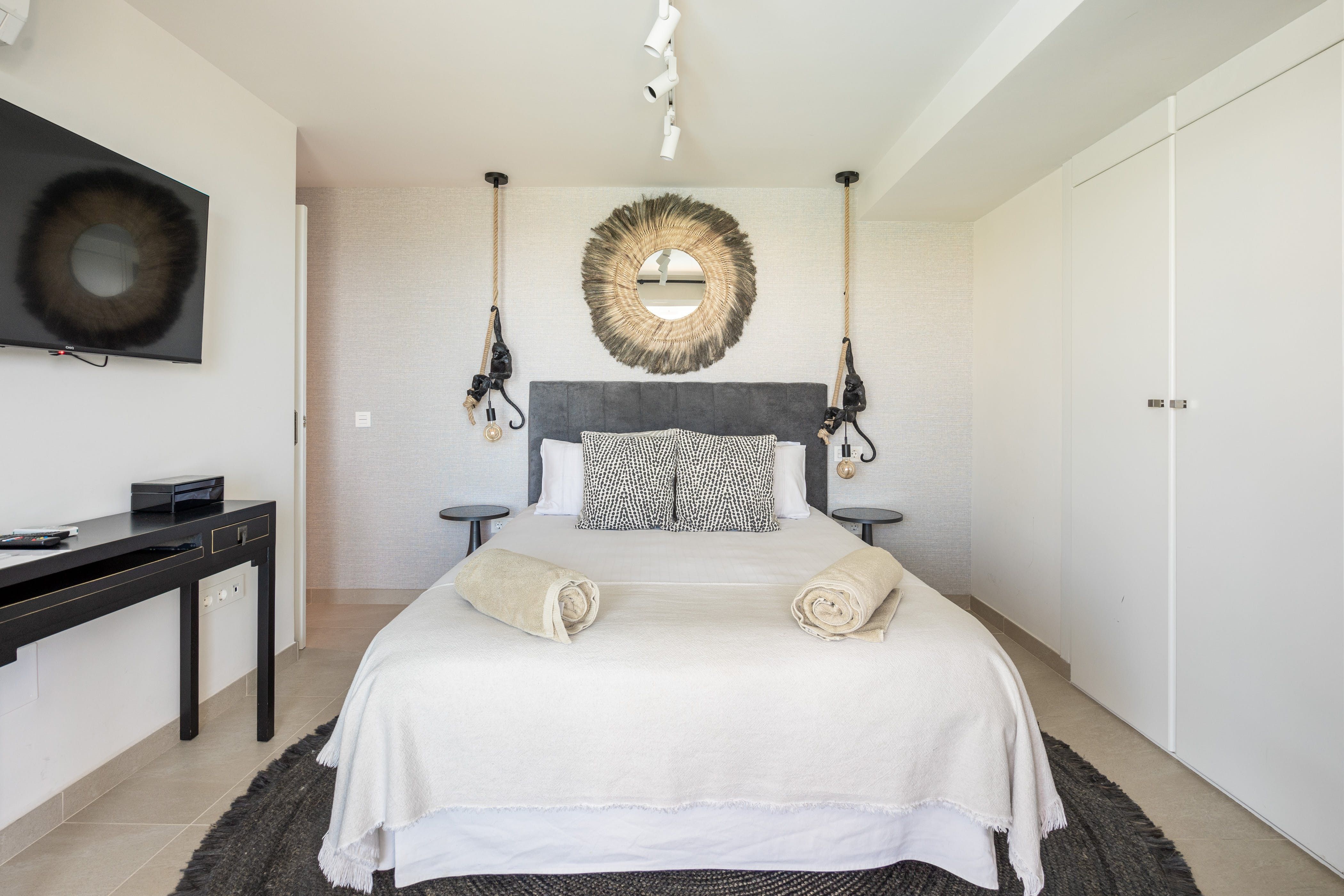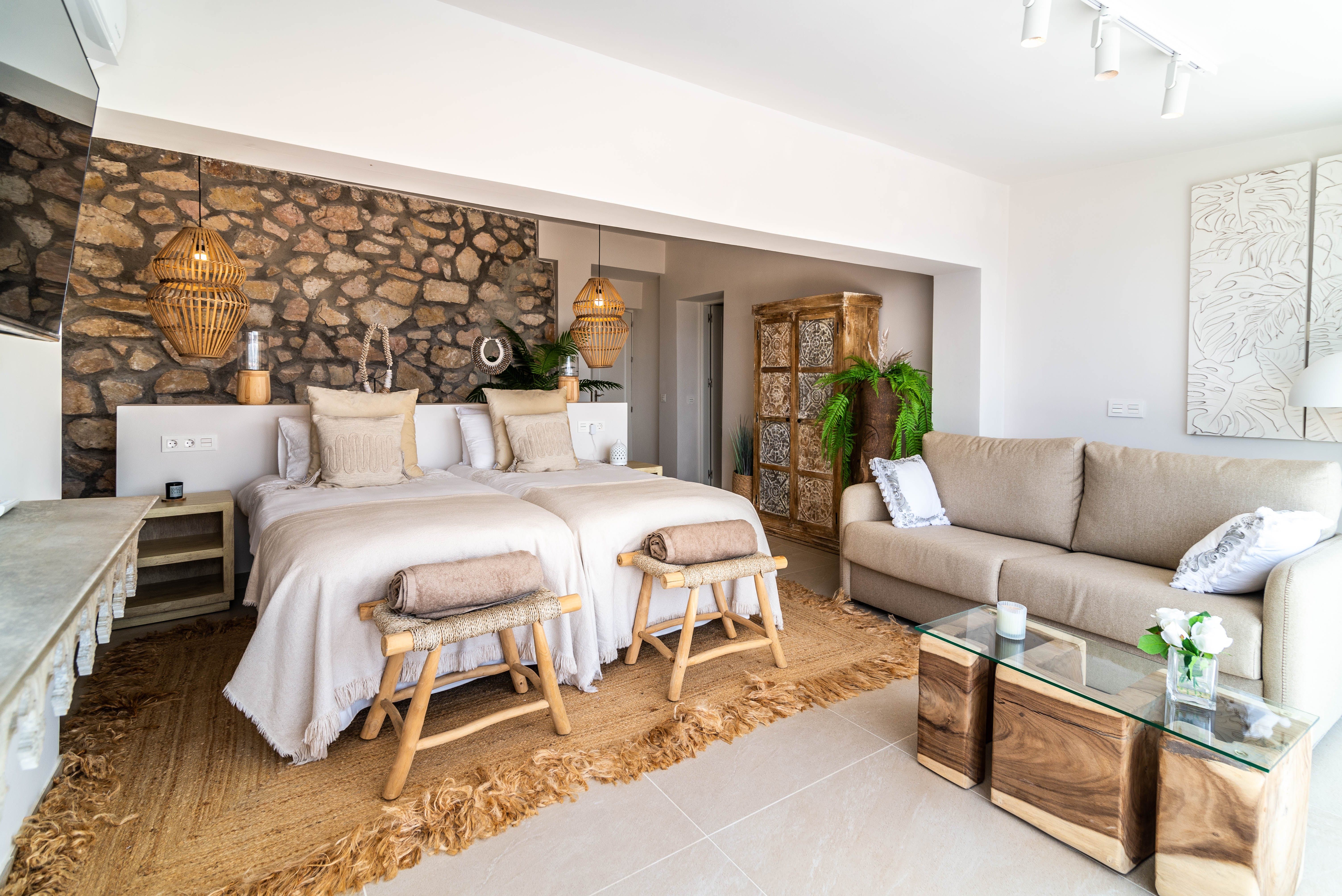 Flaunting a curation of natural textures and touches, the interior here is light, bright and fabulous. Sheer curtains canopy the windows and doors, letting the sunlight cascade its way from room to room, while the sleek floor tiles feel effortlessly cooling underfoot. Begin each morning by whipping up a creamy latte from the coffee machine and retreating back to the snug of your sumptuous slumber setting to admire the sensational views beyond. Suitably fuelled, venture outside to soak up the rays on whichever sunspot takes your fancy.