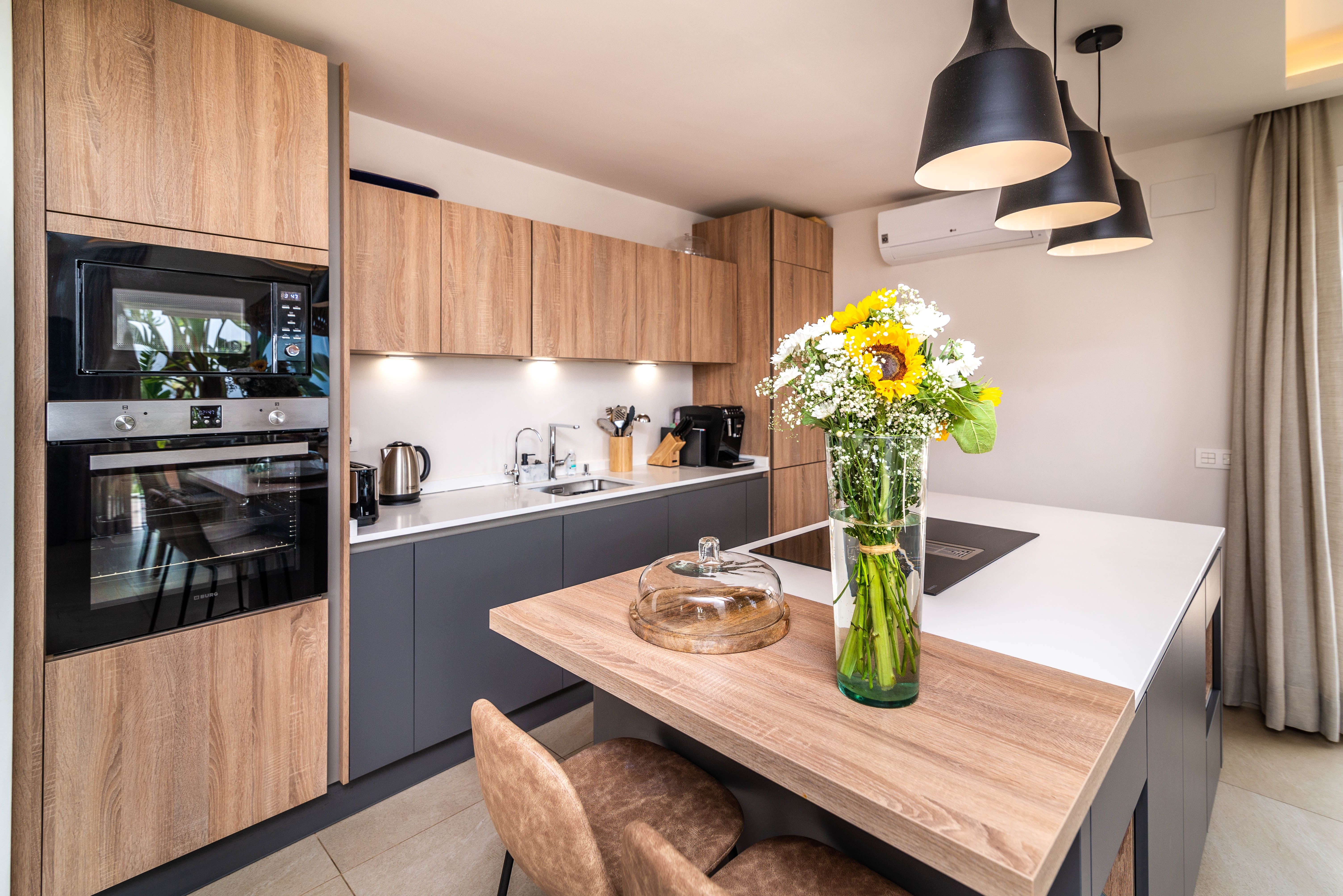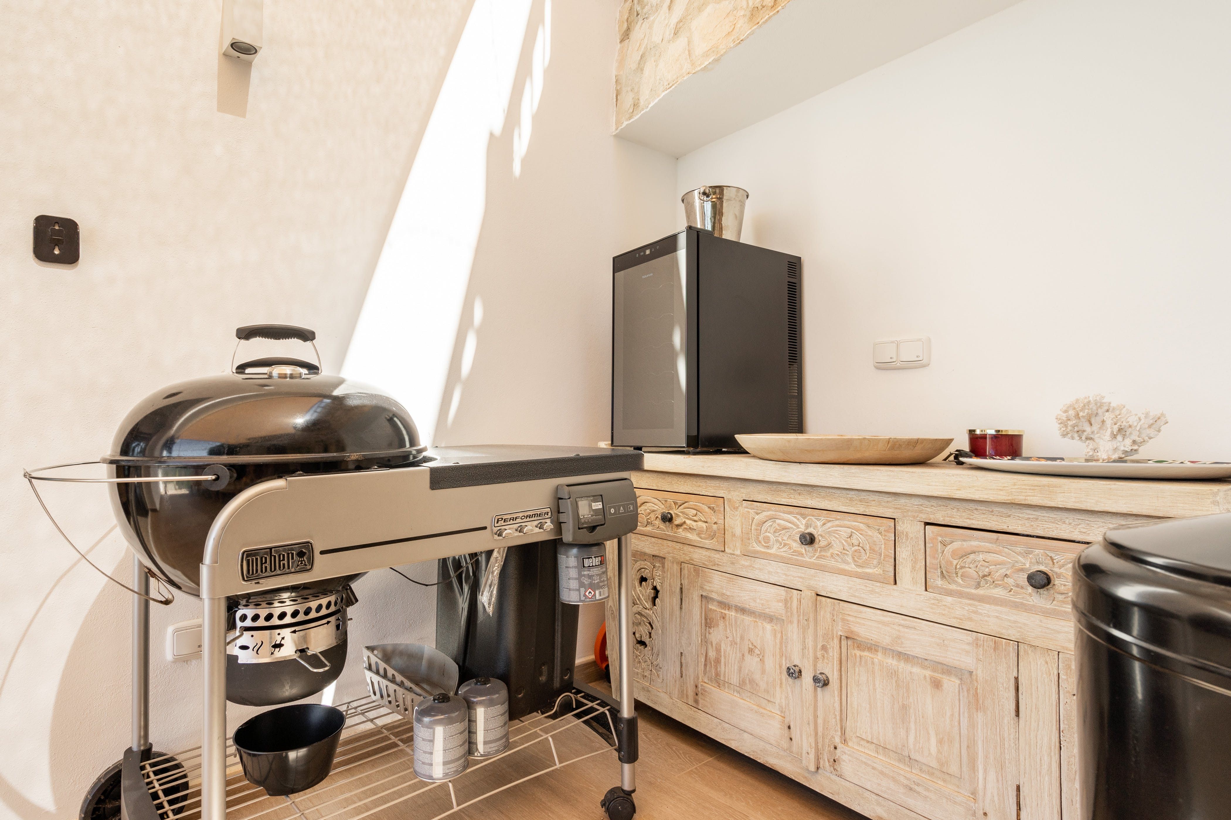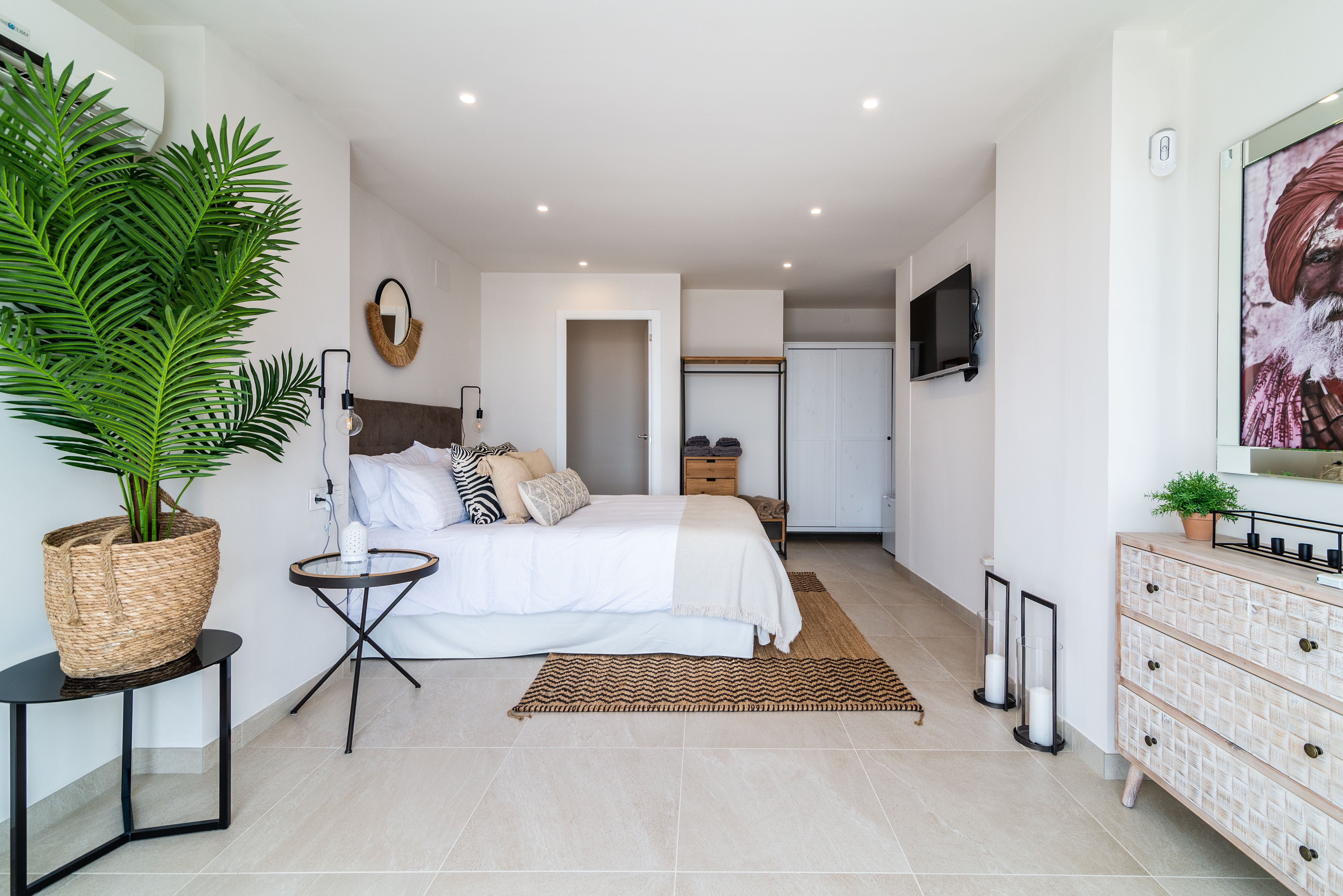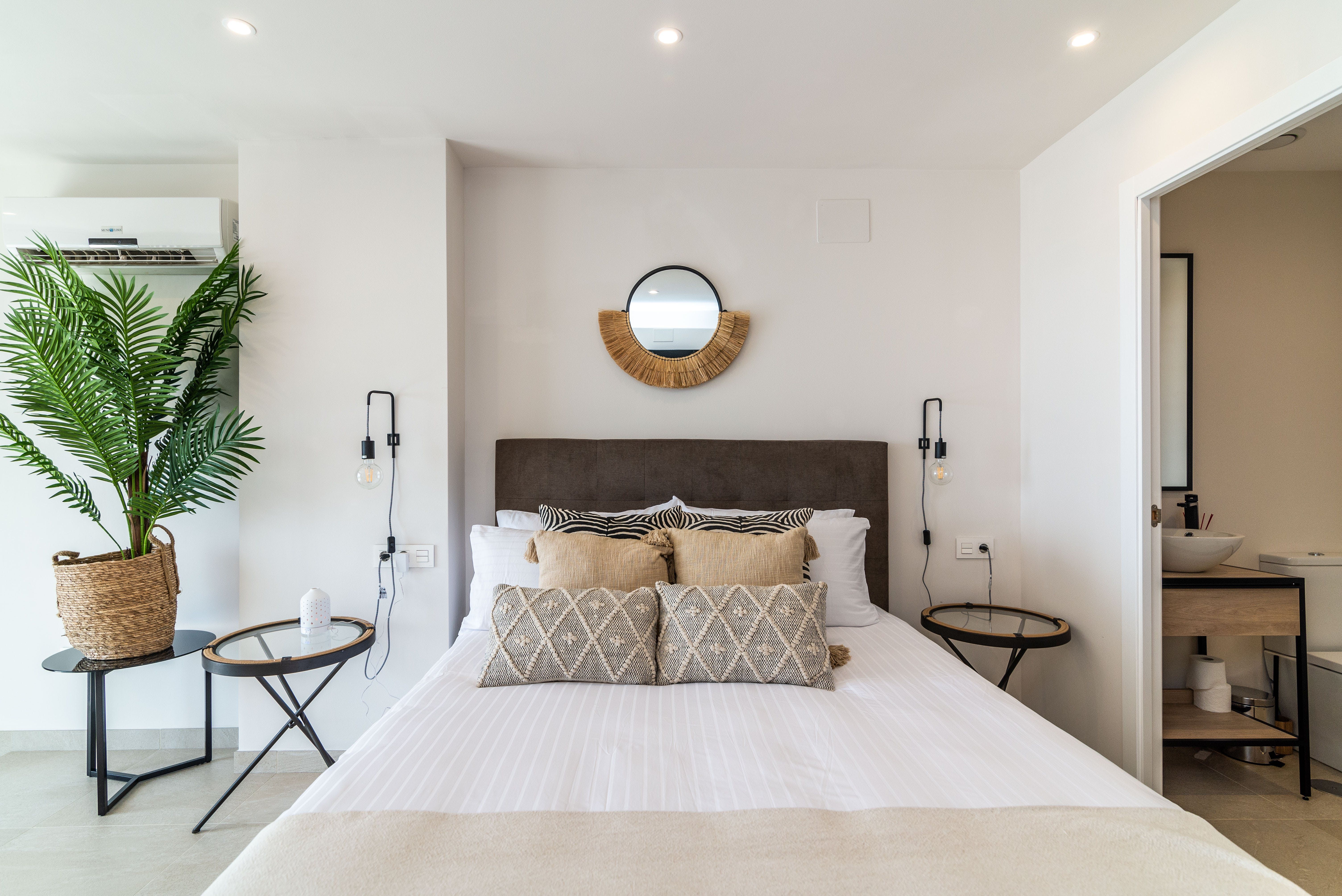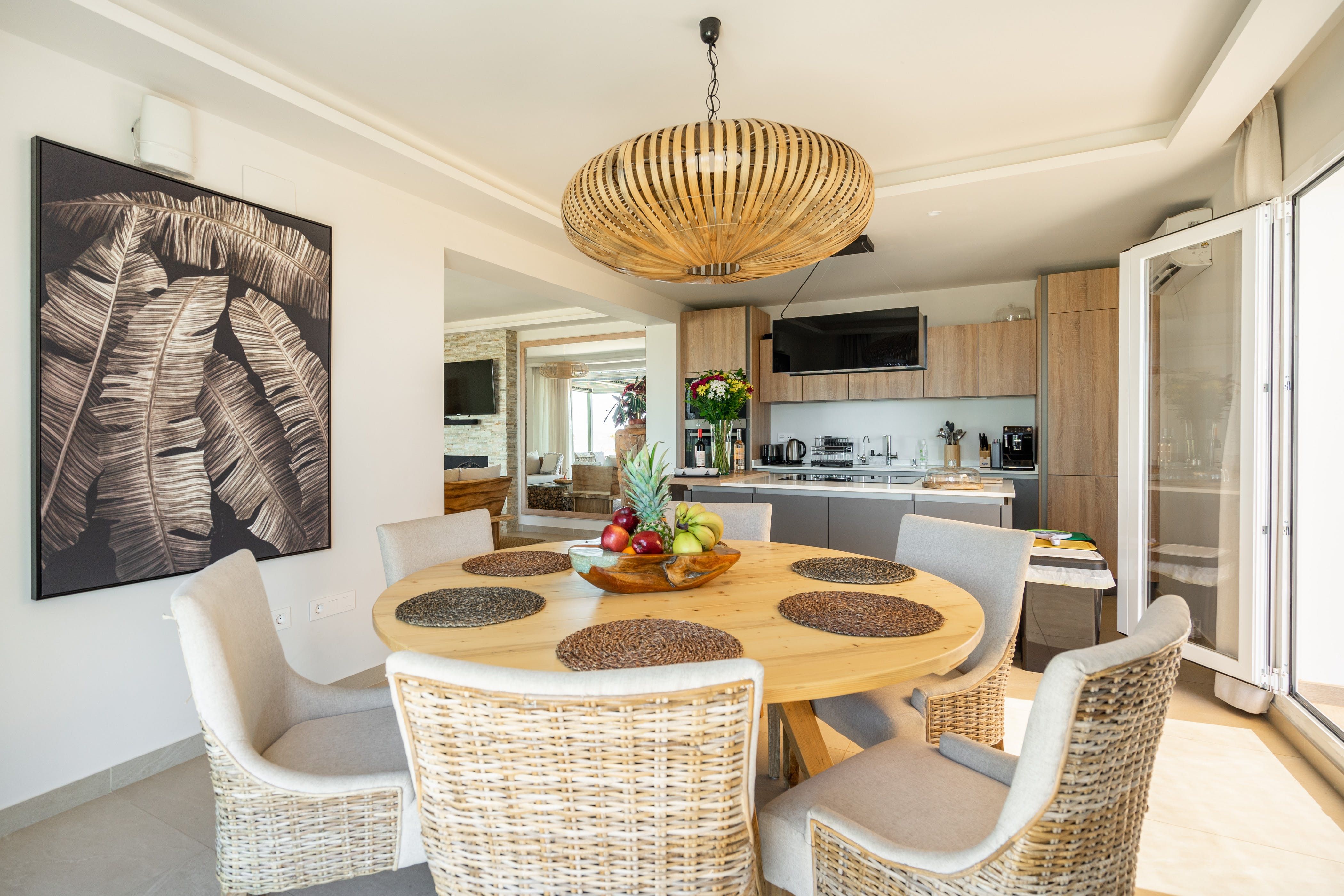 Flaunting a curation of natural textures and touches, the interior here is light, bright and fabulous. Sheer curtains canopy the windows and doors, letting the sunlight cascade its way from room to room, while the sleek floor tiles feel effortlessly cooling underfoot. Begin each morning by whipping up a creamy latte from the coffee machine and retreating back to the snug of your sumptuous slumber setting to admire the sensational views beyond. Suitably fuelled, venture outside to soak up the rays on whichever sunspot takes your fancy.