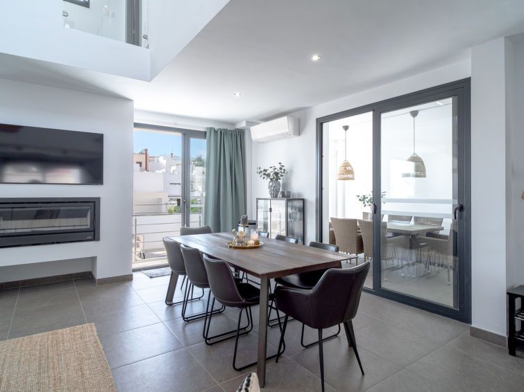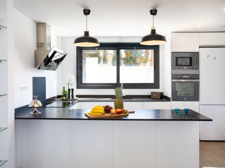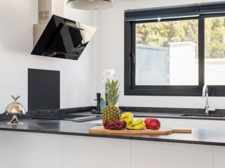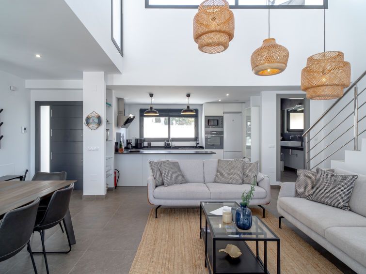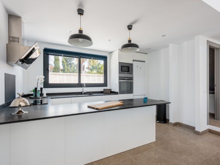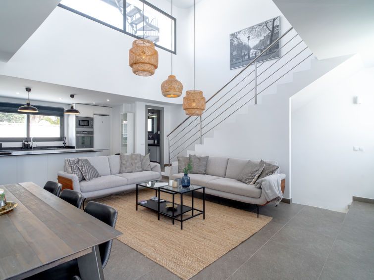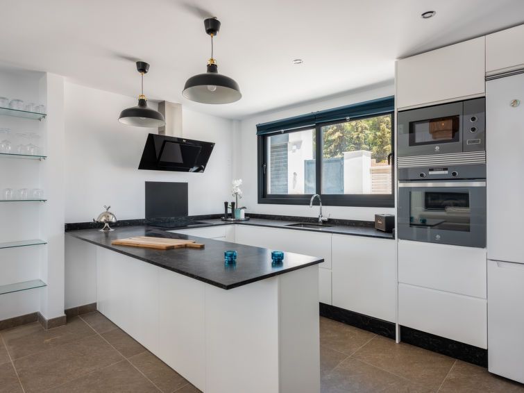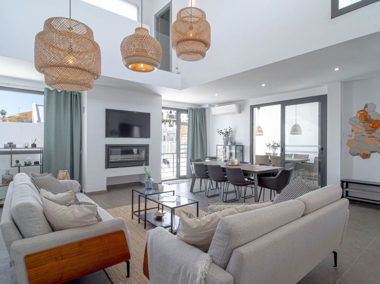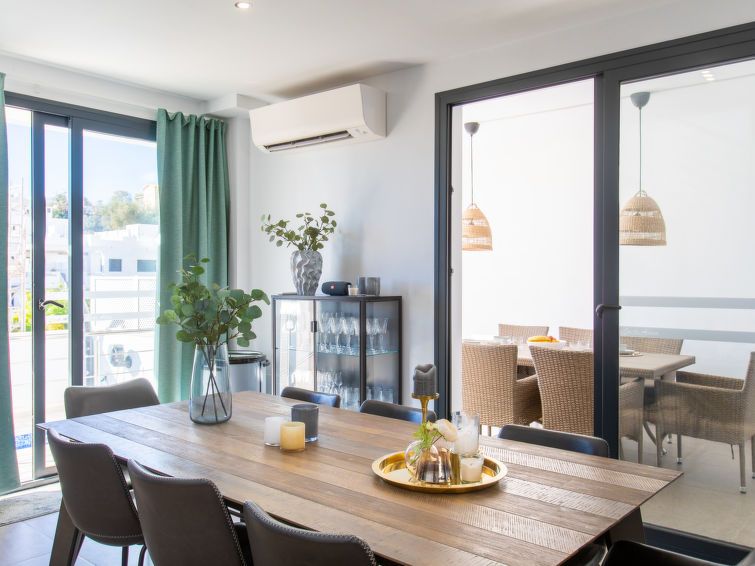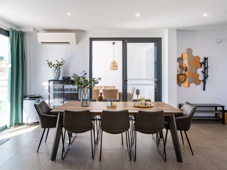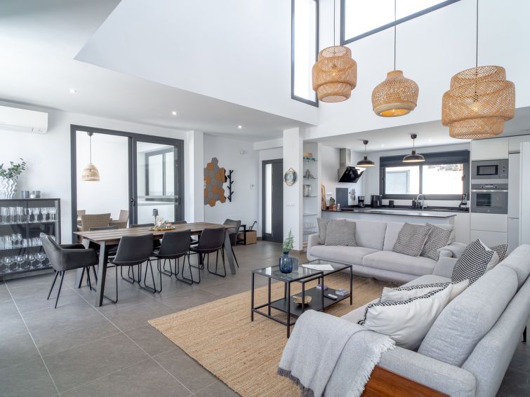 "Aldea", 5-room villa 120 m2. Spacious and bright, comfortable furnishings: living/dining room with TV, international TV channels, air conditioning and forced-air heating. Open kitchen (oven, dishwasher, 3 induction hot plates, toaster, kettle, microwave, freezer, electric coffee machine).