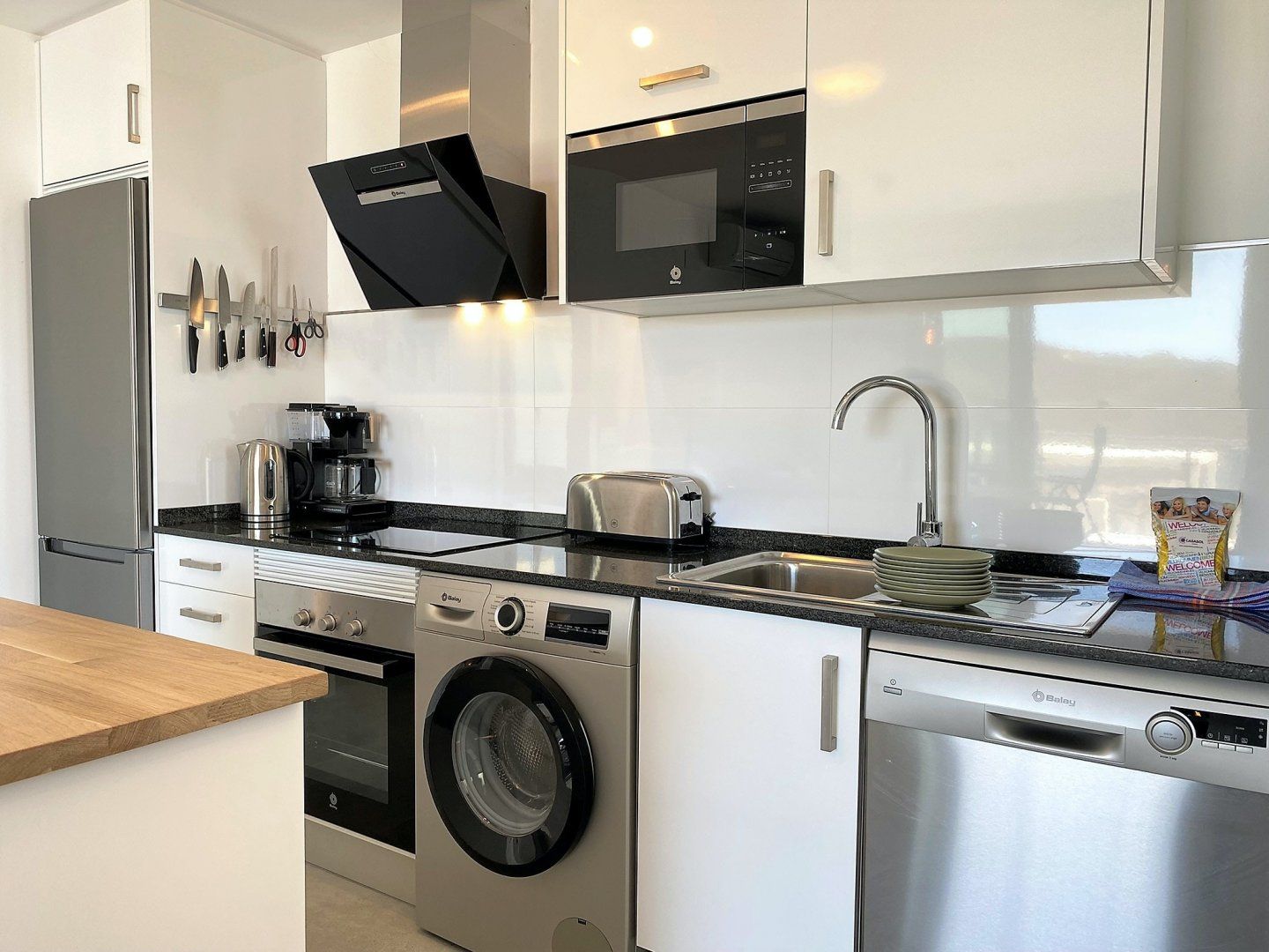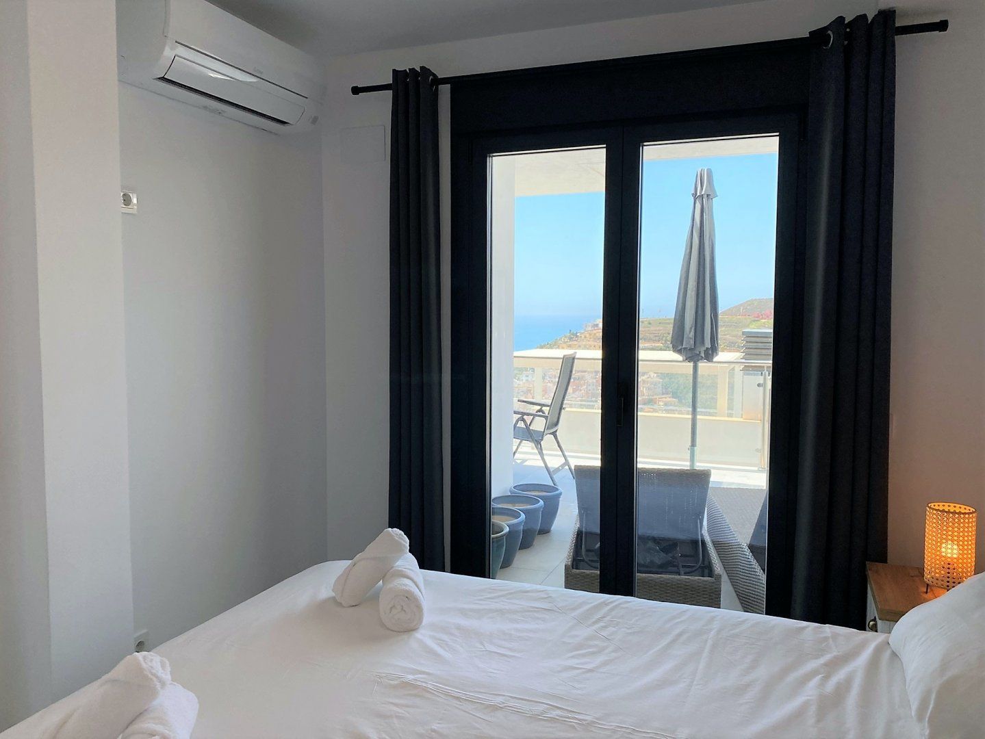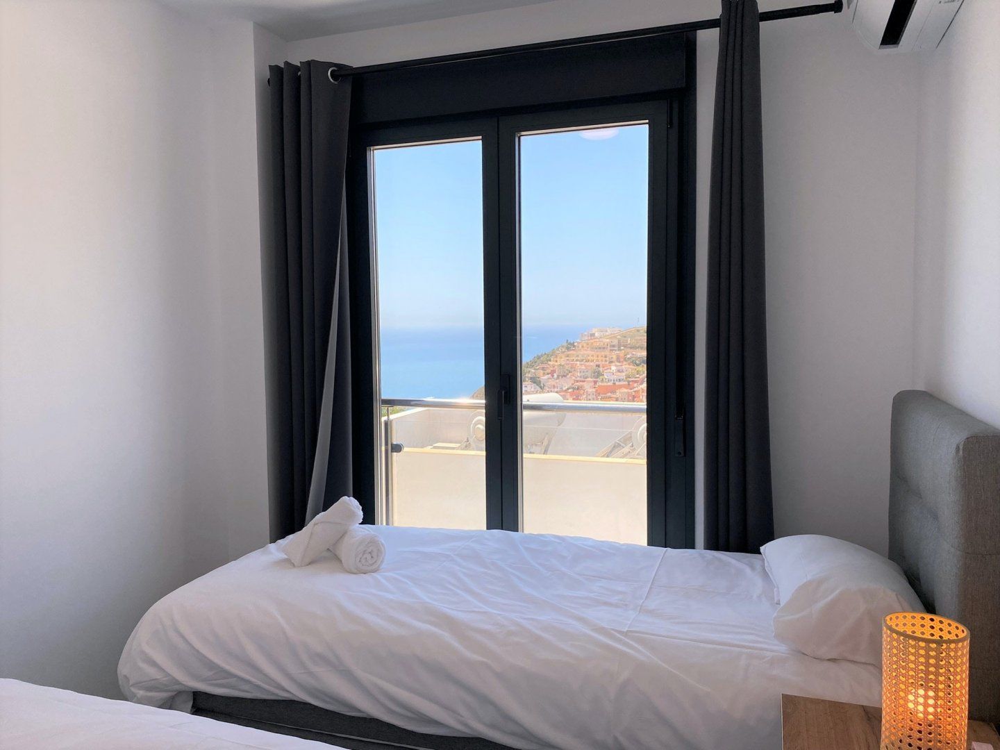 Dazzling coastal vistas take all the glory at this newly-built and oh-so-intimate apartment complex perched in the hills above Torrox Costa and Nerja and just 1.2 kilometres from the beach. Expertly designed to max out its showstopping setting from angles, spending lazy days chasing the sun on the two expansive, private terraces wrapping around this home. Time to beat the heat? Then the shared, stylish pool for cooling dips is just the ticket, or head back to the privacy of your apartment to stretch out with a good book and glass of something crisp (your host can organise champagne on ice to be delivered). With its cool Scandi vibes and restful neutral interiors, you can’t help but feel relaxed inside this home. And with both bedrooms commanding the same glorious sea vistas, there’s no need to tussle for the best room here.