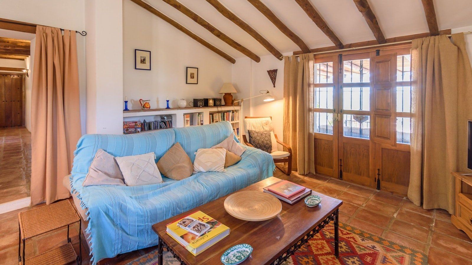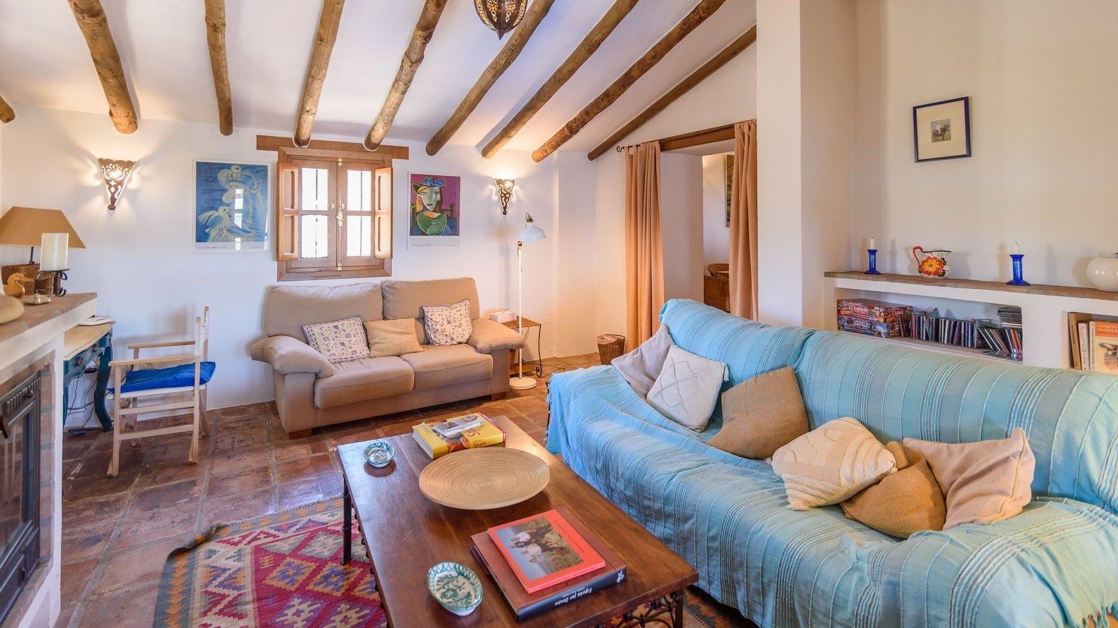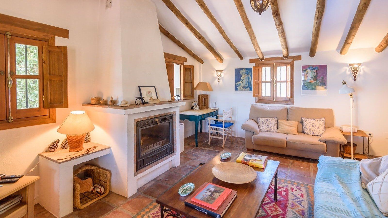 Inside, beamed ceilings and a traditional fireplace give this home a rustic feel, while the shaded porch and private pool at the back of the house make you feel as though you’ve been transported to your very own holiday resort. Kick back and relax with an evening aperitivo in the open air or stretch out on the living room sofa and lose yourself in a paperback from the bookshelf. Then when it’s time to eat, come together at the dining table for a tapas feast prepared in your fully stocked kitchen. Delish.