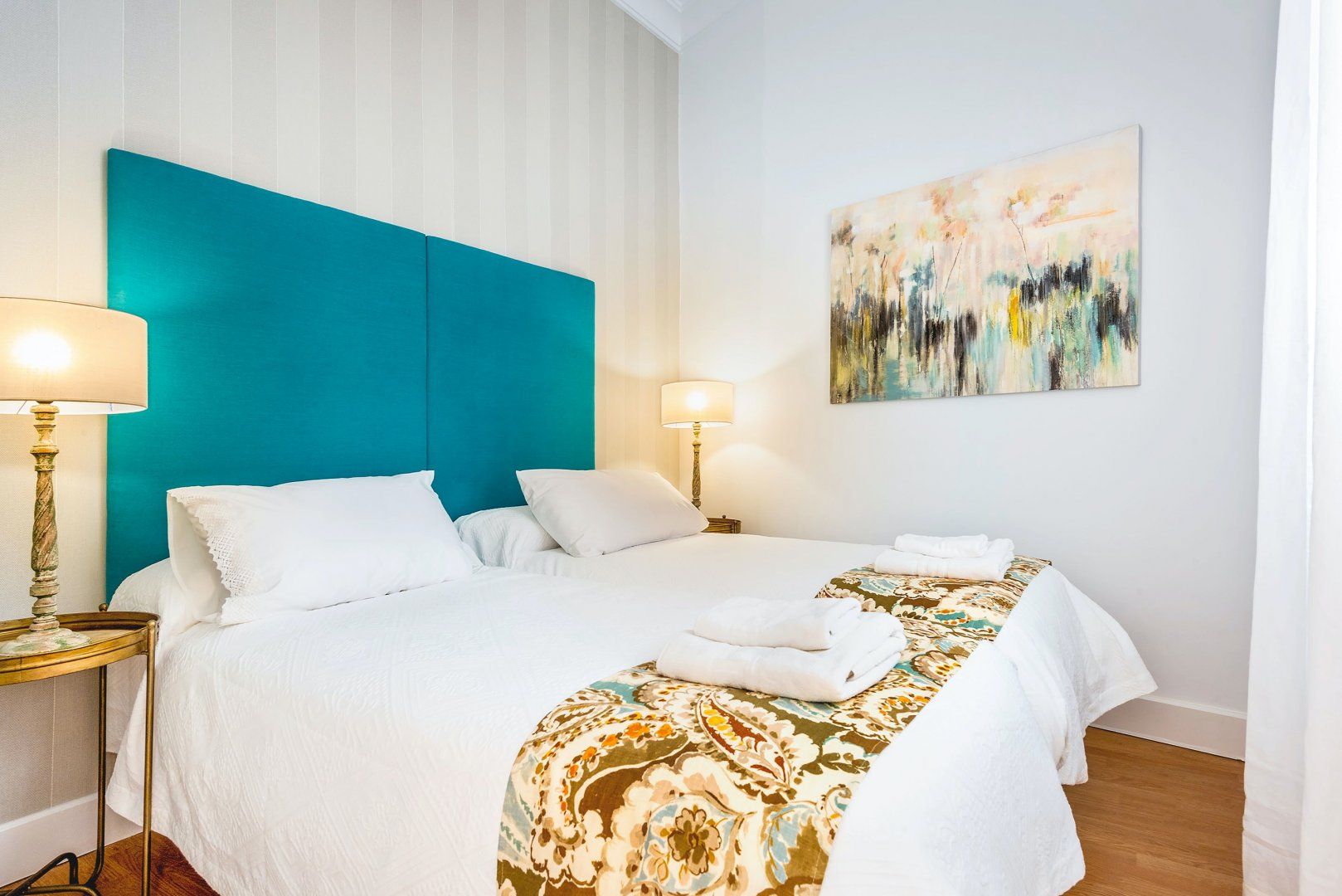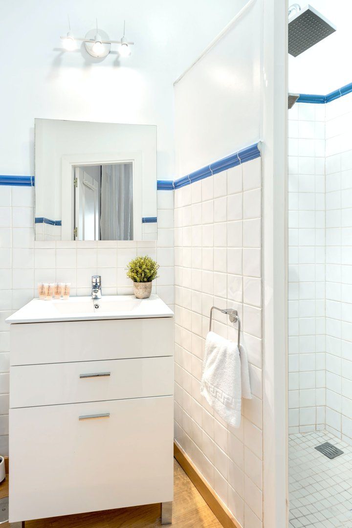 Find striking works of art hanging off the walls, vivid lampshades brightening the living room and unique ornaments scattered around. Adding to the bold originality, the blue tiles in the bathroom and the marble countertop showcase the distinctive style.