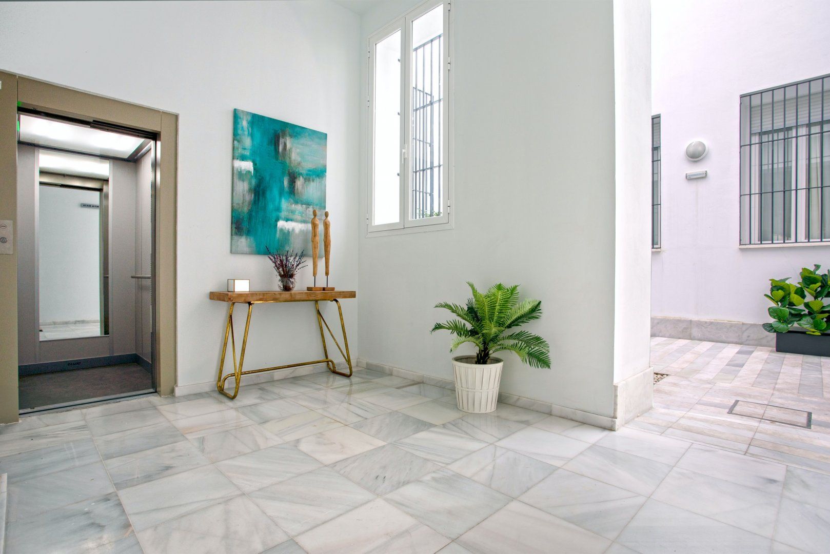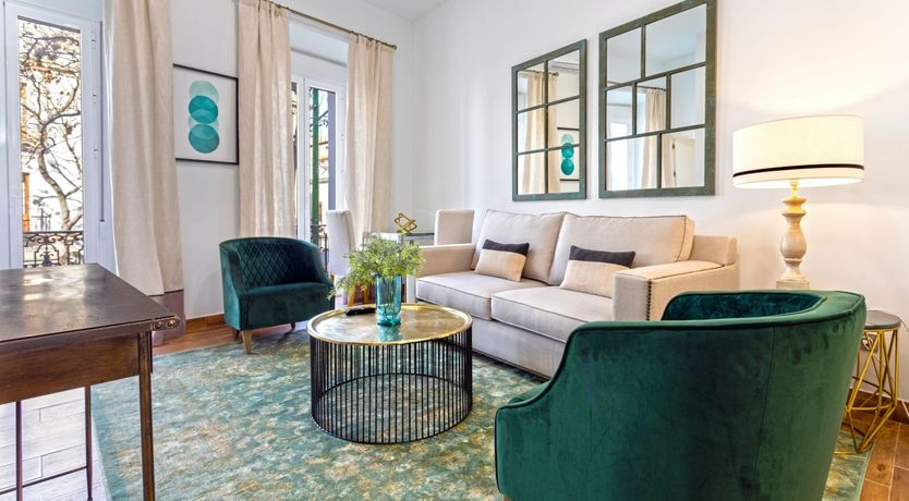 This enviably elegant apartment in central Seville is perfect for a couple or small family. Featuring an open plan kitchen cum dining cum living room complete with near floor to ceiling French doors onto twin Juliet balconies, this artfully designed home oozes both serenity and sophistication. The combination of wooden floors, whitewashed walls and the perfect pairing of neutral colours with gorgeous golds and energising emerald greens, render this home a genuine gem. You’ll love whipping up light bites in the kitchen, dining à deux by doors open onto the balcony and chilling out on the sofa after a stimulating day’s sightseeing.