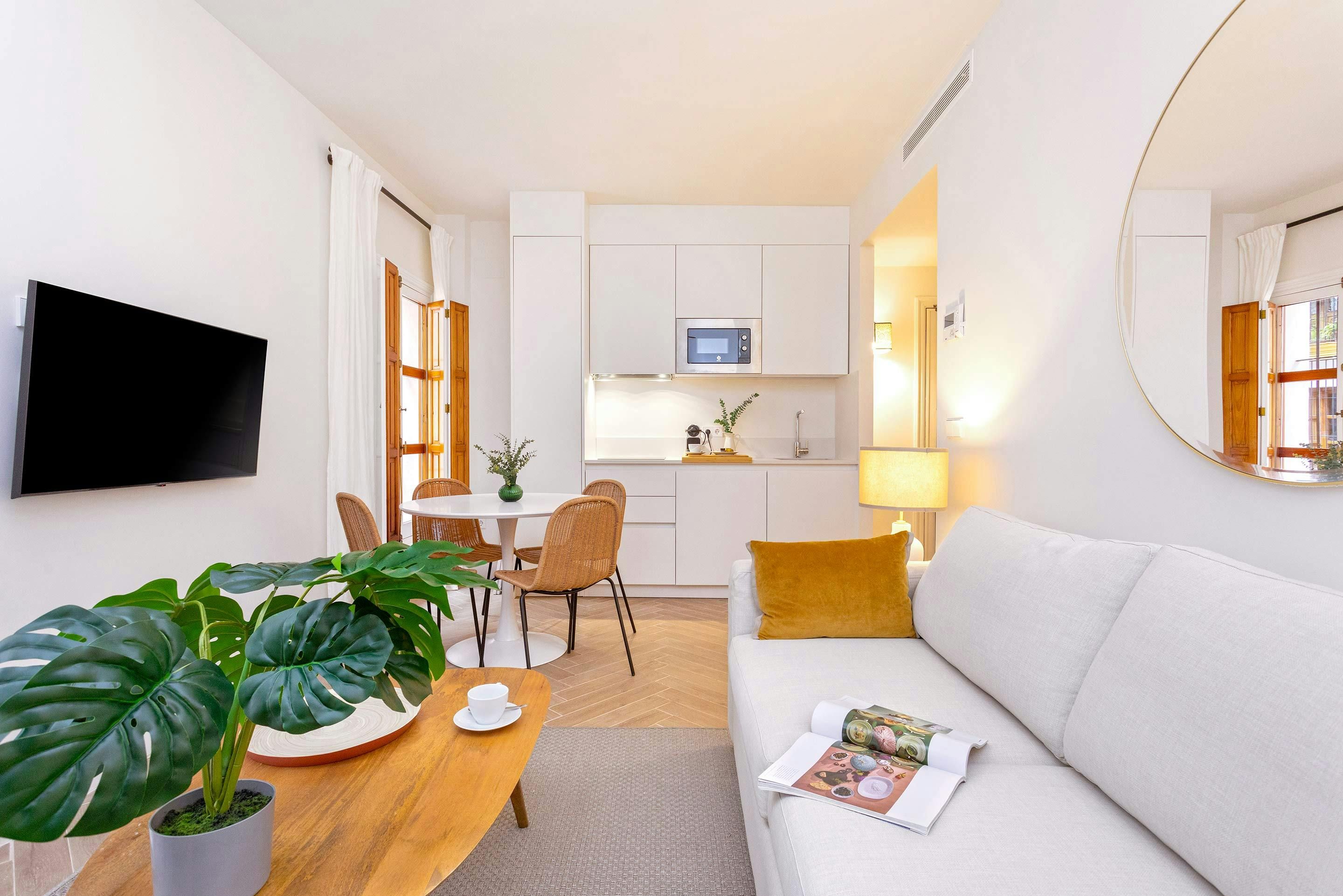This cosy apartment in the heart of Seville blends modern design with a homely Spanish feel. The open-plan living space is bright and practical, giving you a comfortable spot to unwind before or after your city adventures. It’s not huge, but you’ll have everything you need for a relaxing stay. When it’s time to head out, Seville’s best restaurants, shops, and landmarks are just moments away, including the Cathedral, the Giralda, and the Royal Alcázar.