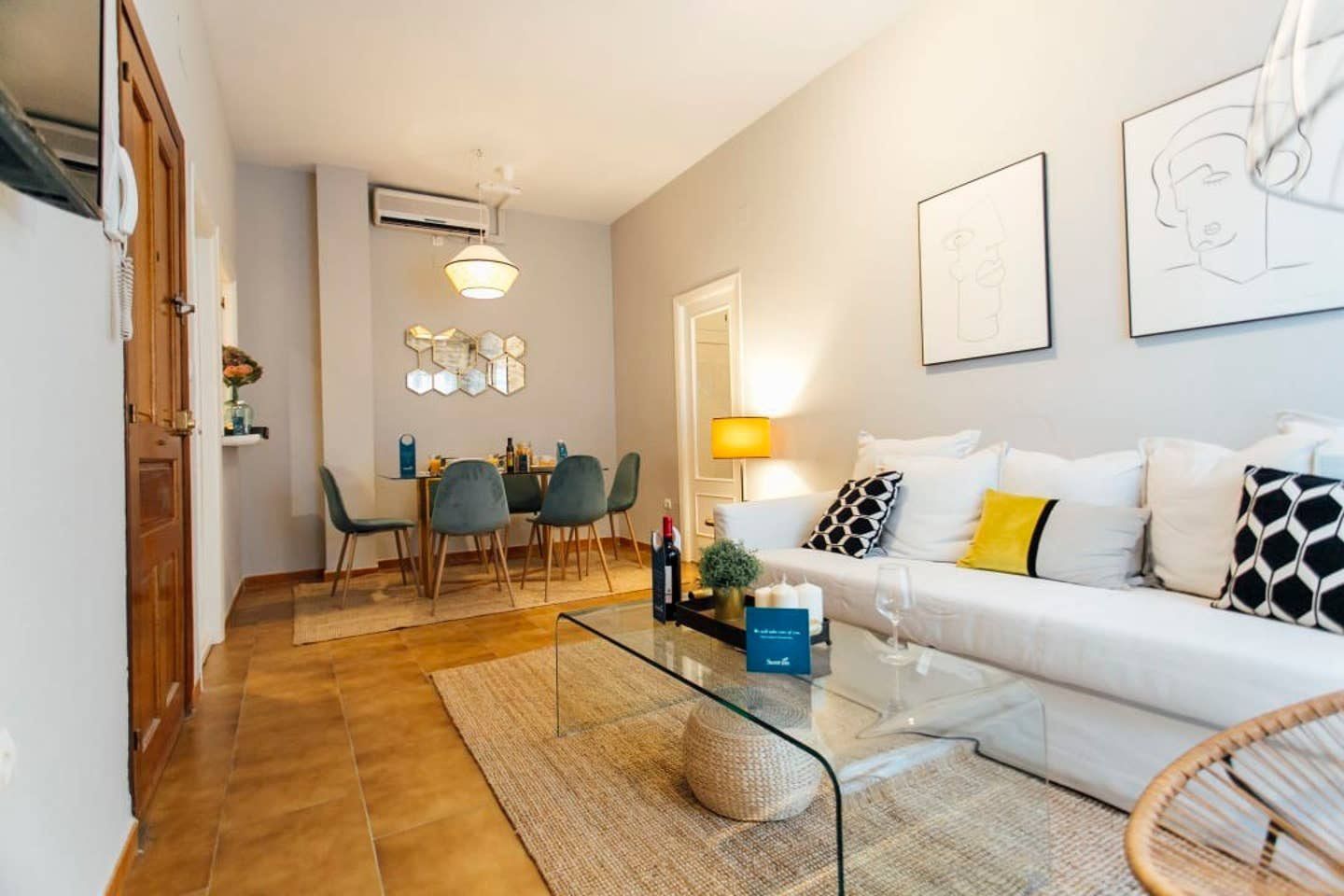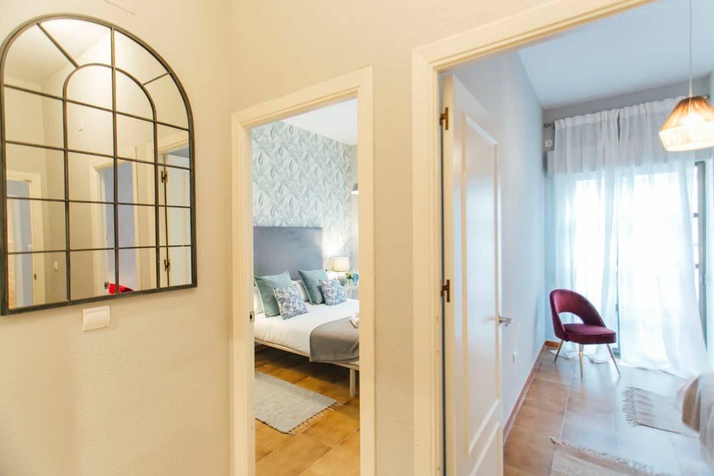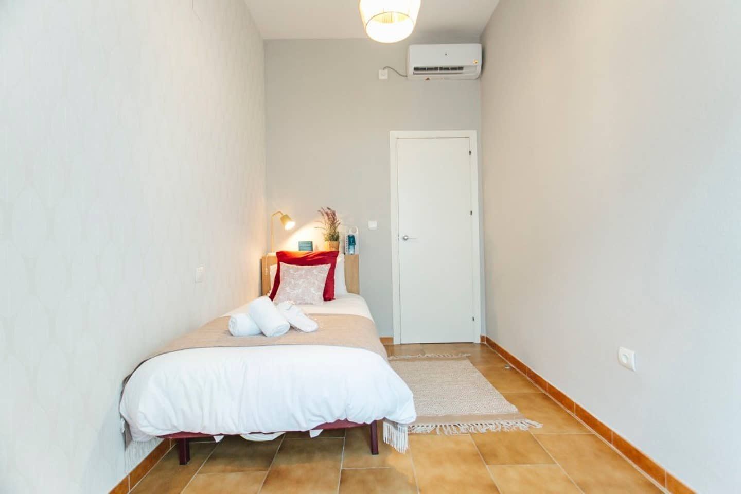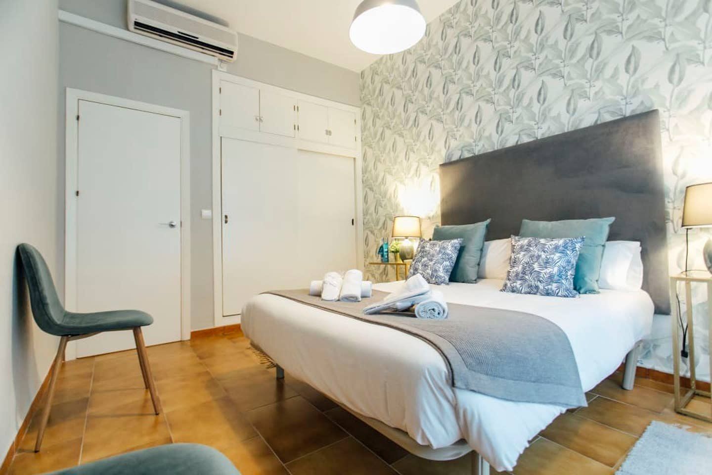 Back inside, you'll find a bright and modern living space combining wood floors, contemporary furnishings and minimalist artwork to create a stylish home. The open-plan layout invites you to socialise with your group, whether that's over a glass of Rioja on the comfy sofa or at the dining table for a Spanish feast. Through to the master bedroom, where you'll notice the tiled flooring, bold wallpaper prints and sumptuous bedding that ensures a restful night's sleep, ready for another day of Seville sightseeing.
