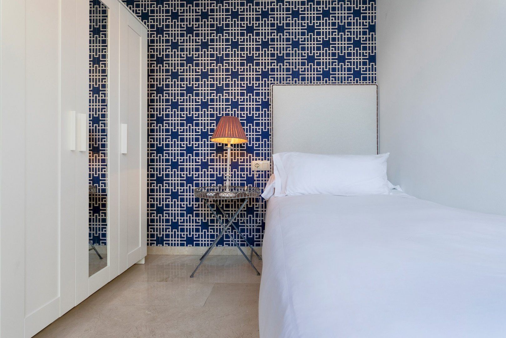 Step into the open-plan living area to be met with glossy marble floors, tall ceilings and an elegant mix of classic and contemporary decor. We love the amount of natural light that pours into the space from the wood-panelled French doors that open out onto pretty Juliet balconies. The bedrooms, meanwhile, are just as chic with their statement walls and pared-back, yet refined aesthetic, inviting you to sleep soundly in their comfortable beds.
