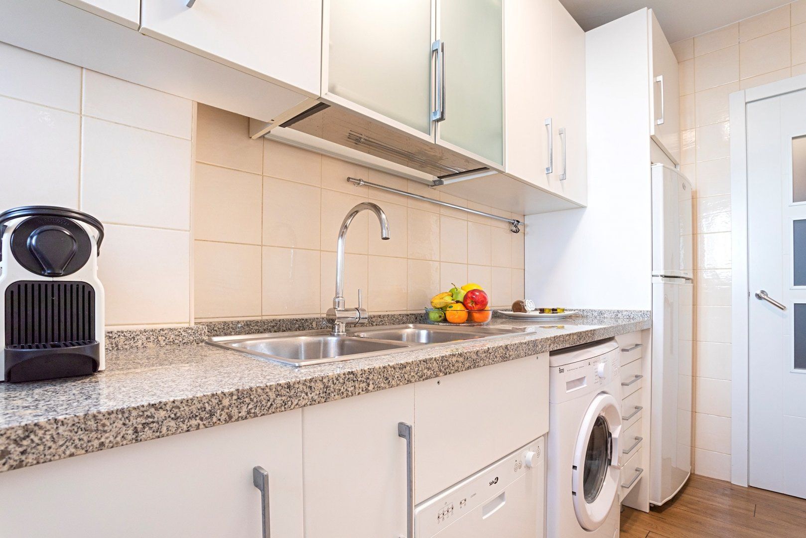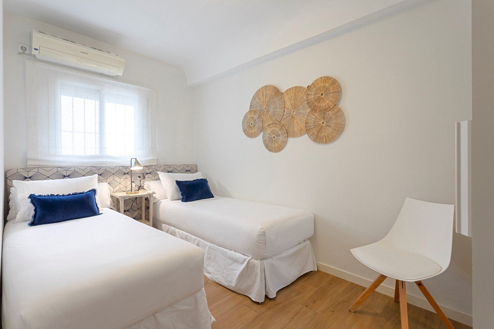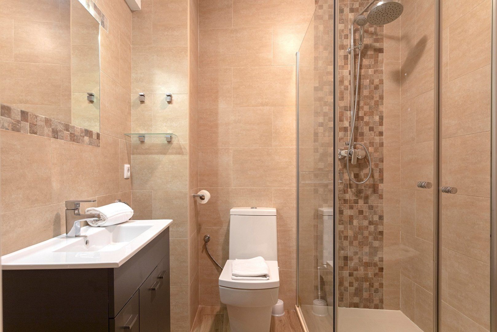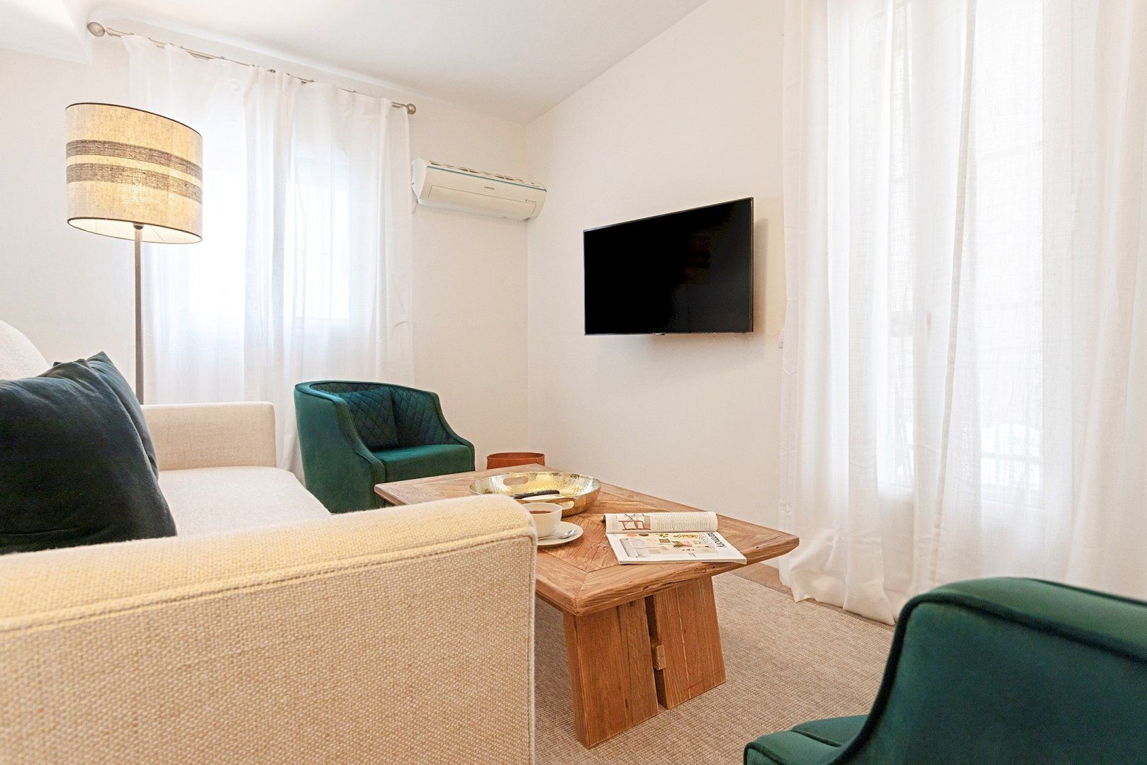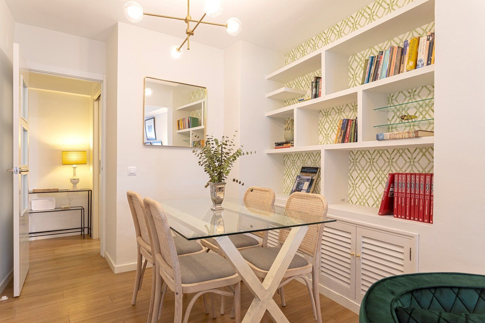 Inside this cheerful home, you'll find a bright kitchen perfect for plating up a breakfast of churros. Above the dining table, why not pluck a book from the shelf and spend a slow morning reading in your velvet armchair? Later, come back and take a siesta in this serene bedroom. Then, hop under the rainfall shower and enjoy getting ready for an evening out on the town. We love that you have ample storage space here too, so you can bring an outfit for every occasion.