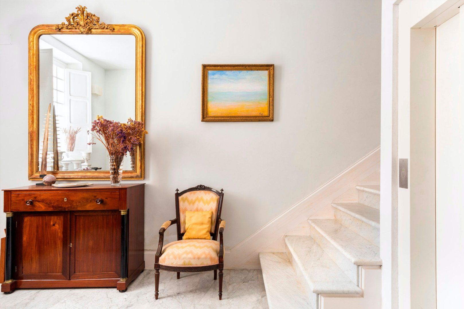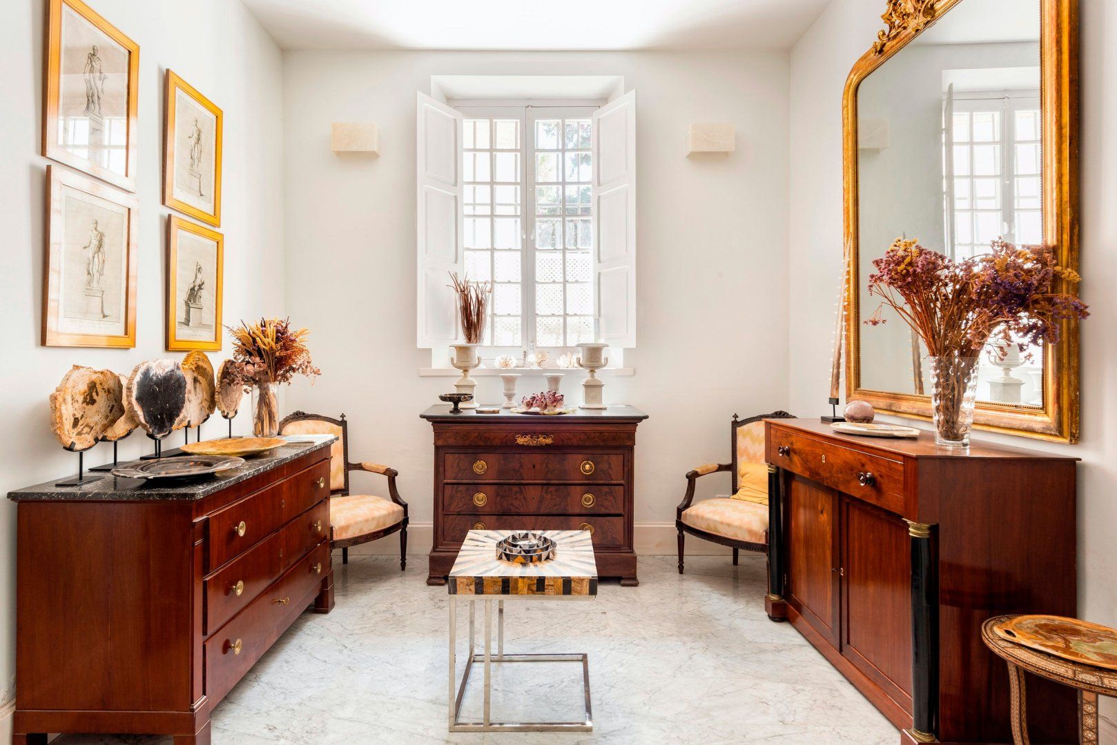 We particularly love the eclectic selection of artwork decorating the space with contemporary elegance. Not to mention the mismatched antique furniture pieces and modern practicalities that seamlessly intertwine throughout the home.