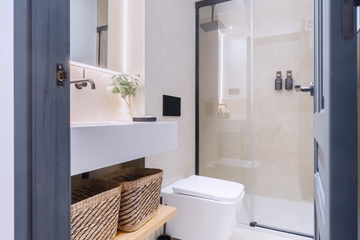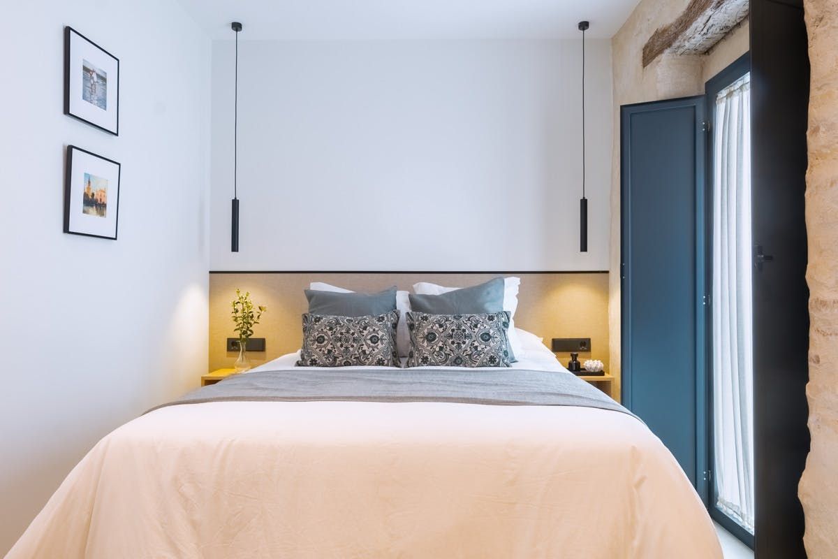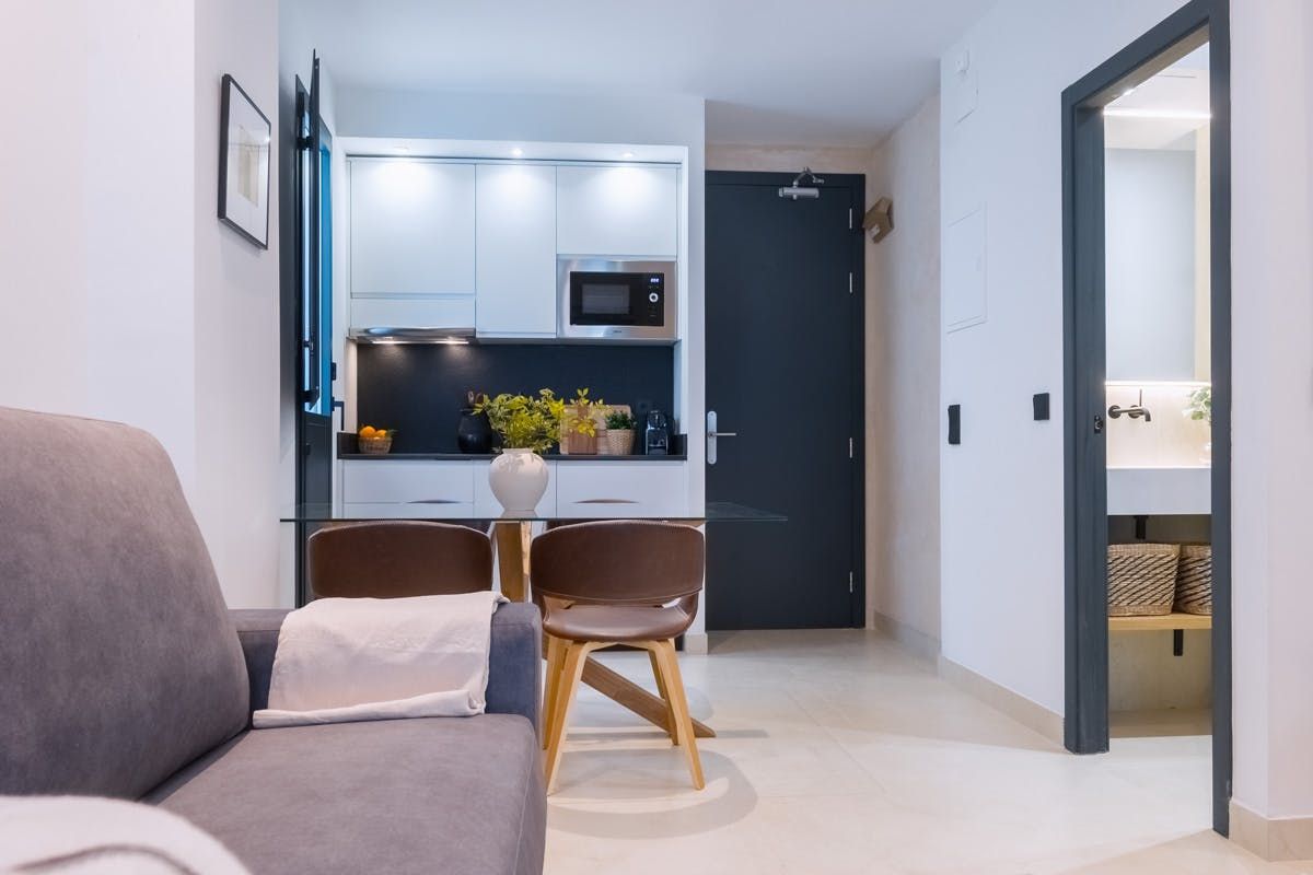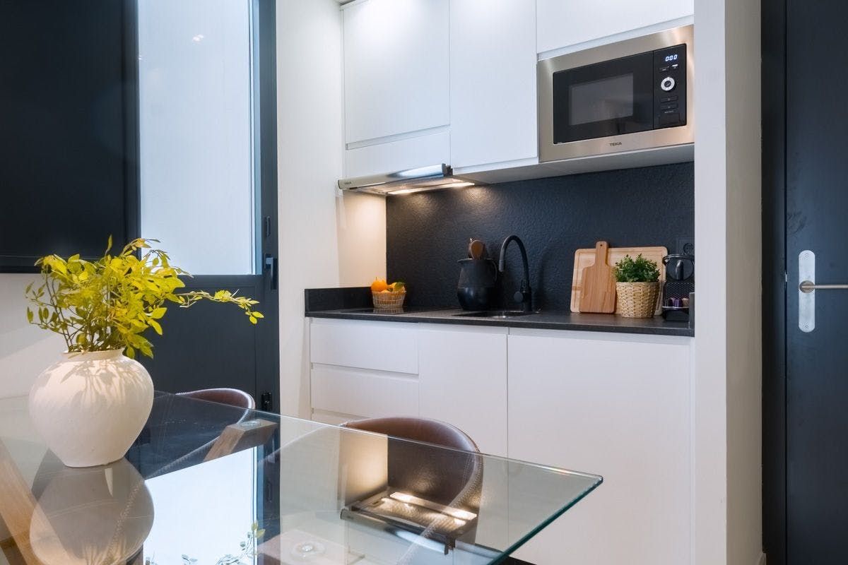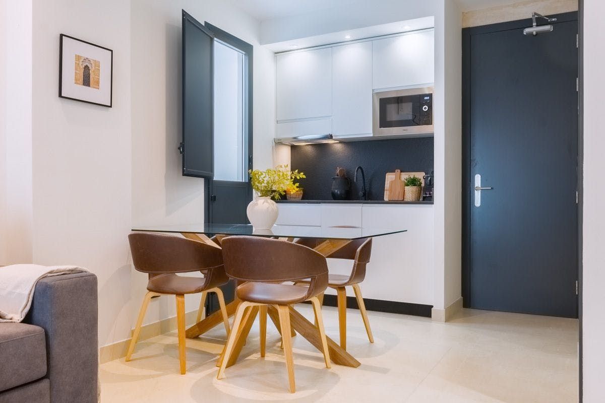 This studio apartment features a shared rooftop terrace, complete with a small swimming pool and city views. The studio itself is stylish and minimal. And, while being on the snug side, it's furnished with everything you could need for a fuss-free stay. There's a compact kitchen that's perfect for whipping up light bites, and the double sofa bed is an added bonus – especially if you're travelling with friends or family. The private balcony is a nice touch, too, and makes a great perch for people-watching with a morning coffee.
