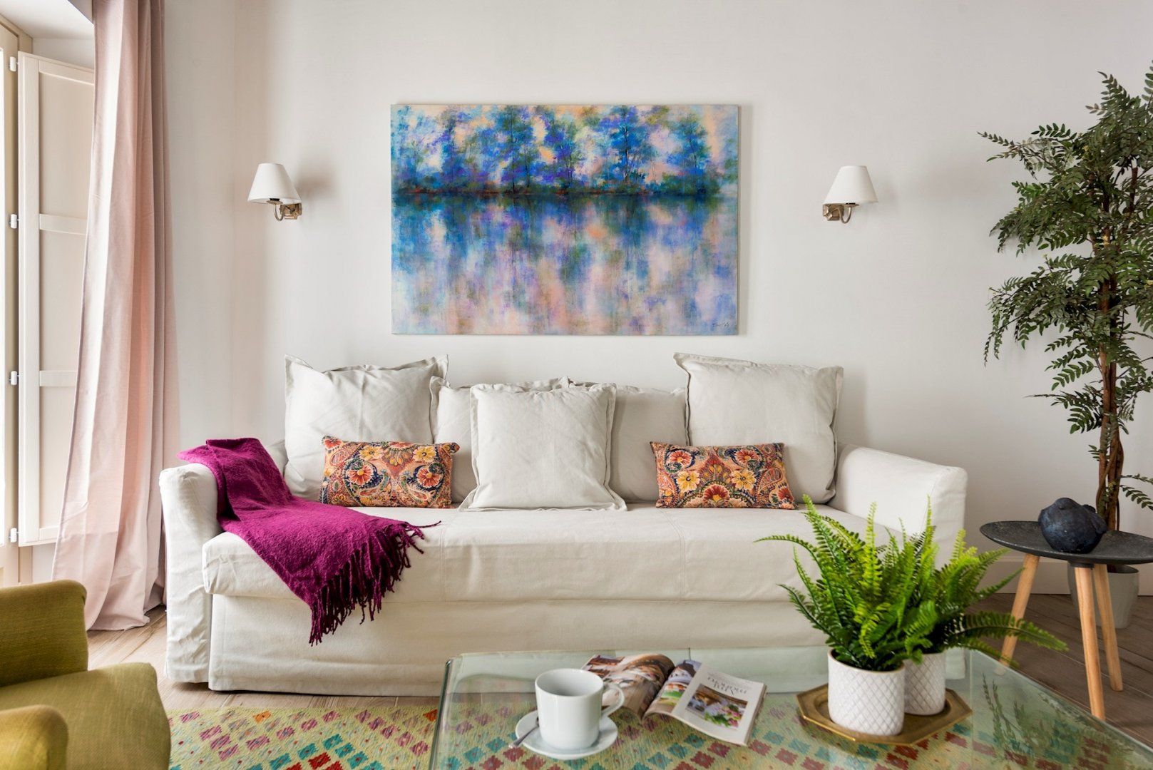 Pretty pops of colour, contemporary designs and heaps of natural daylight create a soothing space to switch off, relax and rejuvenate between soaking up Seville. While exposed wooden beams and leafy green plants bring charm to the apartment, soft materials and cosy blankets create a blissful ambience that makes retreating here after a day's adventures oh so easy.