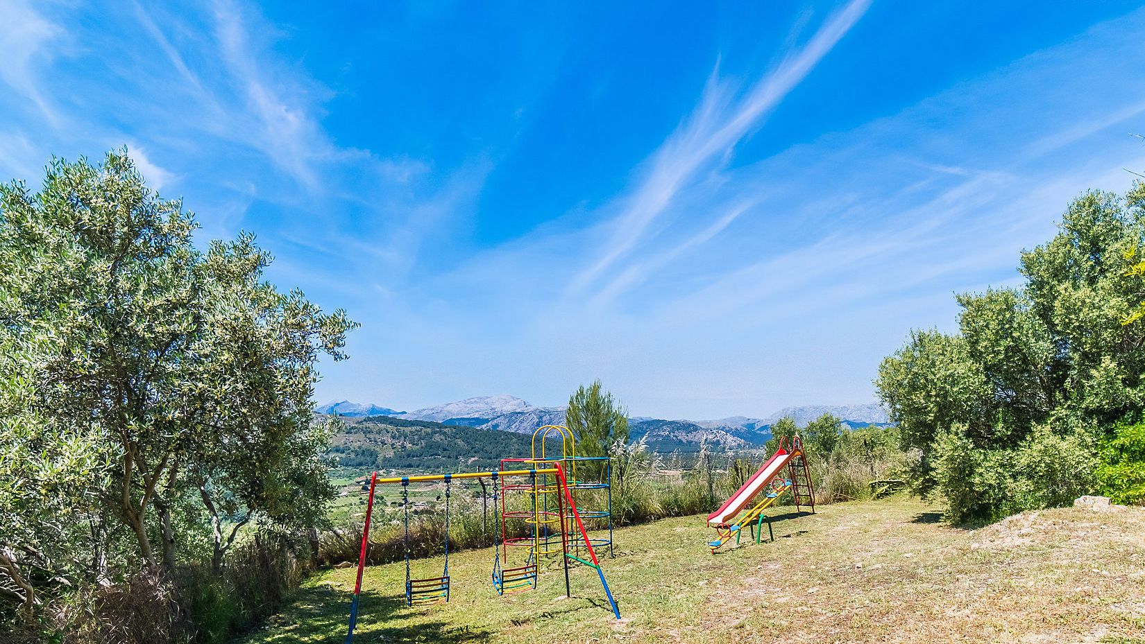 Inside, you’ll find traditional features like tiled floors and antique furniture alongside modern amenities such as a home cinema and a games room. Outside, several terraces call out for alfresco dining, while the swimming pool sparkles in the sunlight. There’s a shallow end, so little ones can have their fun safely too – there’s also a playground at this delightfully family-friendly home.