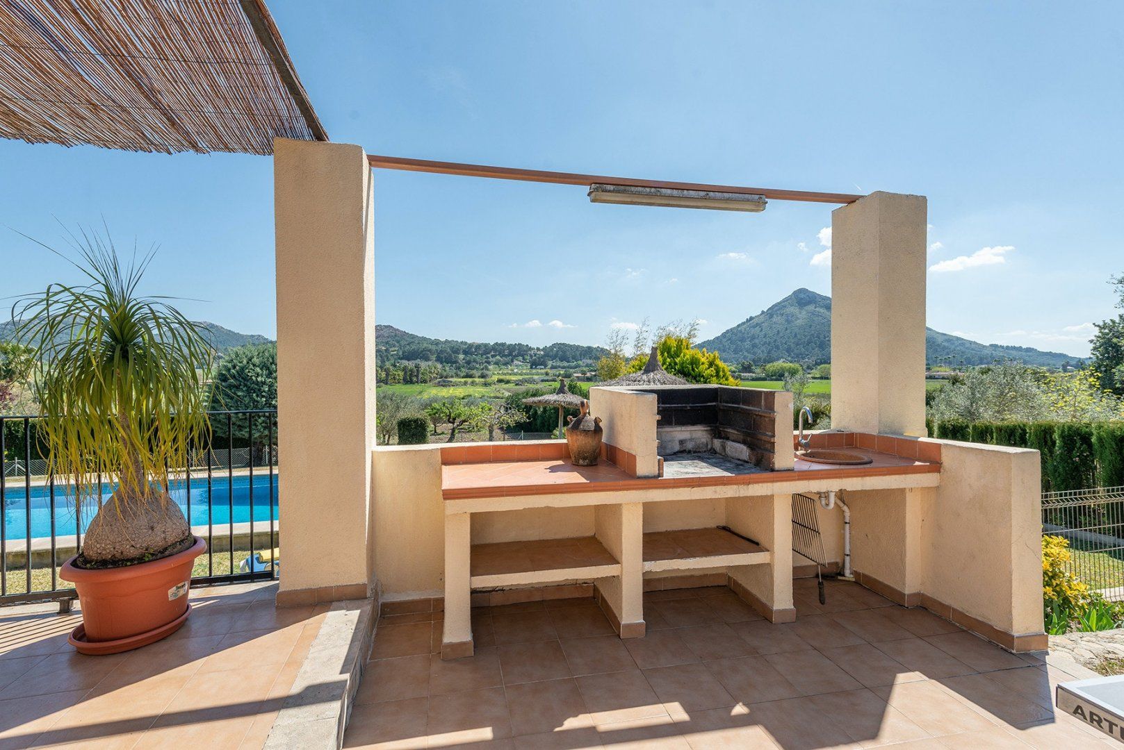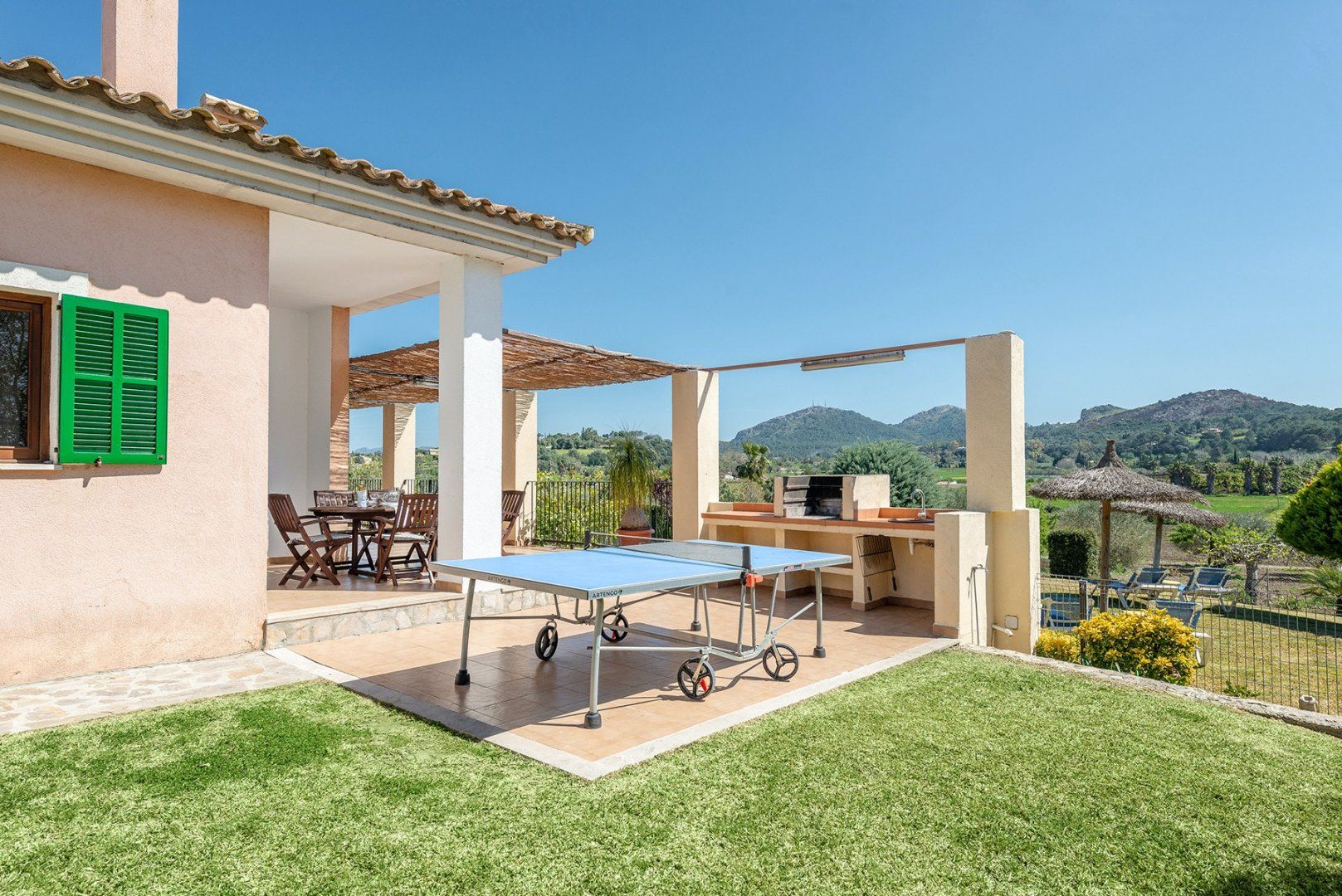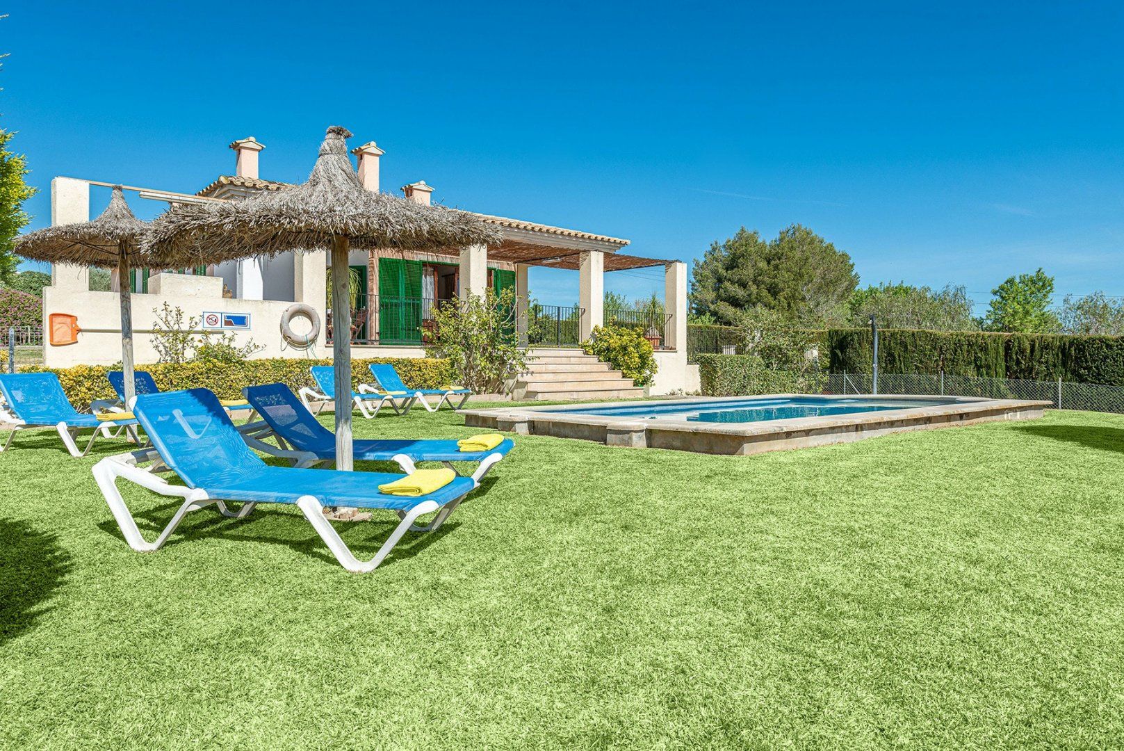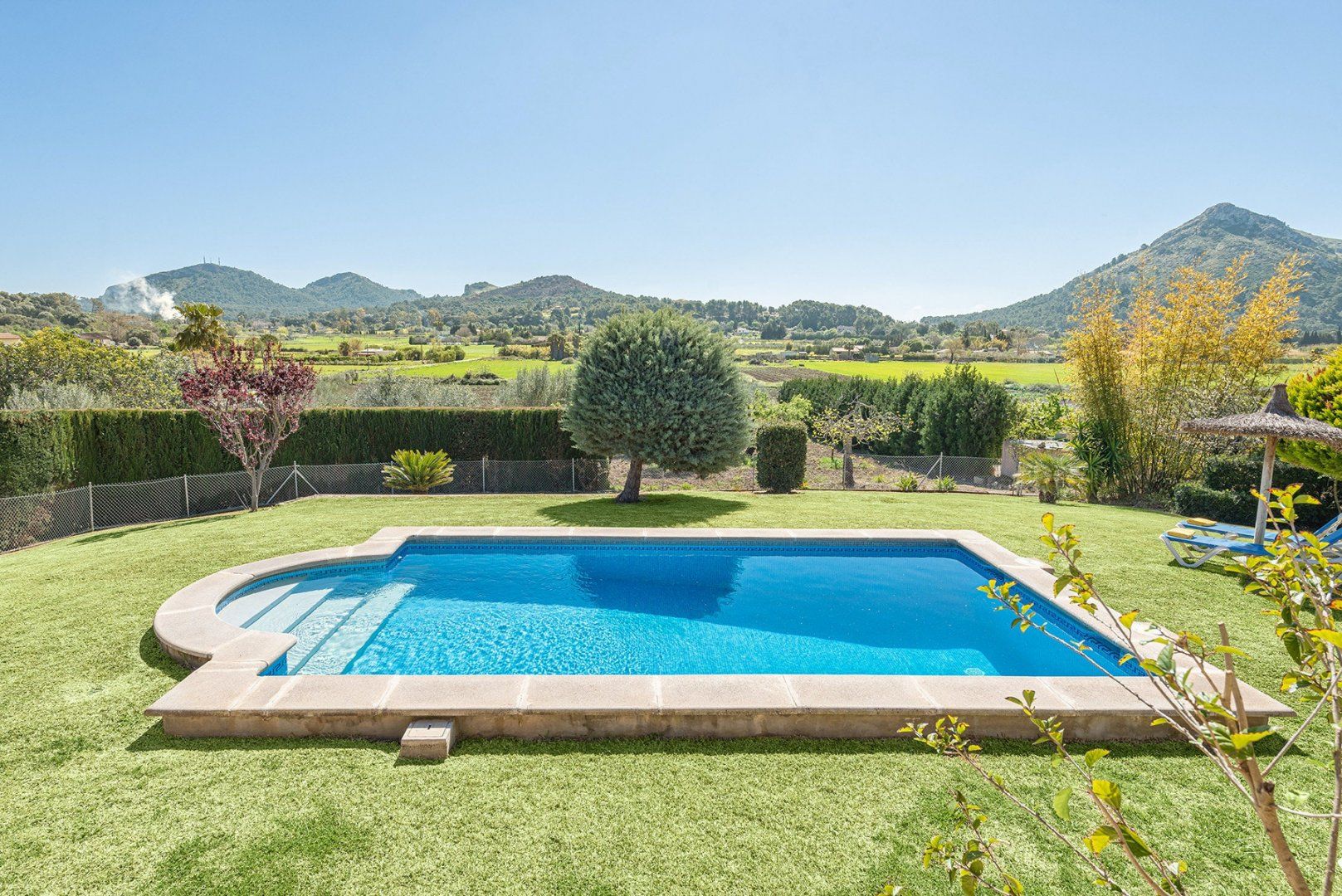 With a large swimming pool and wonderful mountain and countryside vistas, this villa is ideal for a family or friends looking for a peaceful setting. There’s a vine-covered terrace for alfresco dining, as well as a covered outdoor lounge area perfect for cocktails. Inside, the décor is simple, while the kitchen and bathrooms are a tad dated, we think. But with such a lovely garden, will you be spending much time indoors? If you want a change from the pool, Alcudia’s beach, Platja de Muro and Puerto de Pollensa are all around a ten-minute drive, while for bird watchers, S'Abufera Natural Park is 6 kilometres away and there’s a golf club 7 kilometres from this villa.
