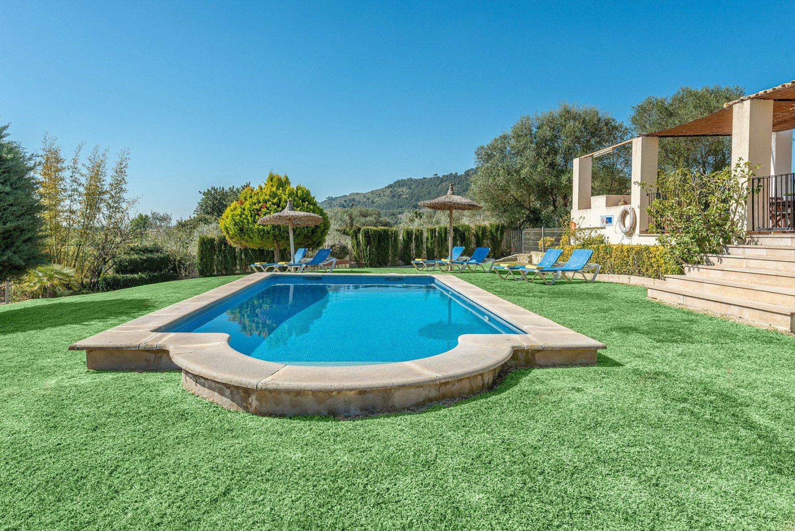 *There are around five wide steps down to the pool and garden from the terrace and villa