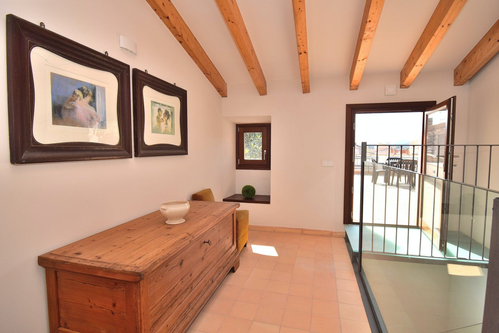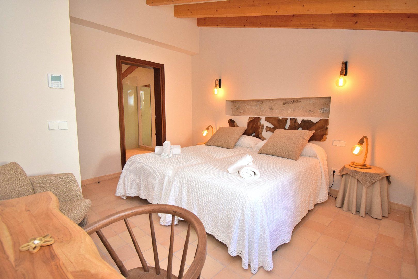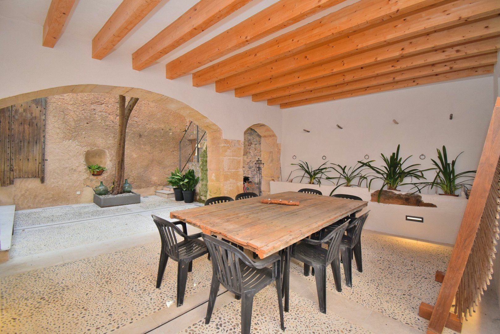 Surrounded by warm-hued stone, this home’s beautiful patio is a special space. Relax here with a glass of wine or cool off in the spa area with its small pool and water blade – it’s particularly magical in the evenings. There’s a roof terrace, too, with lovely views over picturesque Artá, perfect for unwinding in the Mallorcan sun.