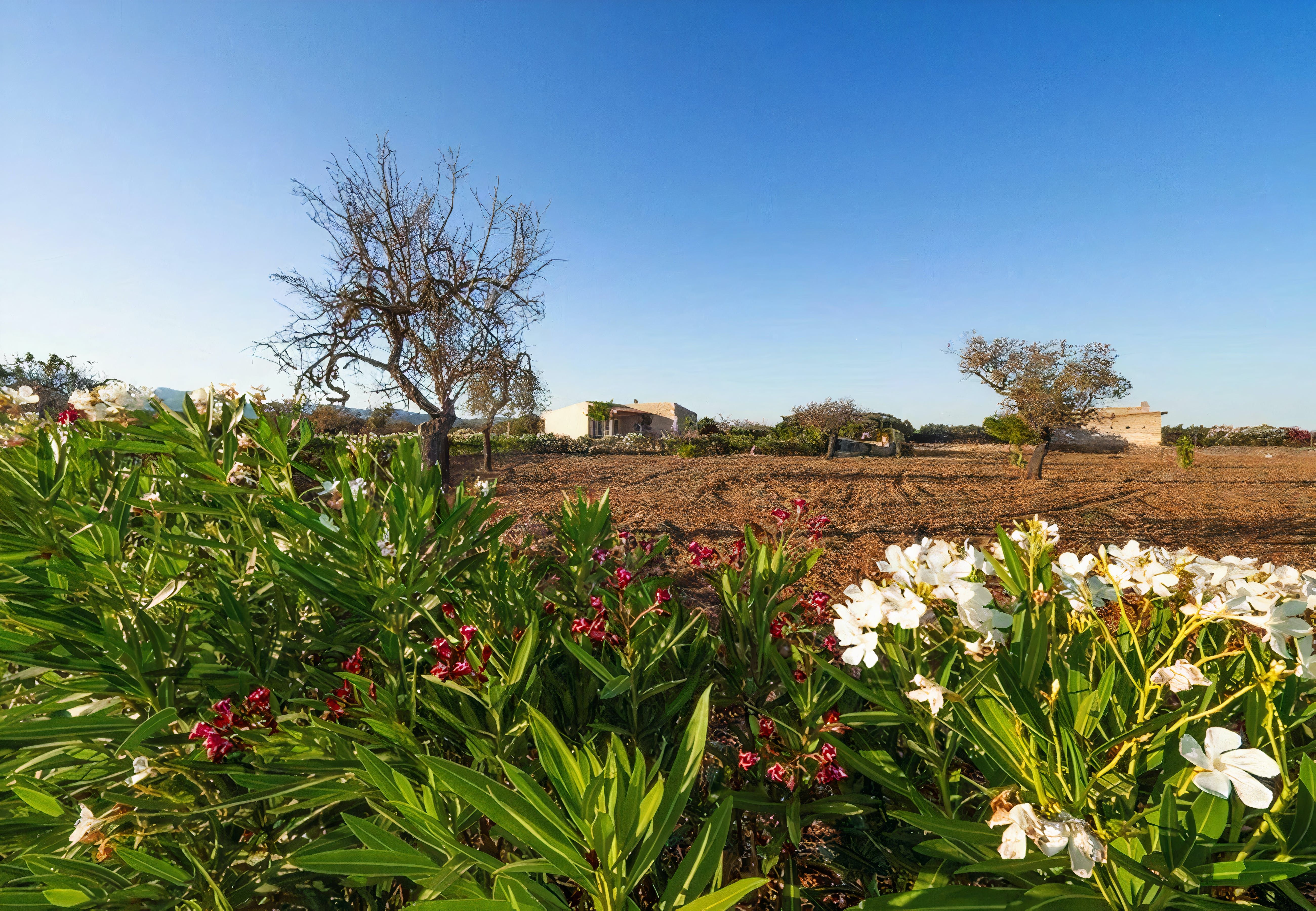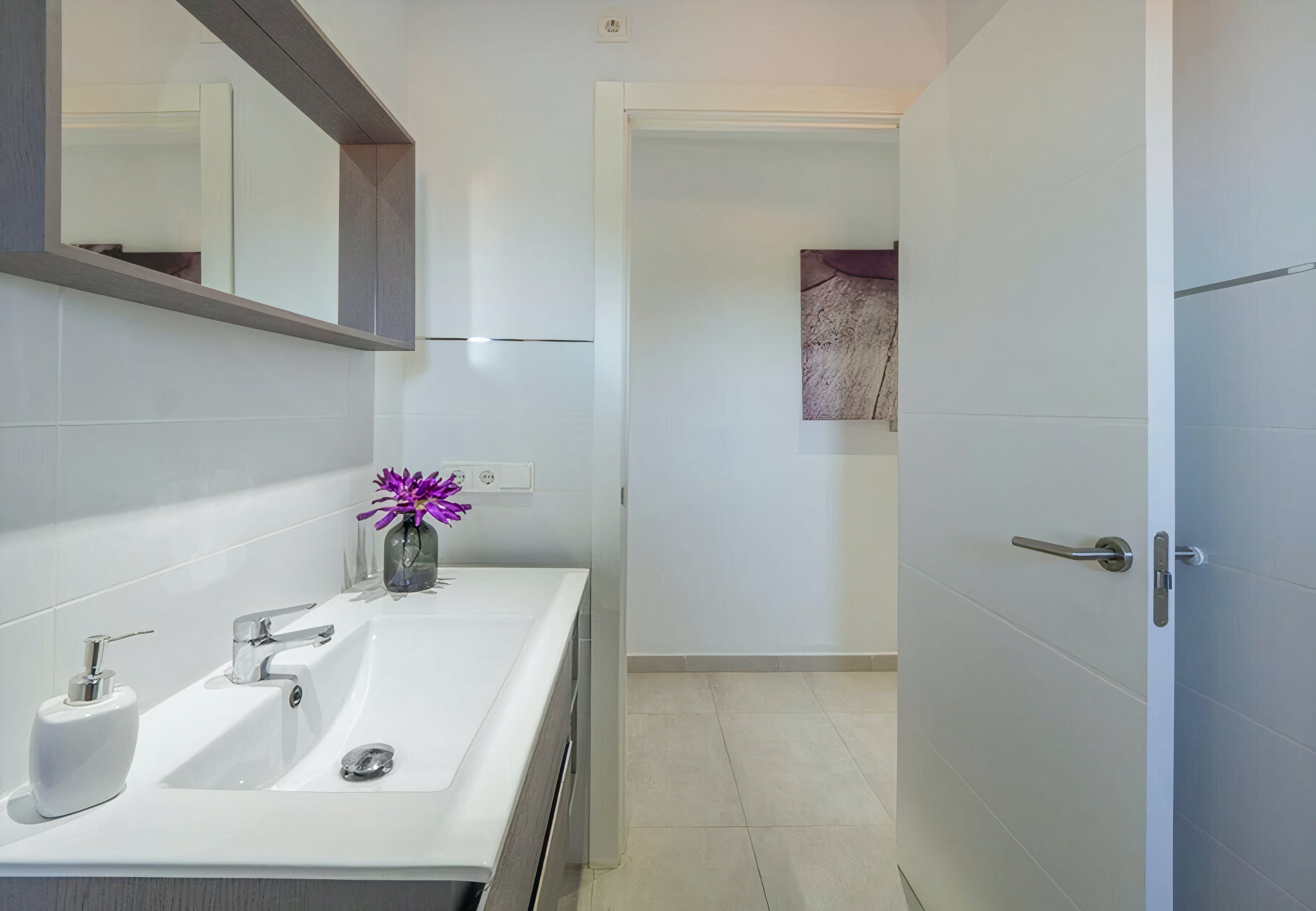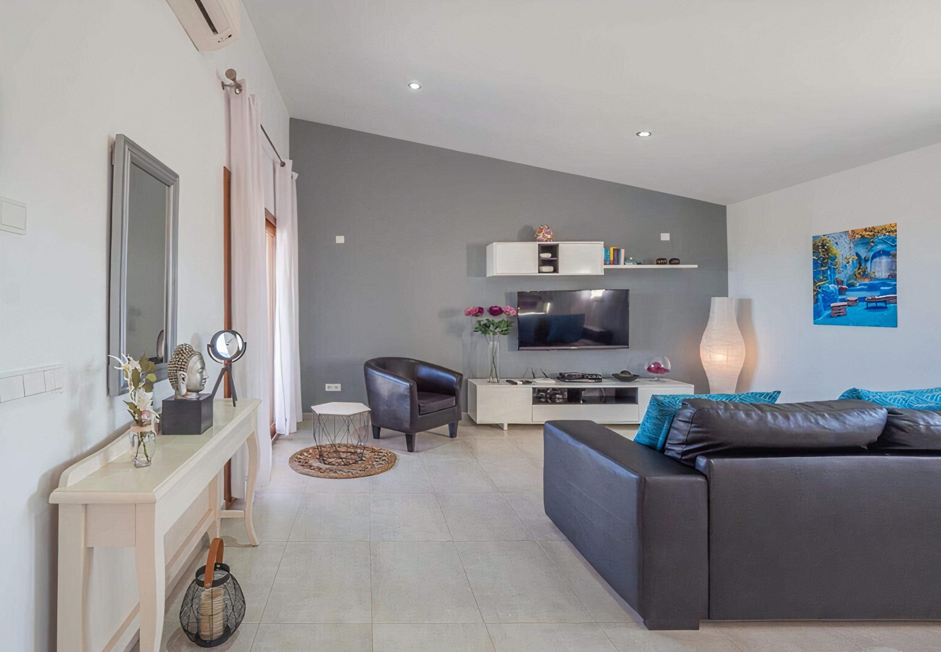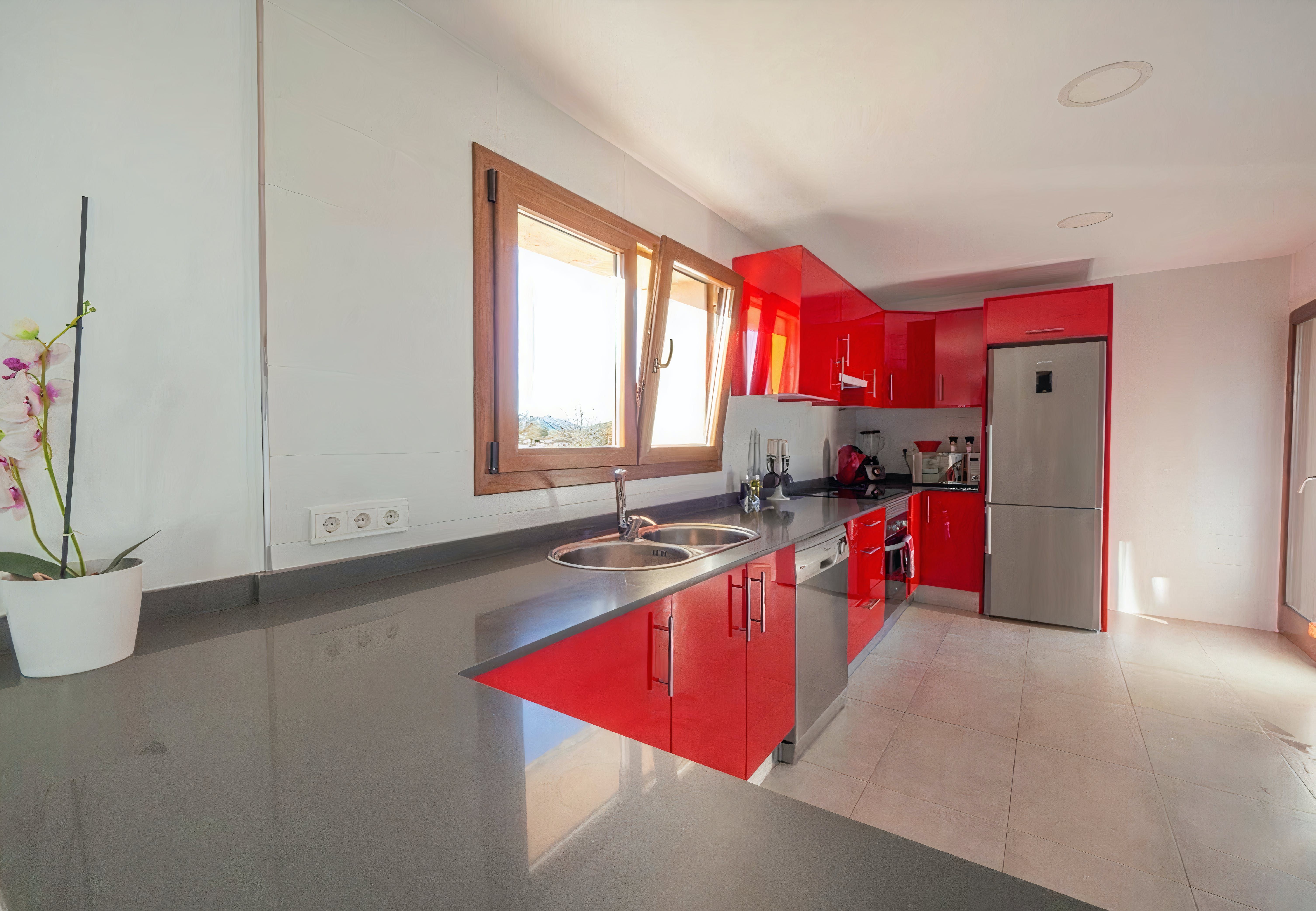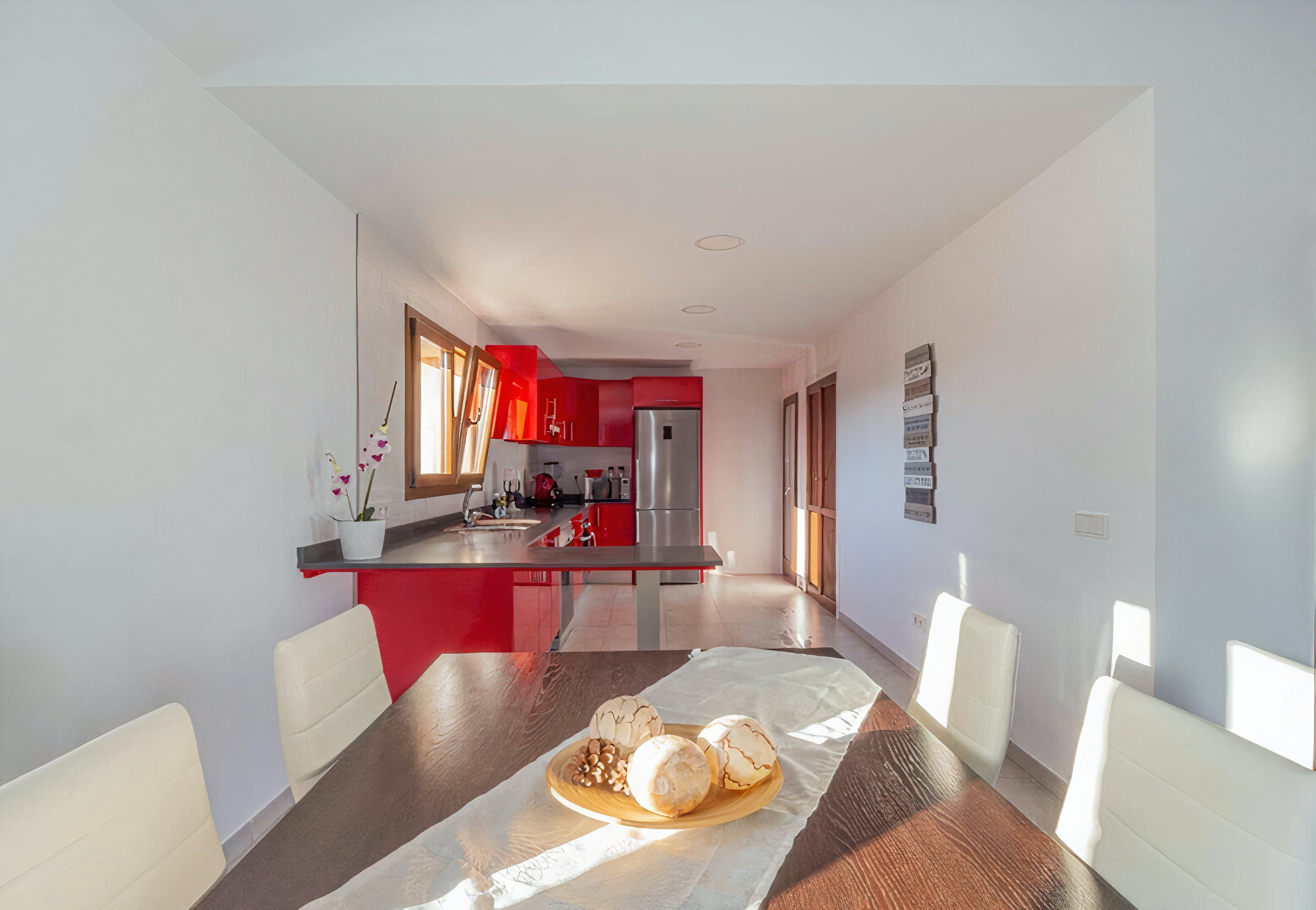 One glance at the exterior of this rural Mallorcan finca and you'll fall in love with the rustic character. Tan-coloured stone, clay roof, terracotta tiles – it's as traditional as they come. Step inside, however, and you'll find contemporary living spaces and all the mod-cons you'll need. Glossy as a bright red apple, the kitchen is well-stocked for dishing up whatever strikes your fancy. The leather sofa is the perfect spot to kick back after a walk through the countryside, and two comfortable bedrooms promise a restful night's sleep.