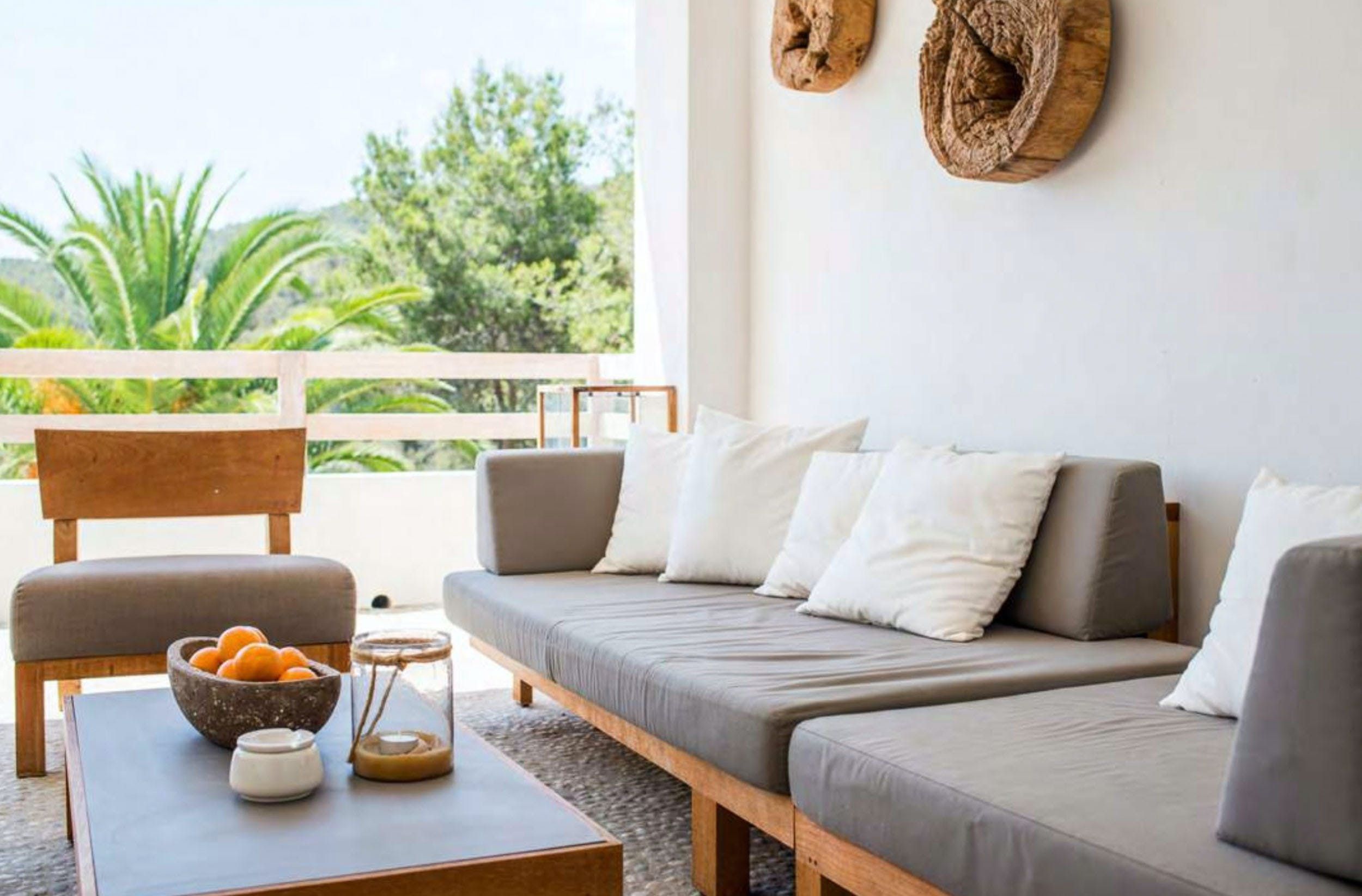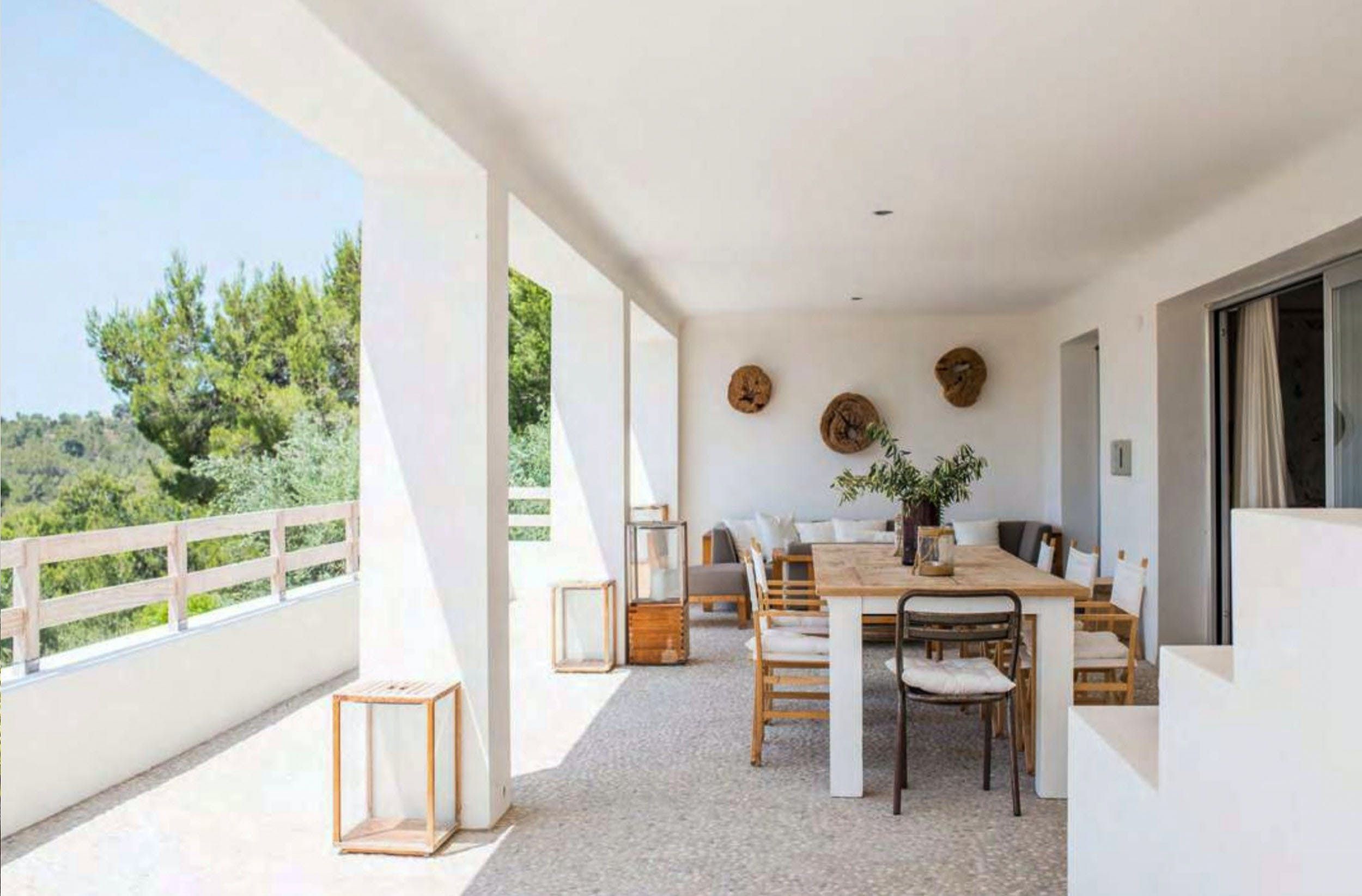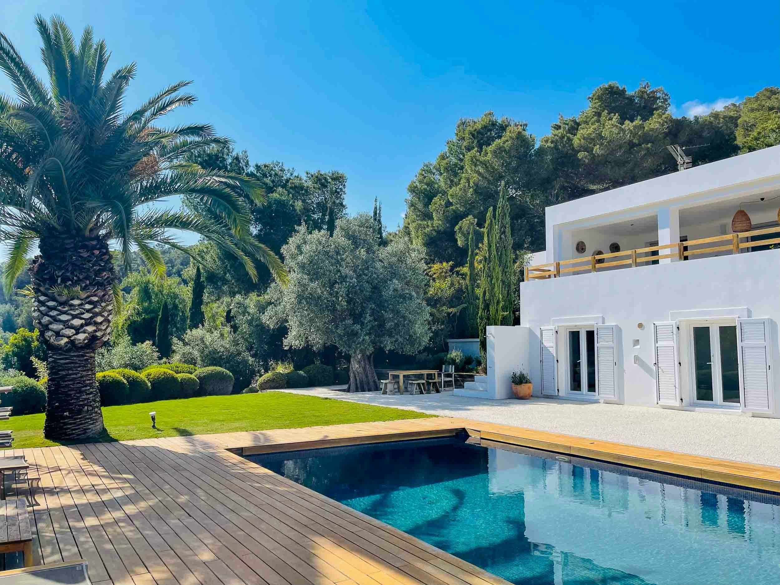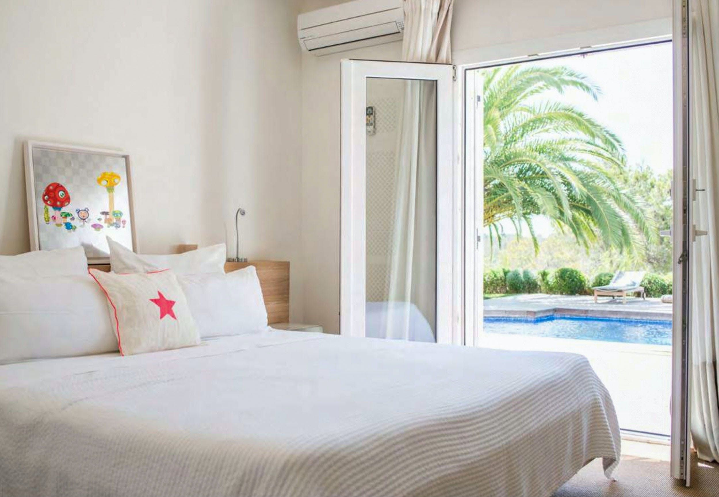 This bohemian home is a beautiful base for an Ibizan escape. There’s a guest house and the main villa, giving you plenty of space to gather together – or sneak off for quiet moments for two. Outside, you’ll find a lush garden filled with palm and olive trees, and a heated pool at its heart. Sunbathe on the loungers on the wooden deck, or doze in the shade of a parasol. A wood-fired grill makes dining alfresco a breeze. Inside, this boho-chic home is all neutral tones and natural materials – it’s peaceful and pretty.