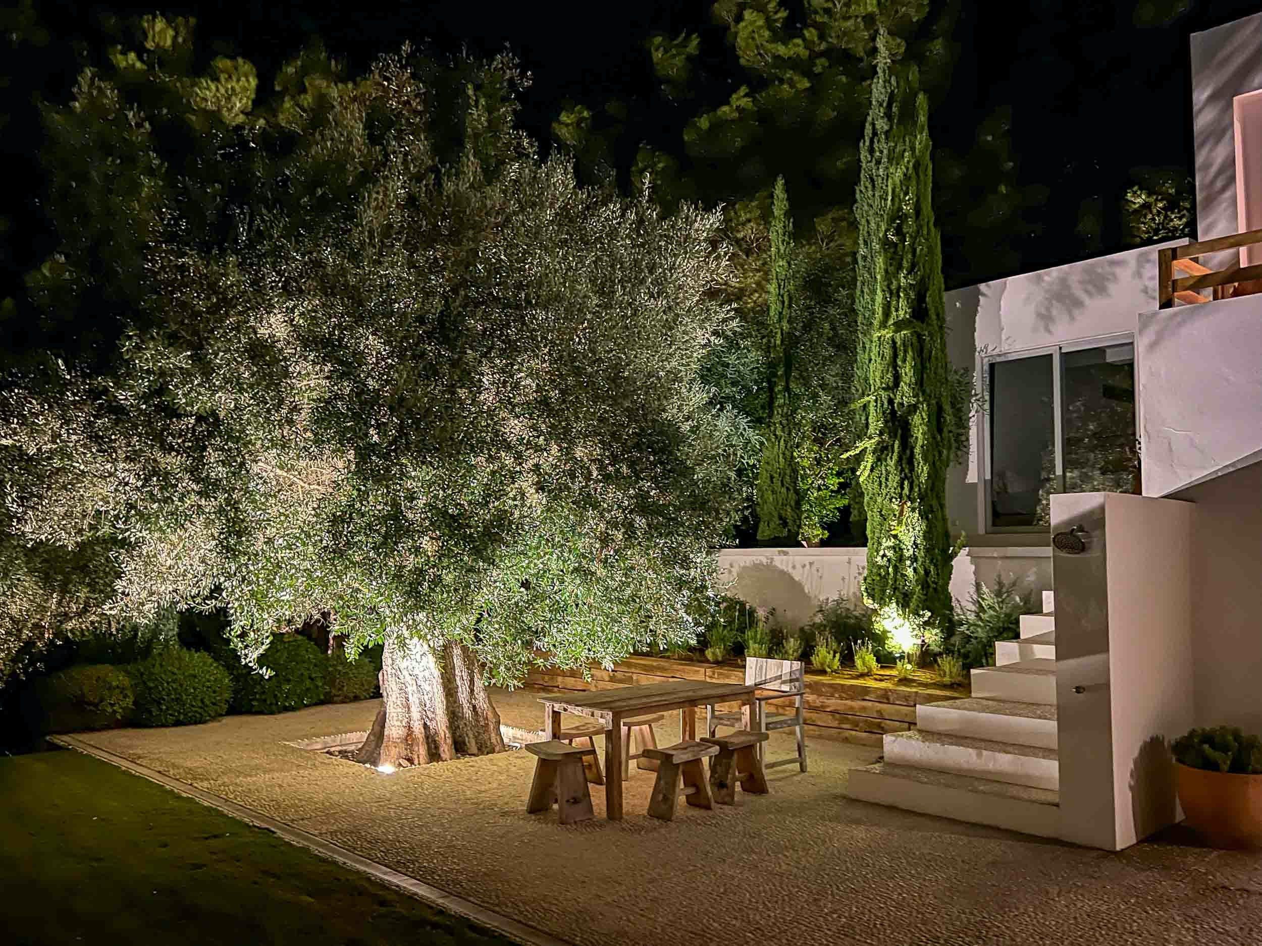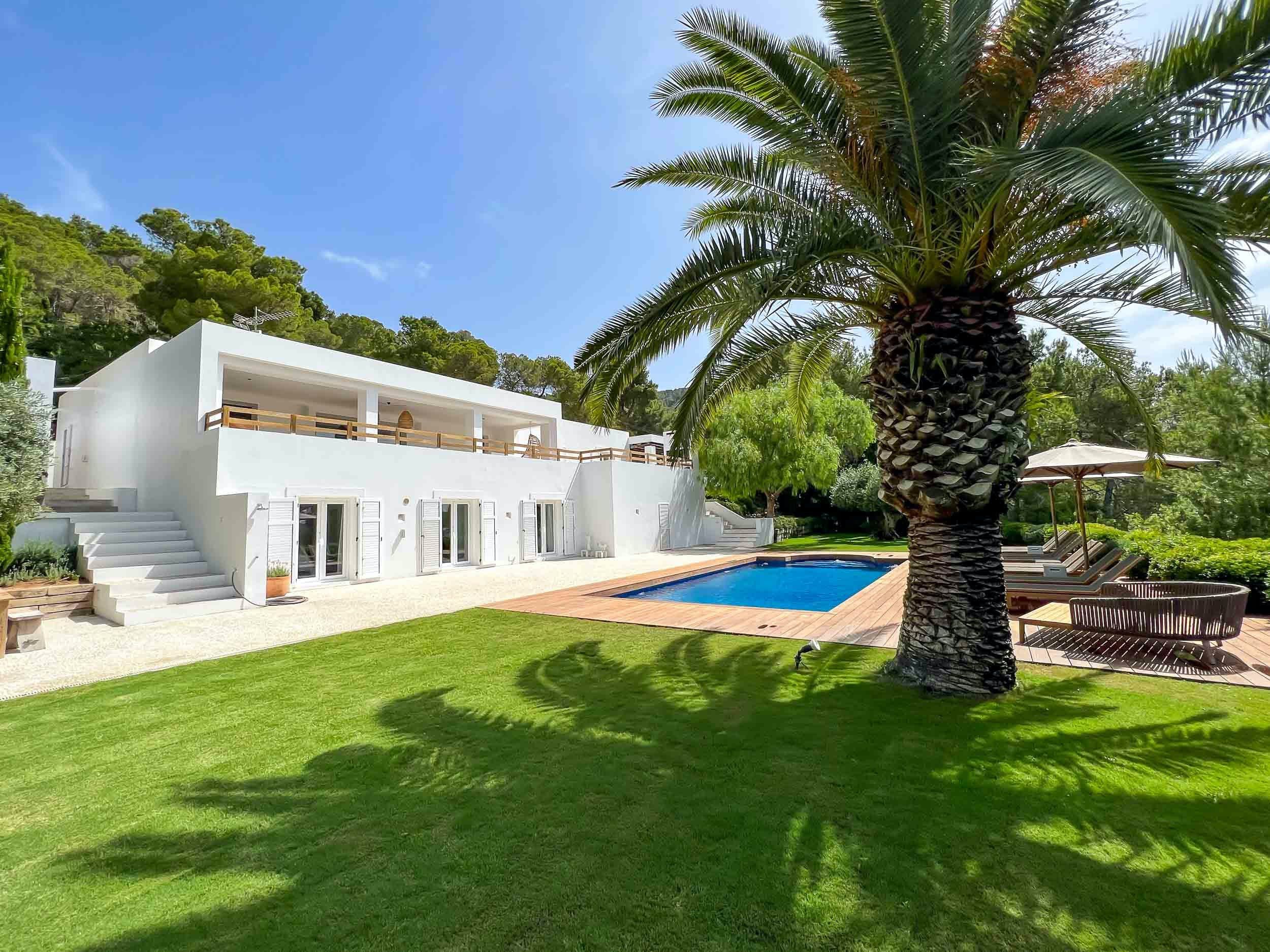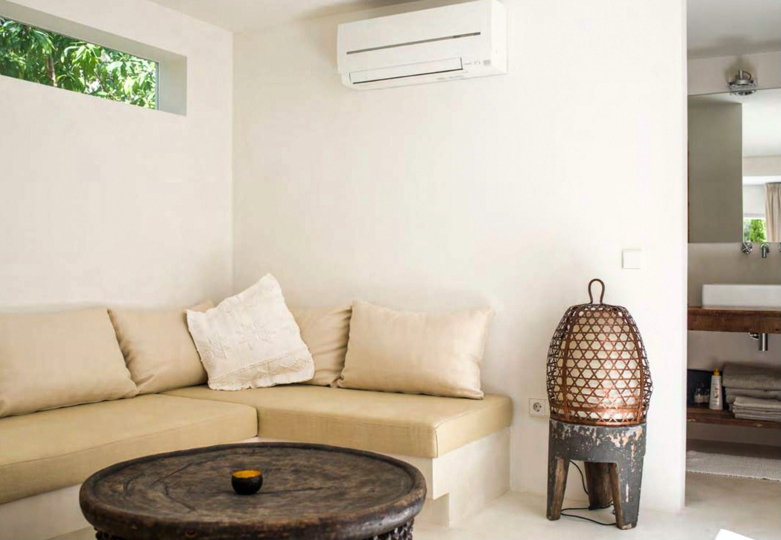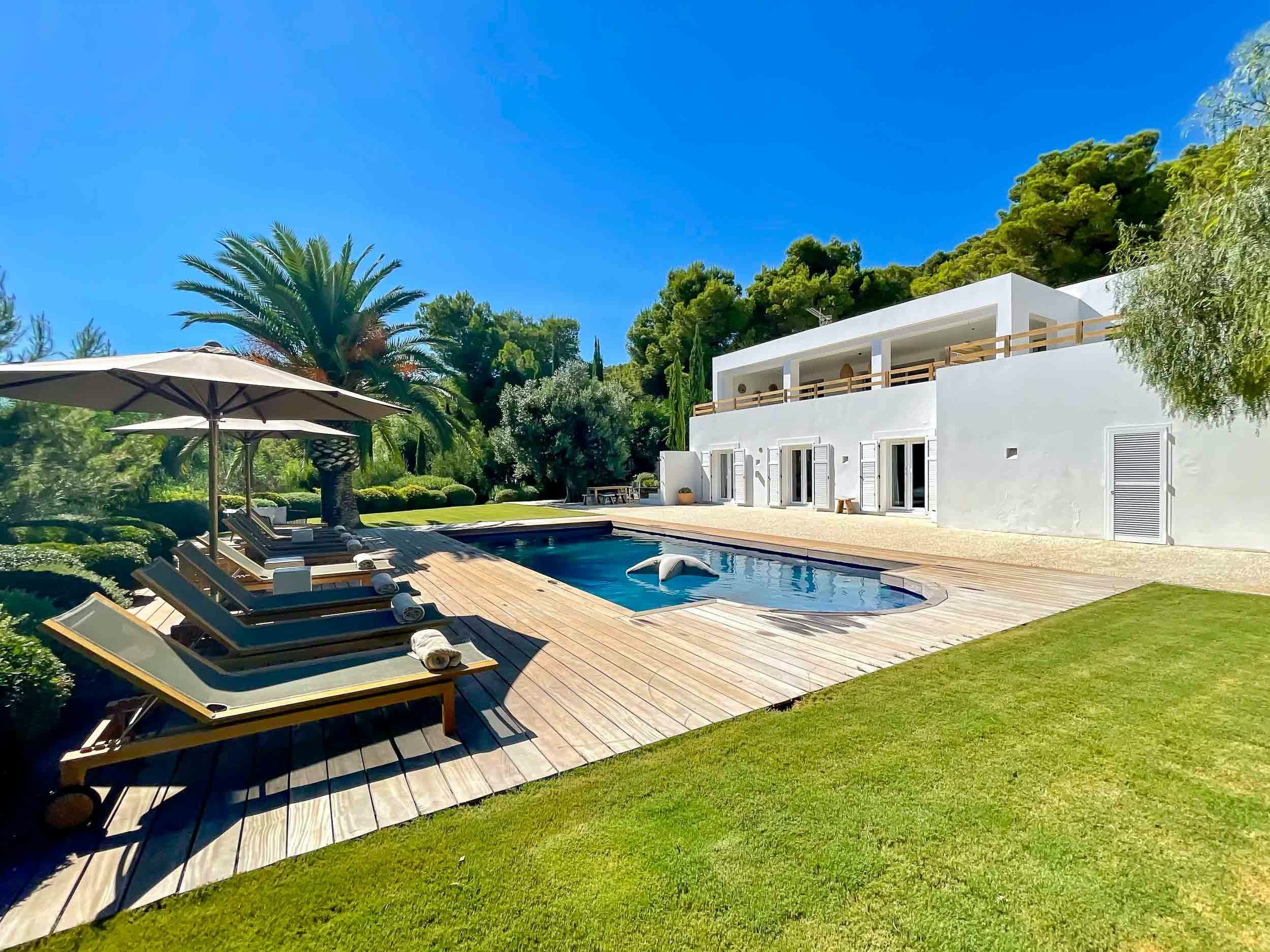 This bohemian home is a beautiful base for an Ibizan escape. There’s a guest house and the main villa, giving you plenty of space to gather together – or sneak off for quiet moments for two. Outside, you’ll find a lush garden filled with palm and olive trees, and a heated pool at its heart. Sunbathe on the loungers on the wooden deck, or doze in the shade of a parasol. A wood-fired grill makes dining alfresco a breeze. Inside, this boho-chic home is all neutral tones and natural materials – it’s peaceful and pretty.