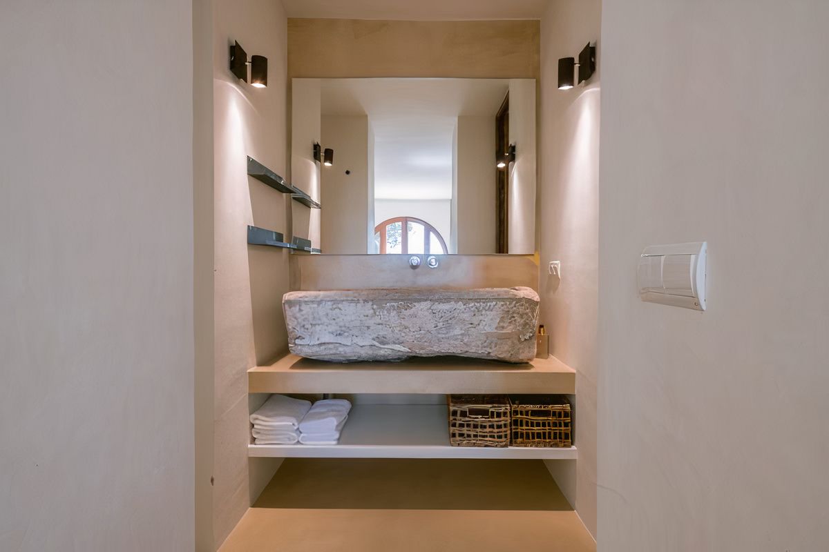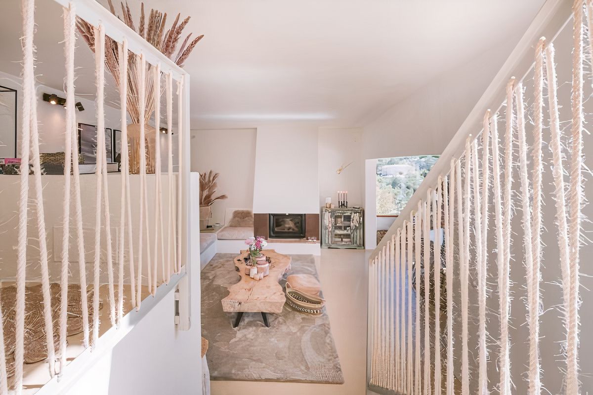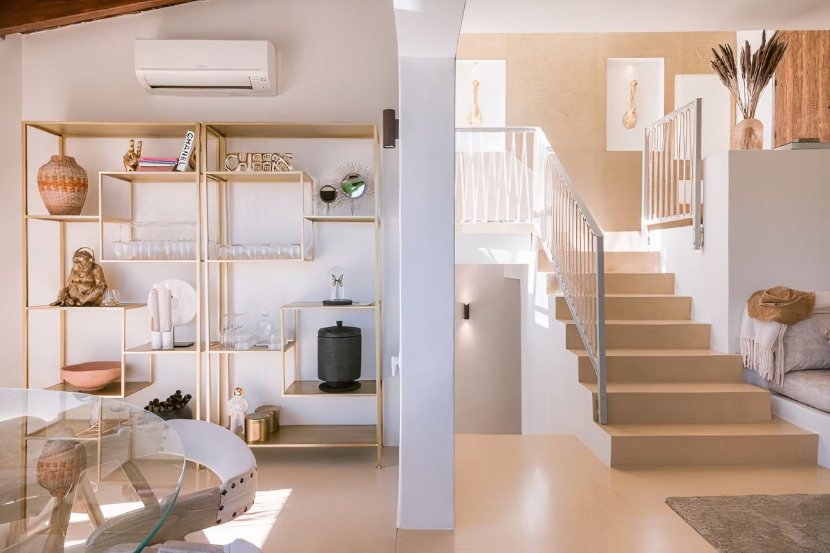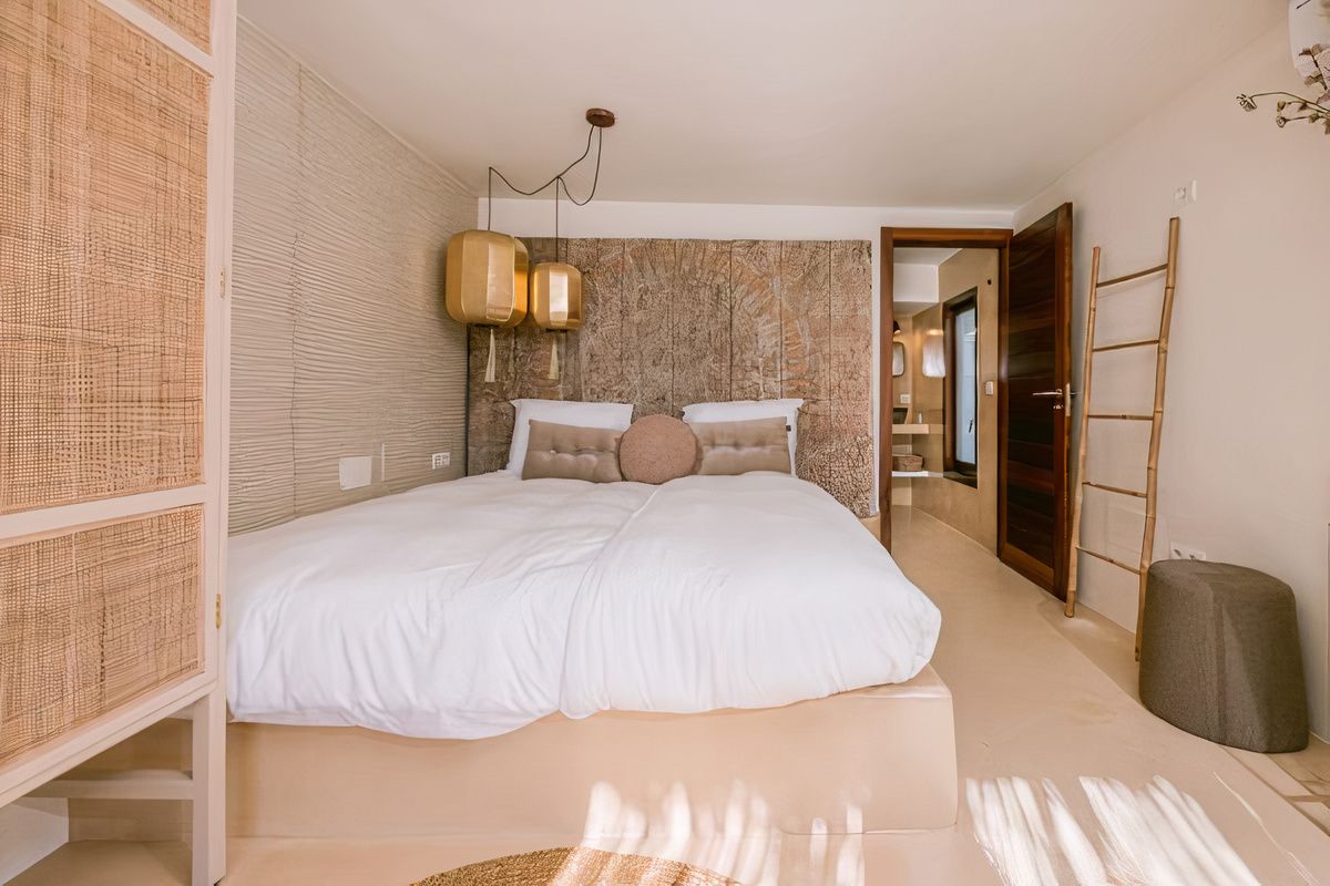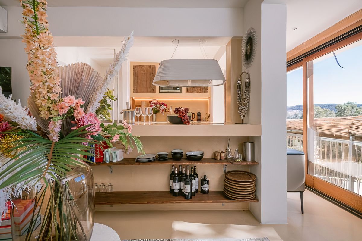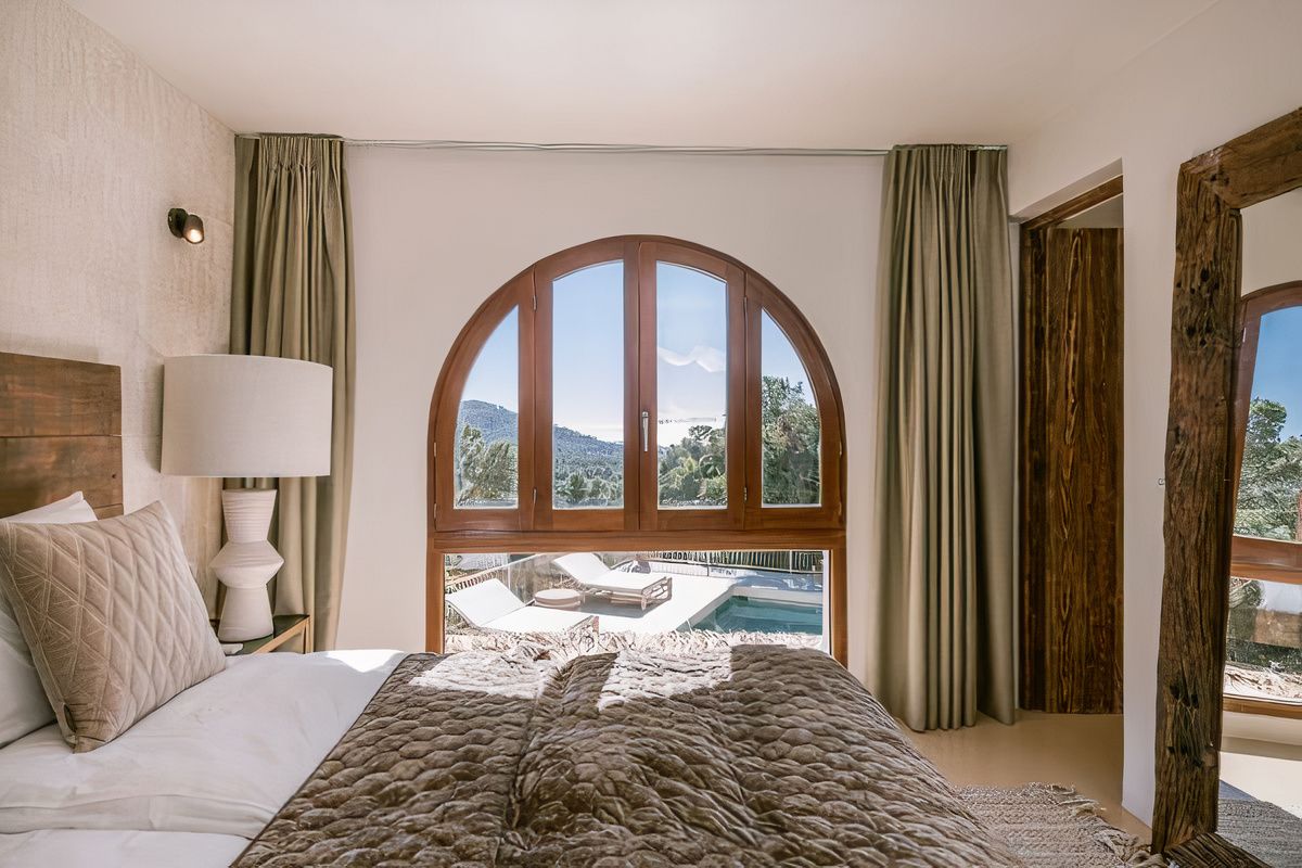 From the offset, this home impresses with its dreamy facade. Here, pearly white walls and honey-hued stone harmonise with elegant timber-framed windows and pretty verandas. Inside, the bohemian-chic decor oozes style, with earthy textures and sumptuous textiles ensuring a comfortable and inviting atmosphere. We love the open-plan kitchen and living area, with its exposed-beam ceilings, cosy fireplace and striking glass round table. Throughout, floor-to-ceiling windows usher sunlight to flood the space while offering panoramic views of the scenic surroundings. Start your days on the top-floor sun terrace, coffee cup in hand, gazing at sweeping verandas of Dalt Vila in Ibiza Old Town and Formentera out to sea.