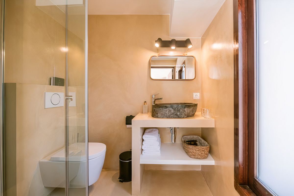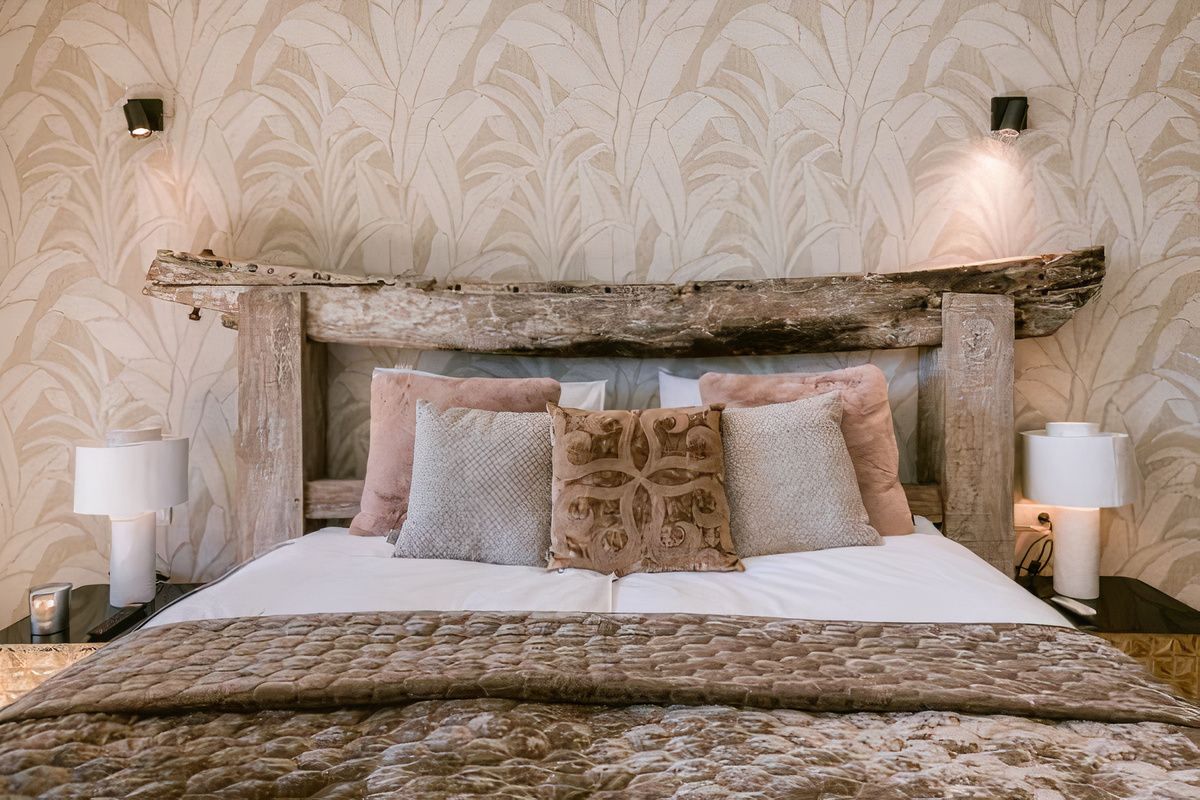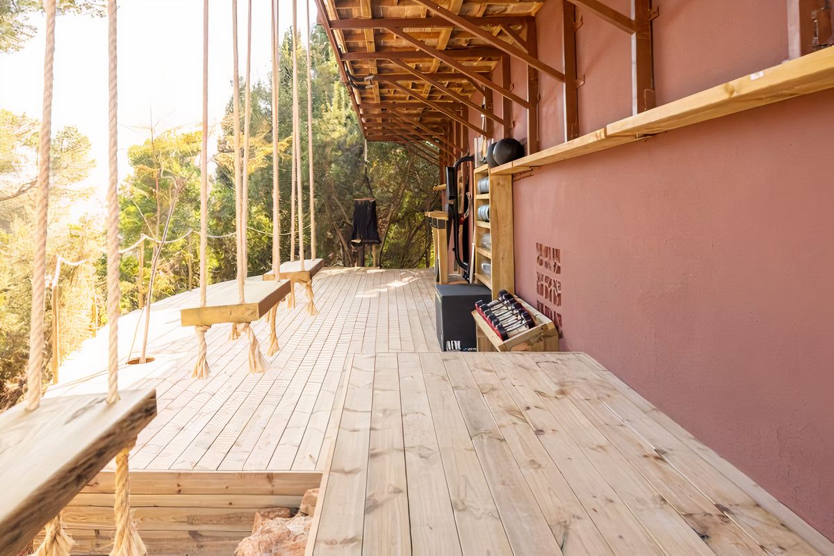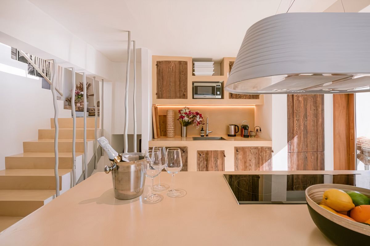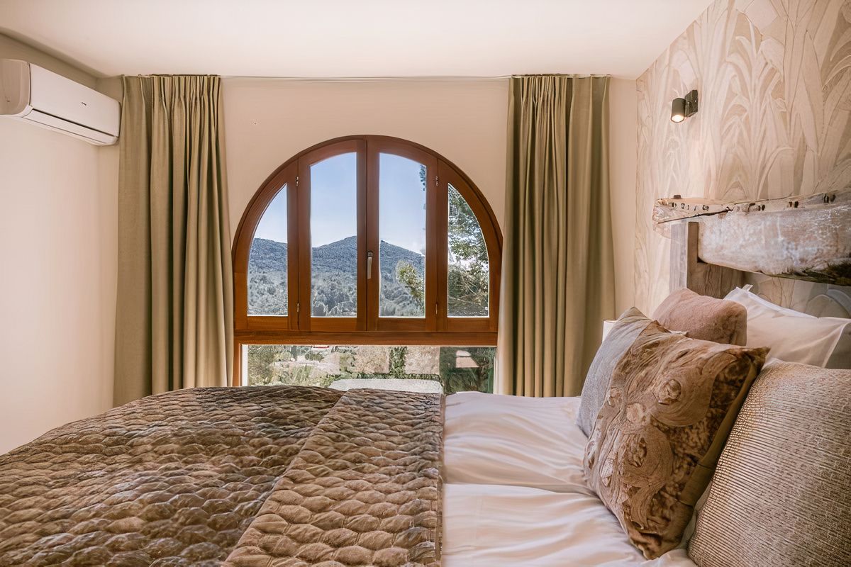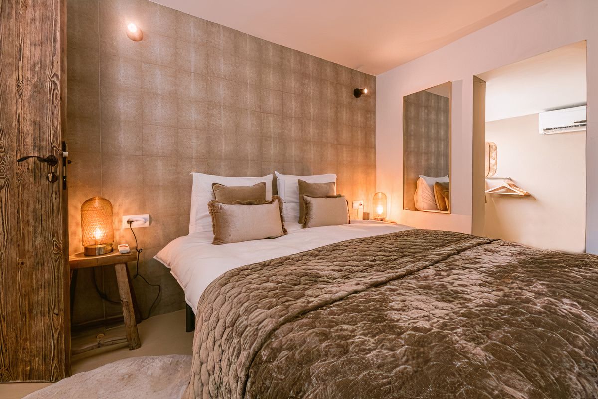 From the offset, this home impresses with its dreamy facade. Here, pearly white walls and honey-hued stone harmonise with elegant timber-framed windows and pretty verandas. Inside, the bohemian-chic decor oozes style, with earthy textures and sumptuous textiles ensuring a comfortable and inviting atmosphere. We love the open-plan kitchen and living area, with its exposed-beam ceilings, cosy fireplace and striking glass round table. Throughout, floor-to-ceiling windows usher sunlight to flood the space while offering panoramic views of the scenic surroundings. Start your days on the top-floor sun terrace, coffee cup in hand, gazing at sweeping verandas of Dalt Vila in Ibiza Old Town and Formentera out to sea.
