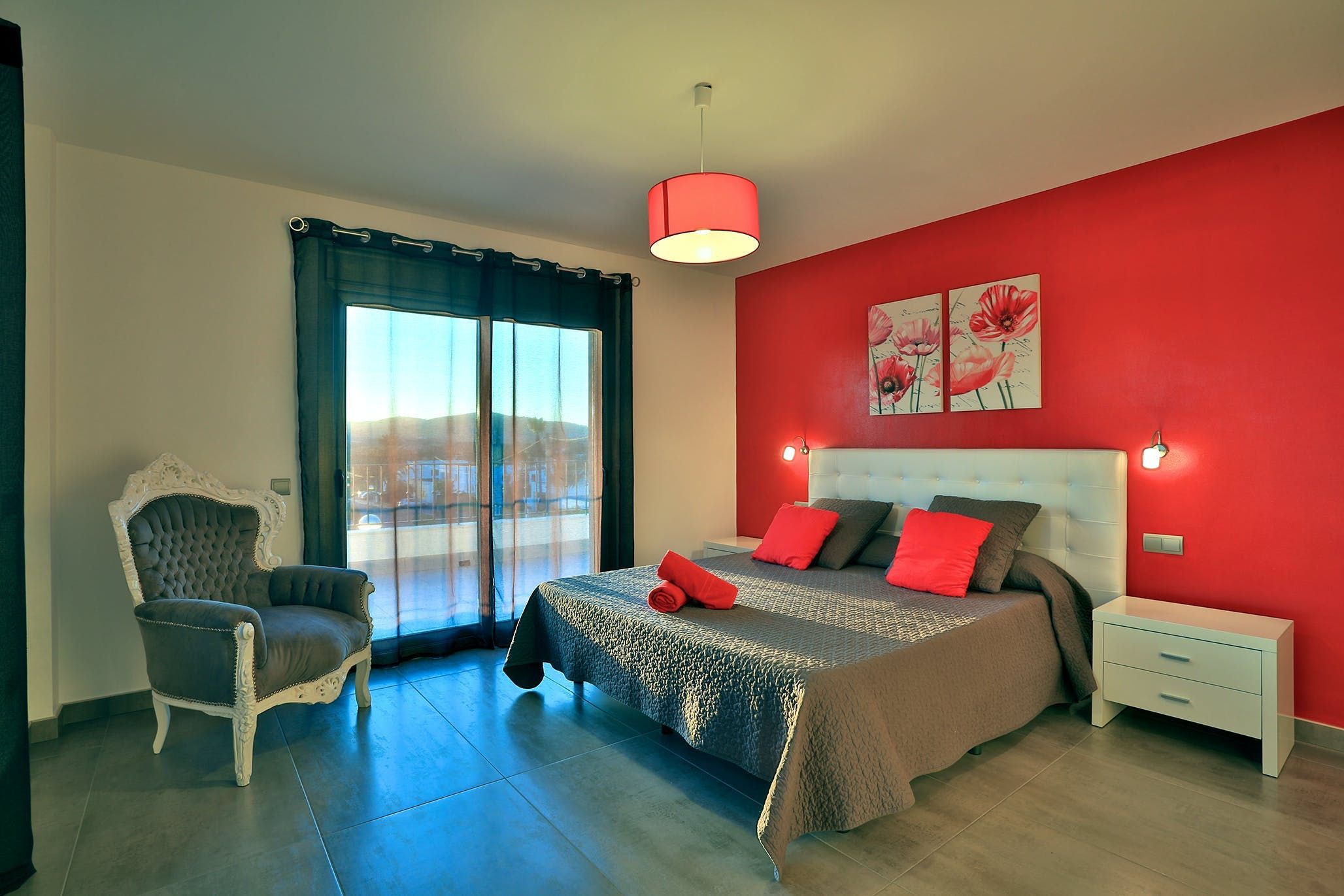 Inside the home, you’ll find a clutter-free living area – we loved the moody grey accent walls and convivial open-plan layout. On cooler afternoons, the plump leather couch is the perfect place to curl up with a glass of wine. If you’re keen to get out and explore, head into the heart of Ibiza town for the Portal de ses Taules, Dalt Vila and the Puget Museum. If a beach day is on the cards, make a beeline for Playa de Talamanca – it’s only a short car ride away.