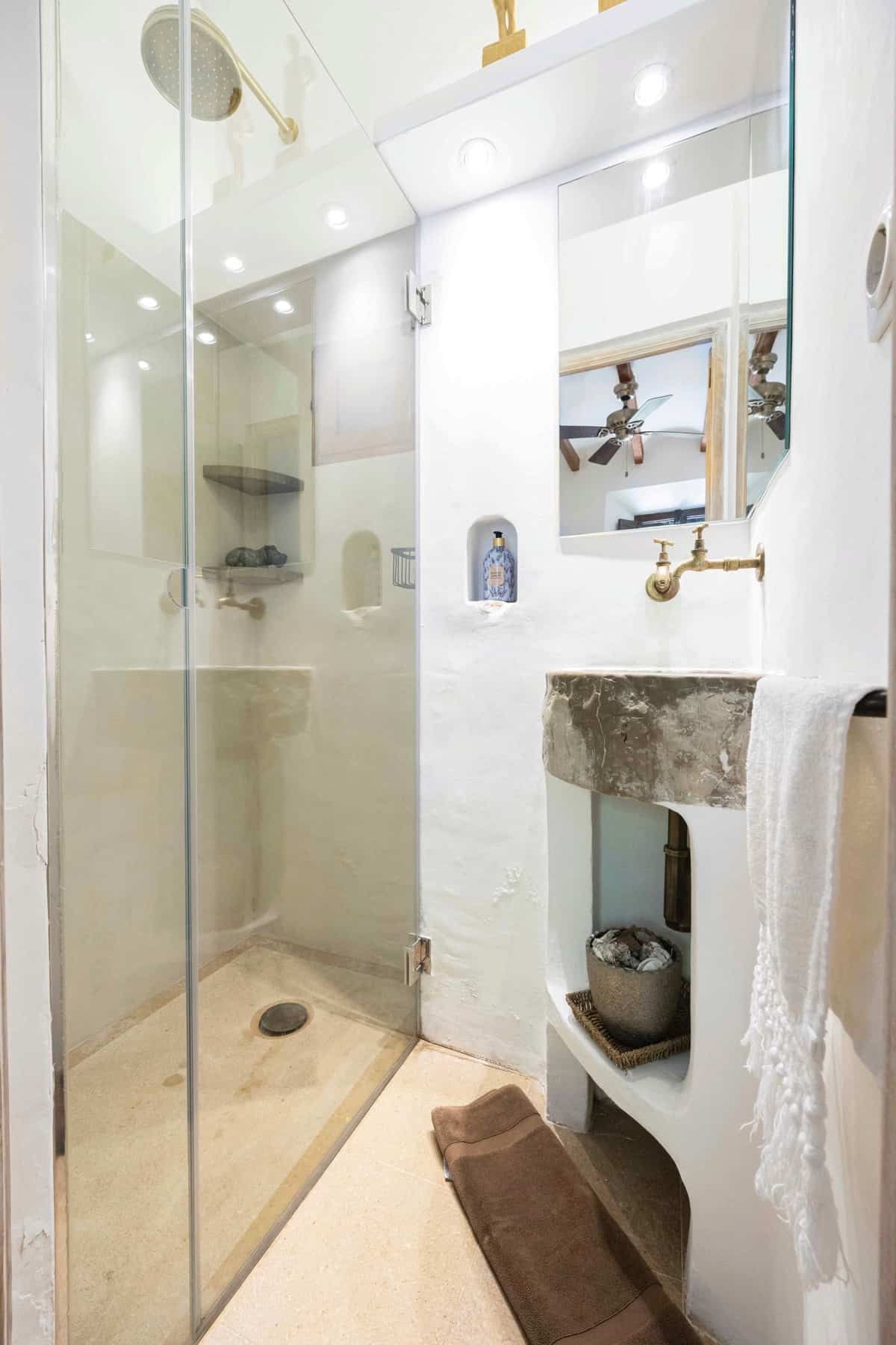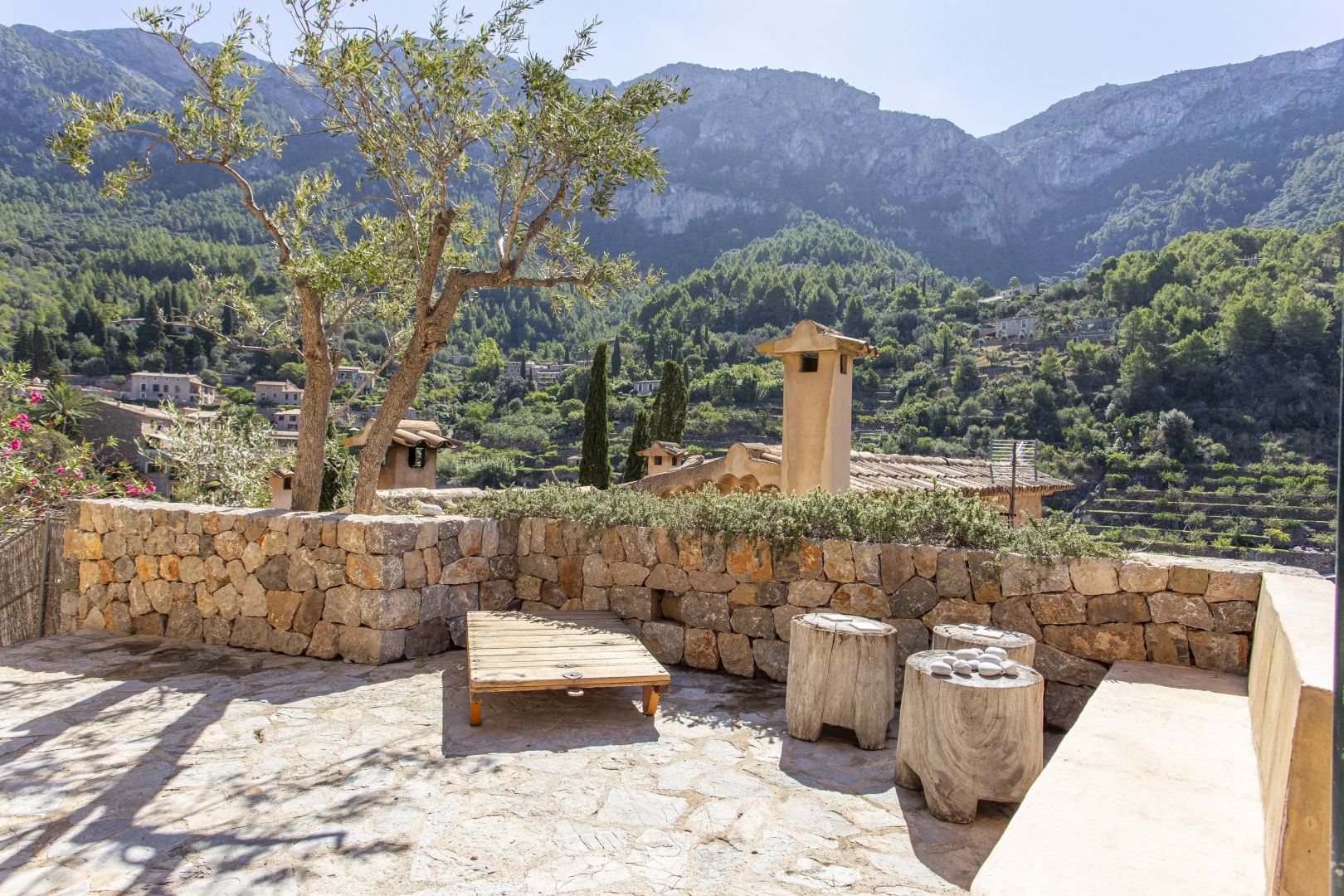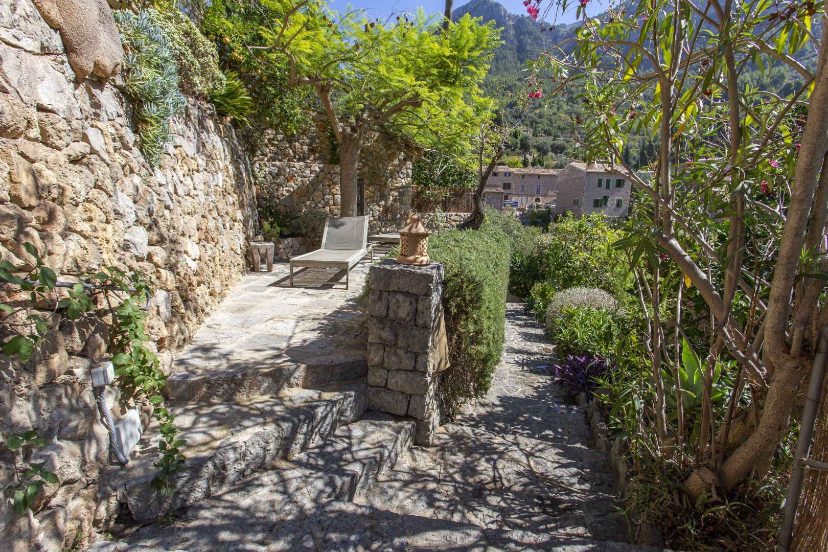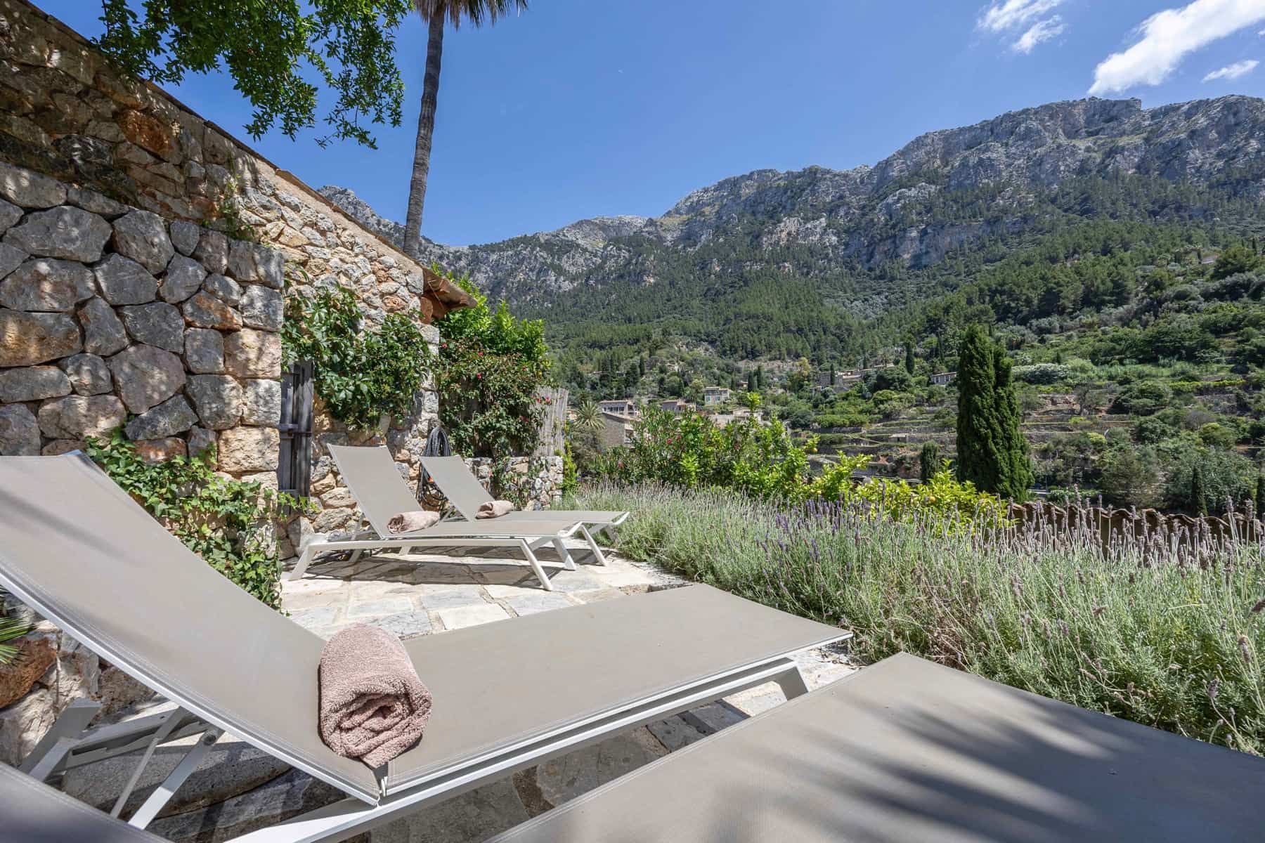 Unusually for buildings in Deia, this home has terraces that enjoy the sun from morning until evening, maximising your time to soak up the rays. There’s plenty of space for reading in the shade as well as for sun-worshippers. A covered dining set with a white stone bench is the perfect spot for alfresco meals and glasses of Spanish wine.