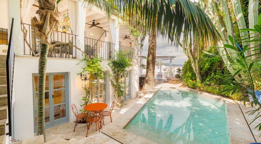 Tucked into the cobbled streets of Ibiza's old town, this gorgeous villa is a hidden gem with a lush Mediterranean garden and a private pool. Inside, the interiors are stylishly decadent. Think velvet sofas, light-filled spaces and colour-drenched bedrooms. French doors open to the terrace, with sweeping views of the old town and distant hills. Each bedroom is a sanctuary, spread across different levels for extra privacy. Wake to birdsong and take a dip before breakfast or watch the stars appear over dinner on the terrace. With cafes, galleries, and beaches just a short stroll away, this is Ibiza living at its dreamiest.