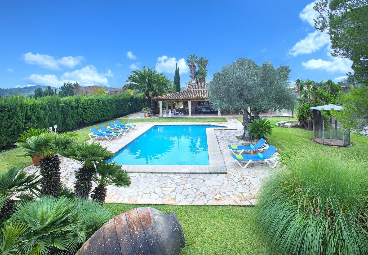 A true rural gem, this beautiful villa, nestled amidst green hills and palm groves of Northern Mallorca is the perfect island retreat for a family or a group of friends looking for that special place. While you’ll be able to enjoy the peace and tranquillity of this picturesque setting, you’ll also be just a short drive from the vibrant town of Pollença, with all its shops, restaurants and coastal activities.