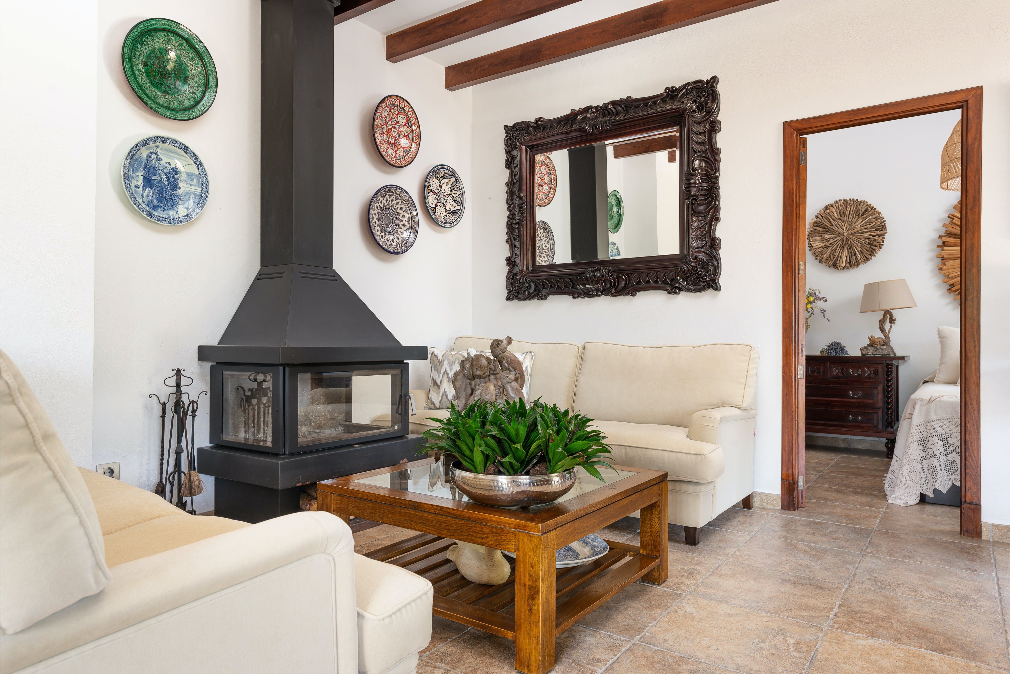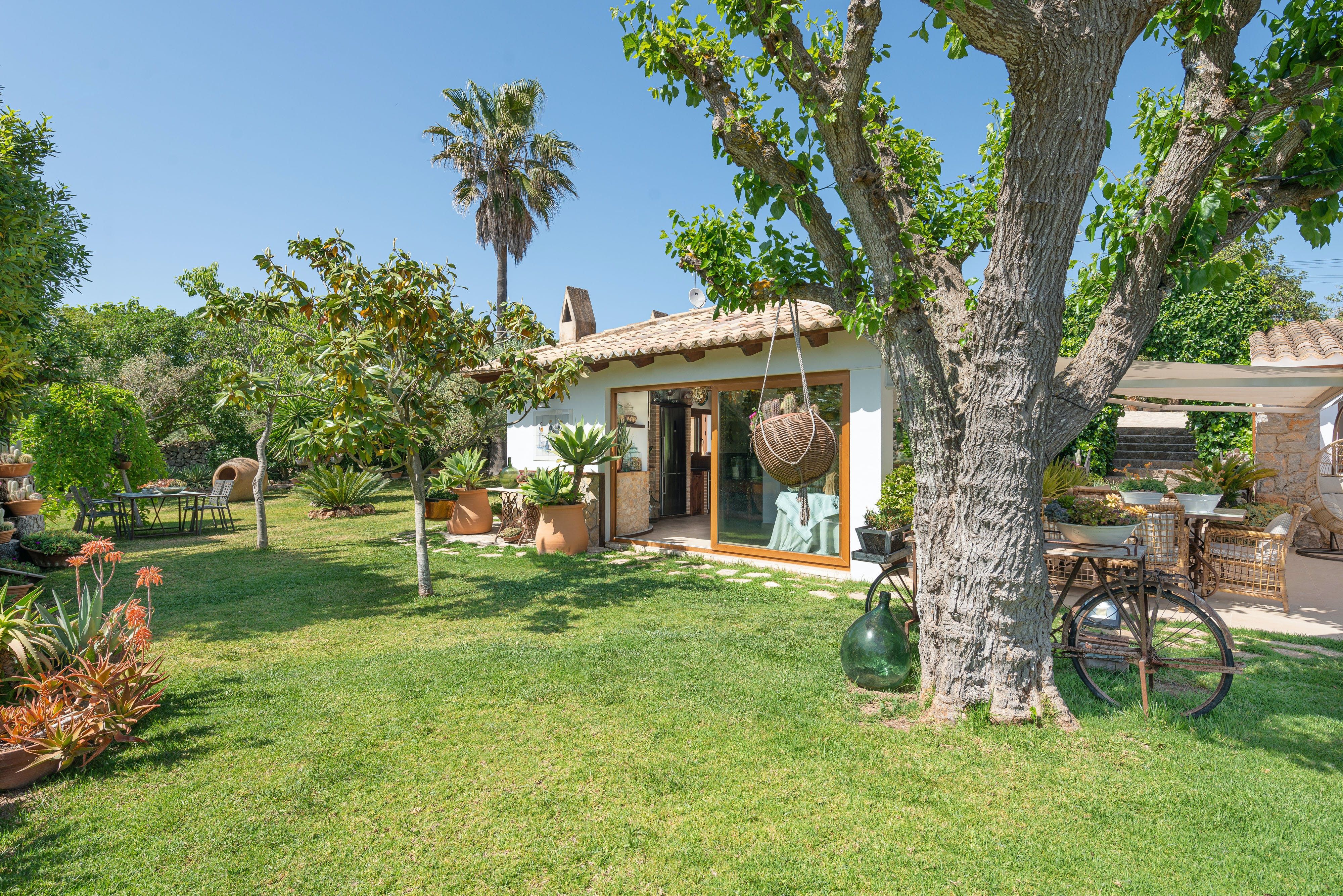 This home is truly a garden of earthly delights. Like its surroundings, the private, fenced grounds are verdant and fresh. Made up of three traditional stone buildings, your countryside finca dream will come to life. A saltwater pool is the centrepiece, while rocking chairs, wicker dining sets, and a hanging egg chair give you plenty of options for taking in the sun. Let the kids run wild around the garden, with the table football and swing set keeping them busy while you pick fresh oranges and almonds from the trees.