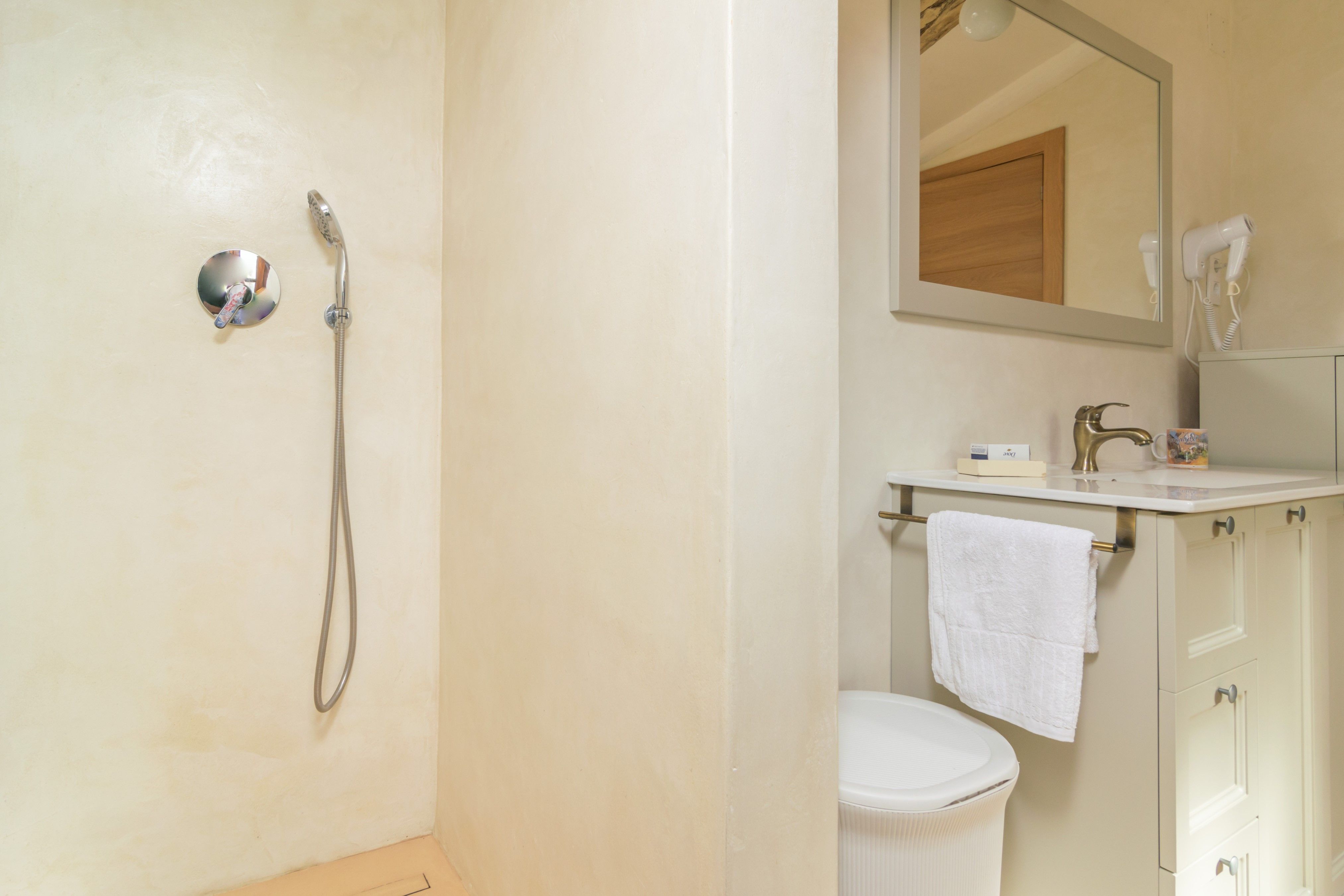The outside space took our breath away, with mountain views from every corner and a pristine swimming pool in the centre of the stone terrace. There are plenty of spots to enjoy a barbecue feast from the summer kitchen – the stone seats looking out over the ravine, the plush wicker chairs, or at the stone table beneath the ancient olive tree. Inside, crisp white walls and ink-black iron accents whisper of the old world and there’s a wood-burning stove at the centre of the living room. Books dotted throughout the home can provide an escape from the everyday, and there’s a flatscreen TV if binge-watching your favourite shows is more your thing.